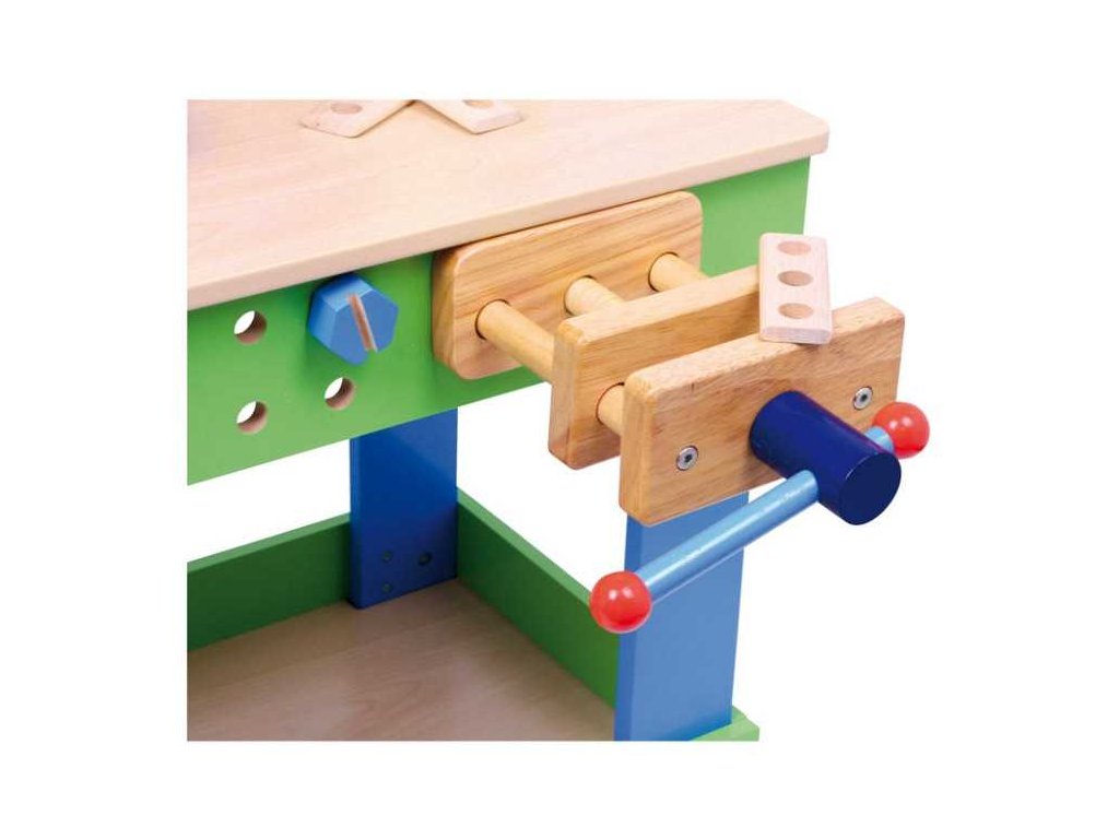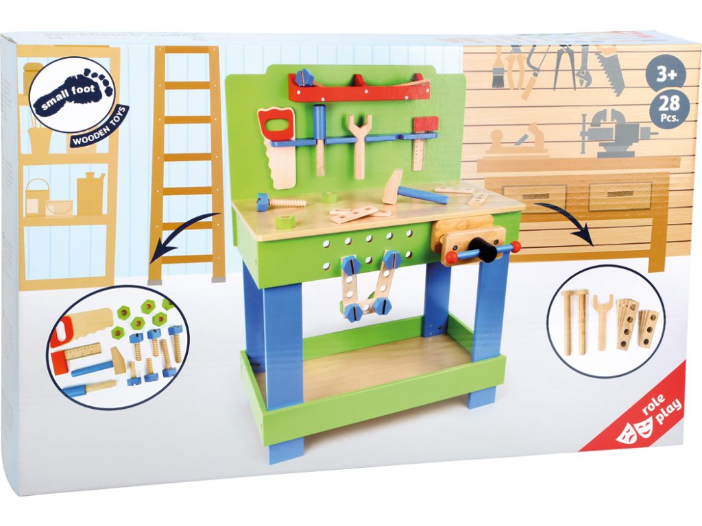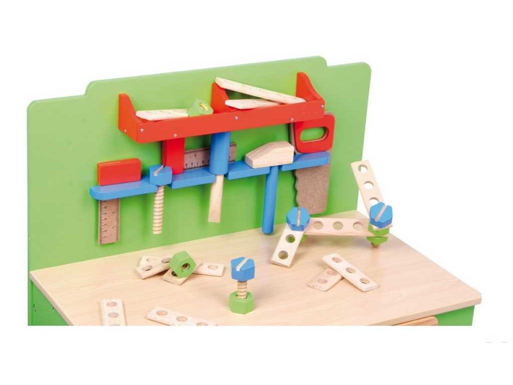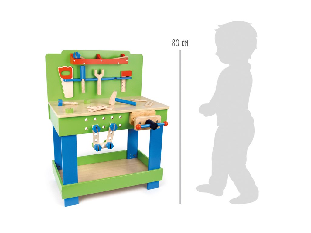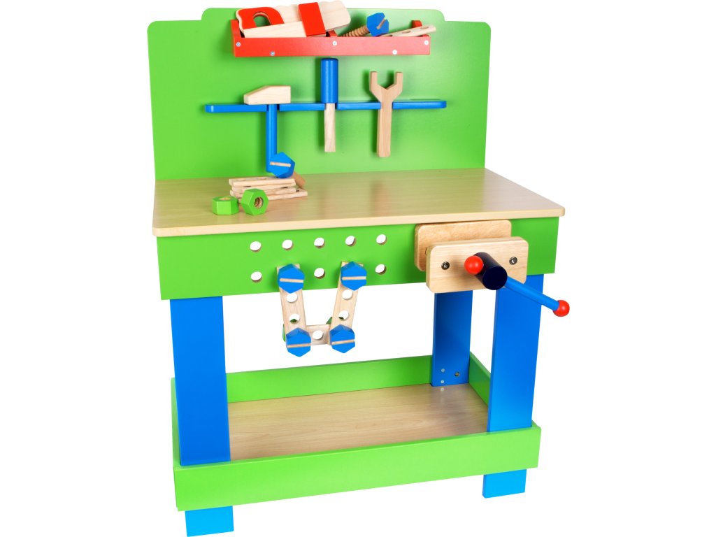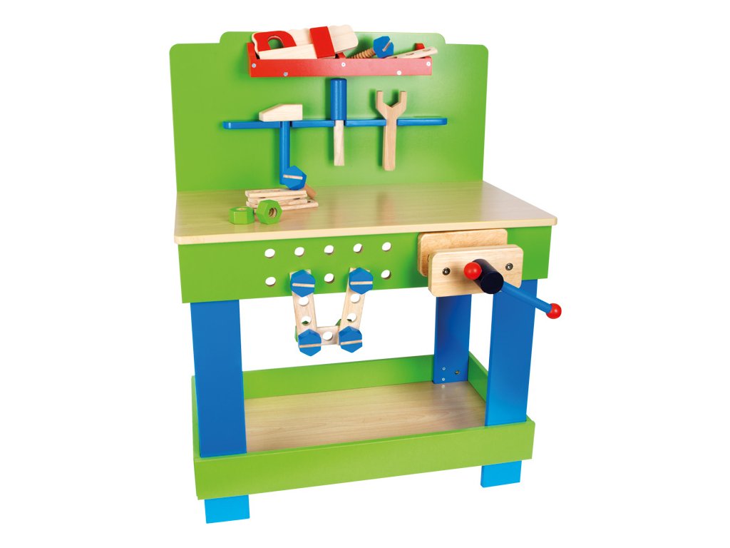 Malí řemeslníci si s tímto praktickým pracovním stolem rozvinou své jemné motorické dovednosti. S doplňky, jako jsou kladivo, šrouby, matice, šrouby a mnoho dalšího, se rozhodně nebudou nudit. Budou nadšeni tímto skvělým pracovním stolem s velkou pracovní plochou. Dětské ruce mohou trénovat jemnou motoriku při zatloukání, šroubování, měření a řezání. Pracovní stůl je pevně přišroubován a šroubová svorka drží obrobky. Je to jen malý krůček k práci s tatínkem nebo dědou v jejich hobby pokoji. Hlavní vlastnosti: dřevěný ponk včetně vybavenípodporuje kreativitu a představivostrozvíjí jemnou motoriku a zručnostinspiruje ke kreativní a představivé hře
