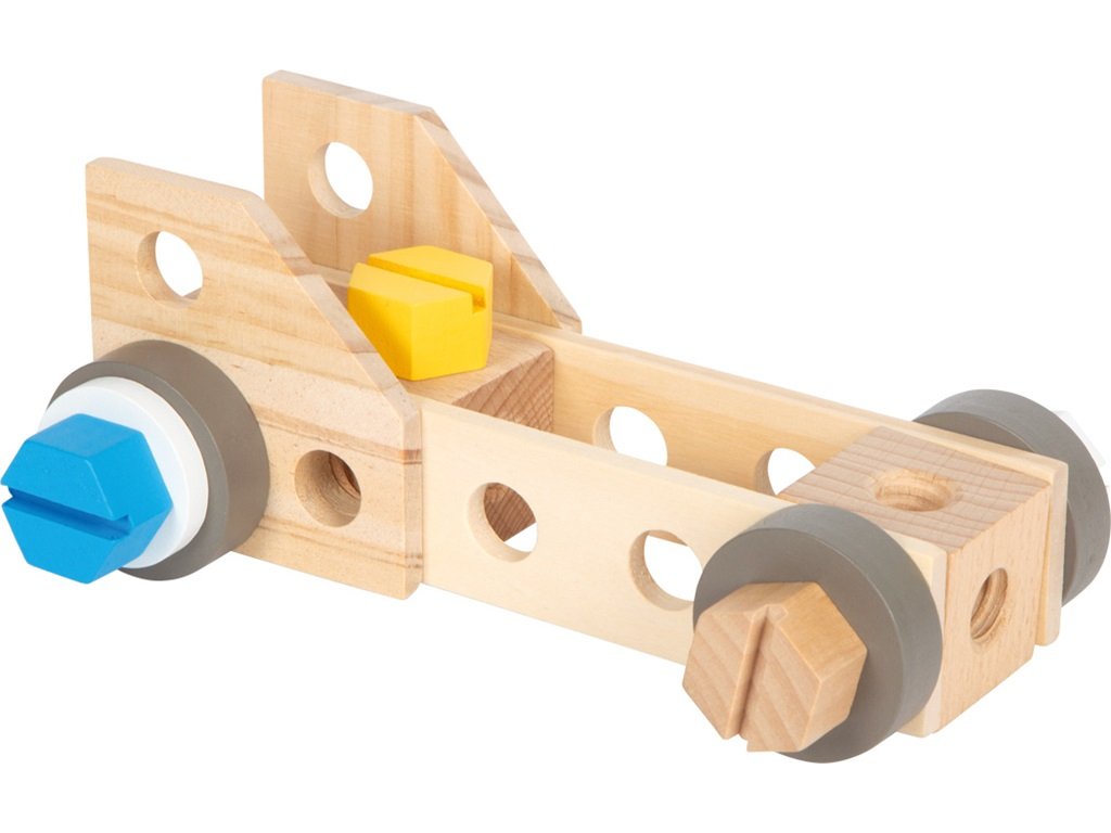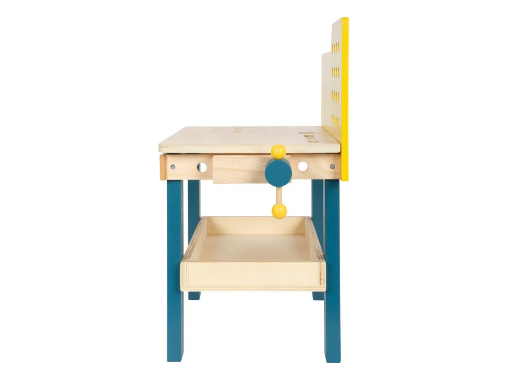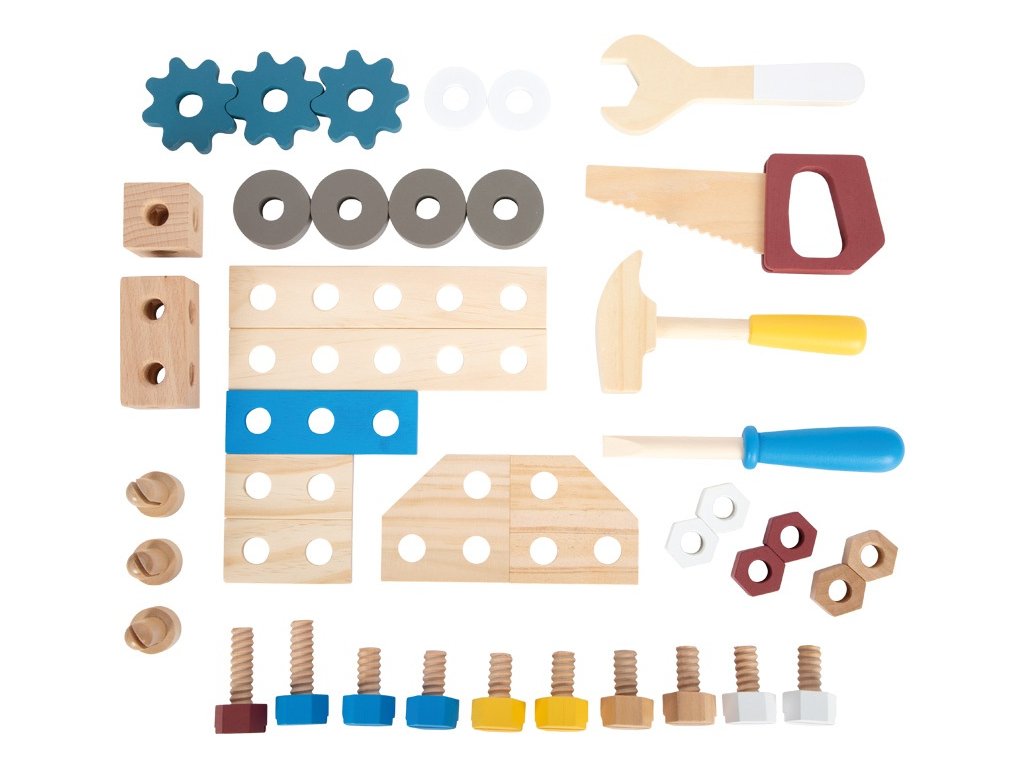 V dílně je pořád tolik práce! S tímto kompaktním pracovním stolem s integrovaným svěrákem a úložným prostorem mohou děti otestovat své šikovné ručičky při zatloukání, řezání a šroubovávání šroubů. Realisticky navržené příslušenství a nářadí včetně kladívka, klíče, šroubováku, svěráku a pilky přinášejí zábavu při hraní a motivují děti ke kreativitě a fantazii. Velké množství příslušenství sestávající ze šroubů, matic, ozubených kol, sady podložek a perforovaných destiček v různých tvarech a velikostech umožňuje dětem vytvořit si vlastní projekty nebo postavit malé závodní auto dle přiloženého návodu.Otvory na přední a zadní straně a také na pracovní desce lze použít k připevnění příslušenství k pracovnímu stolu pomocí šroubů. Hraním s nářadím a díky kutilství děti trénují motorické dovednosti a koordinaci ruka-oko, hravou formou se učí používat nástroje a získávají manuální zručnost. Sada obsahuje: pracovní stůl se svěrákem, kladívko, klíč, šroubovák, pilku, 2 velké perforované destičky, 1 střední perforovanou destičku, 2 malé perforované destičky, 2 perforované destičky ve tvaru diamantu, 2 čtvercové perforované destičky, 9 šroubů, 3 hřebíky, 6 matic, 3 ozubená kola, 2 tenké podložky a 4 silné podložky. Hlavní vlastnosti: učí děti používat nářadítrénuje jemnou a hrubou motorikurozvíjí koordinaci ruka-oko a manuální zručnostskvělý doplněk k dalším produktům řady Nordic a Miniwob Dokumentace: návod k sestavení (DE, EN, FR, IT, ES)návod k sestavení - auto