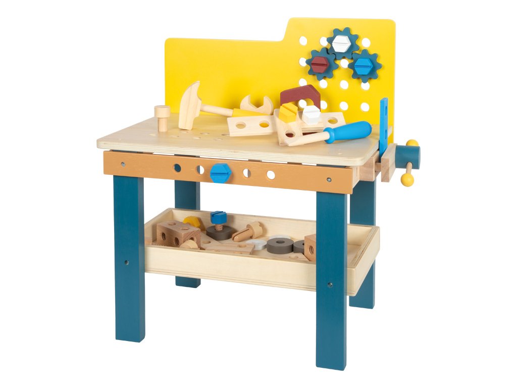 V dílně je pořád tolik práce! S tímto kompaktním pracovním stolem s integrovaným svěrákem a úložným prostorem mohou děti otestovat své šikovné ručičky při zatloukání, řezání a šroubovávání šroubů. Realisticky navržené příslušenství a nářadí včetně kladívka, klíče, šroubováku, svěráku a pilky přinášejí zábavu při hraní a motivují děti ke kreativitě a fantazii. Velké množství příslušenství sestávající ze šroubů, matic, ozubených kol, sady podložek a perforovaných destiček v různých tvarech a velikostech umožňuje dětem vytvořit si vlastní projekty nebo postavit malé závodní auto dle přiloženého návodu.Otvory na přední a zadní straně a také na pracovní desce lze použít k připevnění příslušenství k pracovnímu stolu pomocí šroubů. Hraním s nářadím a díky kutilství děti trénují motorické dovednosti a koordinaci ruka-oko, hravou formou se učí používat nástroje a získávají manuální zručnost. Sada obsahuje: pracovní stůl se svěrákem, kladívko, klíč, šroubovák, pilku, 2 velké perforované destičky, 1 střední perforovanou destičku, 2 malé perforované destičky, 2 perforované destičky ve tvaru diamantu, 2 čtvercové perforované destičky, 9 šroubů, 3 hřebíky, 6 matic, 3 ozubená kola, 2 tenké podložky a 4 silné podložky. Hlavní vlastnosti: učí děti používat nářadítrénuje jemnou a hrubou motorikurozvíjí koordinaci ruka-oko a manuální zručnostskvělý doplněk k dalším produktům řady Nordic a Miniwob Dokumentace: návod k sestavení (DE, EN, FR, IT, ES)návod k sestavení - auto