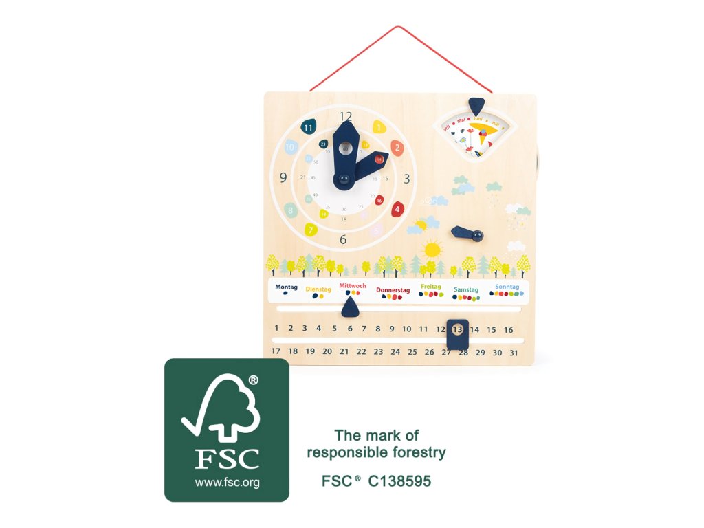Podporují děti v učení se času ve 12 a 24 hodinovém systému. Současně zprostředkovávají znalosti o počasí, dnech v týdnu, měsících a ročních obdobích hravým způsobem pomocí jednoduchých ilustrací. Při nastavování ručiček jsou současně trénovány motorické dovednosti. Se závěsným zařízením a nálepkami, pro použití v 15 evropských jazycích: CZ, DE, DK, EN, ES, FI, FR, GR, IT, NL, NO, PL, PT, RU, SE. Hlavní vlastnosti: procvičuje motorické schopnostipoužití v 15 evropských jazycíchučí poznávat čas a datumvyrobeno z 100% FSC dřeva Značka a certifikát FSC® (Forest Stewardship Council) zaručuje, že dřevo, ze kterého byl produkt vyroben, nebylo vytěženo nelegálně a pochází z lesů obhospodařovaných šetrným či přírodě blízkým způsobem, ve kterém jsou dodržovány přísné environmentální a sociální požadavky. Značka FSC® na výrobku znamená, že svým nákupem pomáháte chránit lesy a podporujete šetrné, odpovědné či přírodě blízké hospodaření, díky kterému jsou naše lesy stabilnější, zdravější, mají přirozenou druhovou skladbu a lépe odolávají negativním následkům klimatických změn.