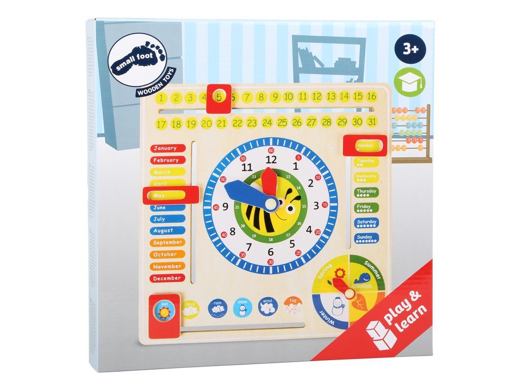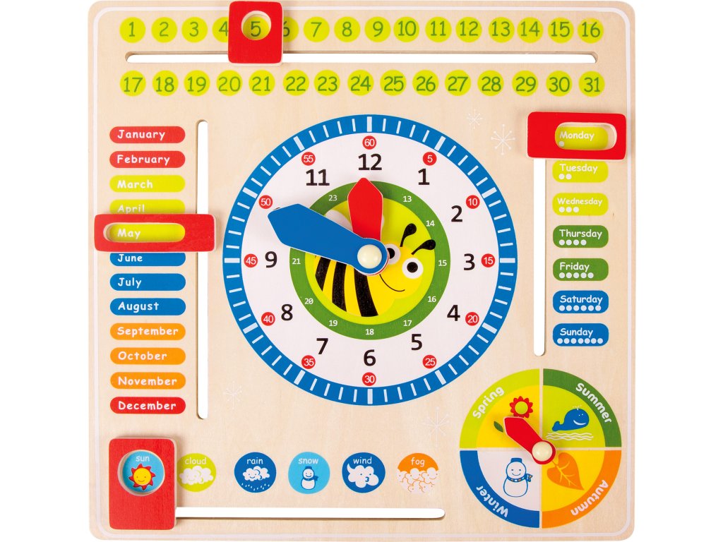 Díky tomuto didaktickému kalendáři mohou děti hravou formou poznávat roční období, dny, týdny, měsíce a čas. Podporují děti v učení se času ve 12 a 24 hodinovém formátu. Při nastavování ručiček jsou současně trénovány motorické dovednosti. A protože jsou všechny termíny uvedeny v angličtině, je snadné učit se nový jazyk. Hlavní vlastnosti: procvičuje motorické schopnostiučí poznávat čas a datumpomáhá učit anglický jazyk
