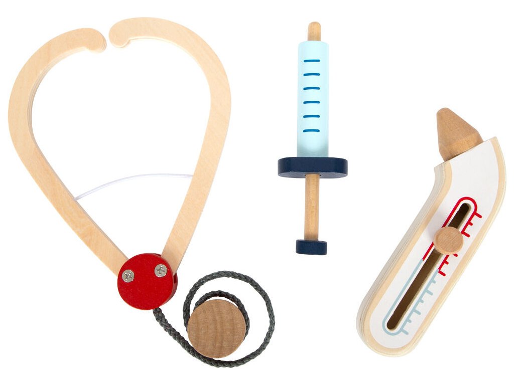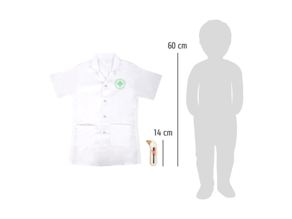 Kompletní hrací sada s lékařským plášťem a zdravotnickým vybavením. Najdete zde injekční stříkačku, stetoskop a teploměr z robustního dřeva. Píst stříkačky se po stlačení zatáhne. Teploměr má nastavitelný ukazatel teploty. Lékařský plášť má dvě praktické kapsy, zapíná se na patentky, takže si jej mohou mladí medici rychle obléct i svléct. Ideální hračka pro hraní na role nebo jako kostým na karneval. Vhodné pro děti, které jsou vysoké 105-110 cm (vel. 110). Ideální doplněk k doktorské brašně a dalším podobným produktům. Hlavní vlastnosti: lékařský plášť a další doplňkypro děti vysoké 105-110 cmperfektní pro hraní na role nebo na karneval
