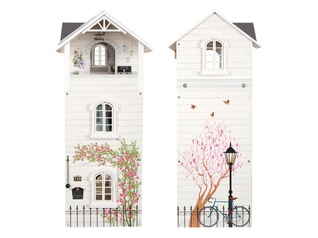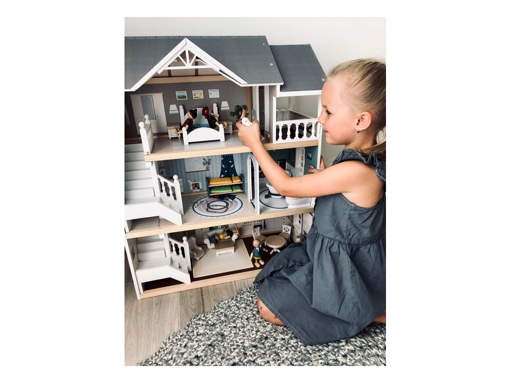 Velký, stabilní dřevěný domeček pro panenky zaujme svým detailním designem jak uvnitř, tak z vnějšku. Díky otevřené přední straně je ideální pro společnou hru více dětí, které si mohou snadno hrát zároveň.Domeček má tři podlaží propojená schodištěm a nabízí celkem pět prostorných místností – jídelnu s obývacím pokojem, dětský pokoj, koupelnu, ložnici a lodžii, které poskytují dostatek prostoru pro kreativní hraní a vytváření vlastních příběhů.Součástí je 12 kusů nábytku a různé doplňky s dřevěnými i plastovými detaily, které zajišťují realistickou a zábavnou hru. Nechybí ani schody, posuvné dveře, otevíratelná okna, noční stolky se zásuvkami a dokonce i funkční zvonek, který oznamuje příchod návštěvy – všechny tyto prvky dodávají domečku autentičnost a podporují dětskou představivost.Výrobek vyžaduje montáž, která je snadná díky detailnímu návodu k sestavení. Tento krásný domeček se tak stane nejen oblíbeným herním centrem, ale i působivým doplňkem dětského pokoje. Hlavní vlastnosti: díky světlé vnější fasádě a modernímu designu se vila hodí do jakéhokoliv dětského či obývacího pokojedostatečně velký pro společnou hru více dětífunkční zvonek a prvky nábytkuobsahuje 12 ks nábytku s doplňkyvhodné pro panenky do velikosti 12 cm Ocenění hračky: Top 10 Spielzeug Nominiert 2021