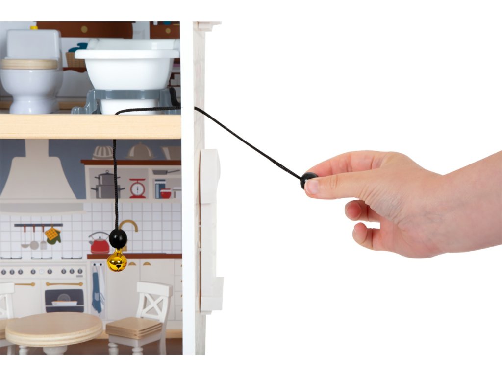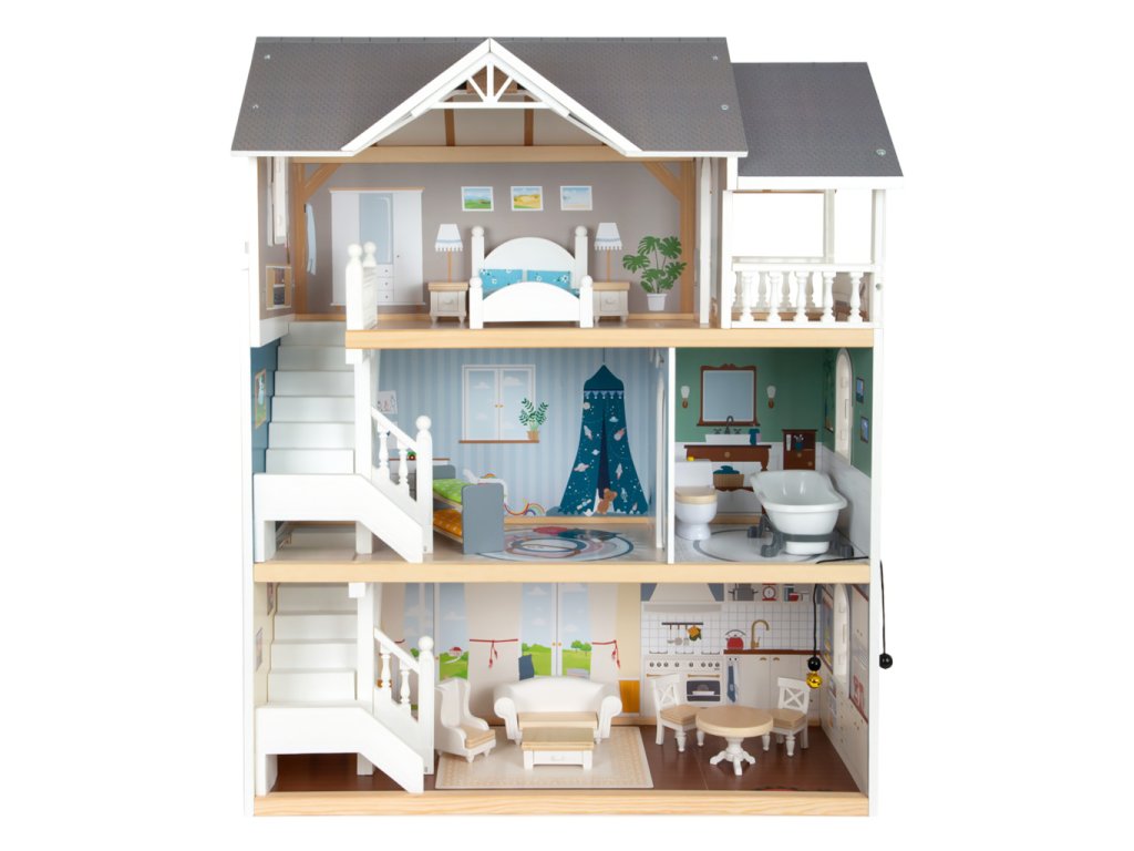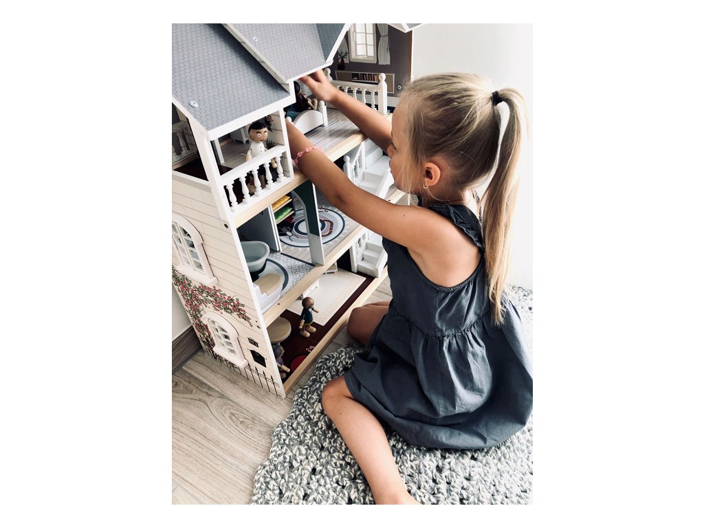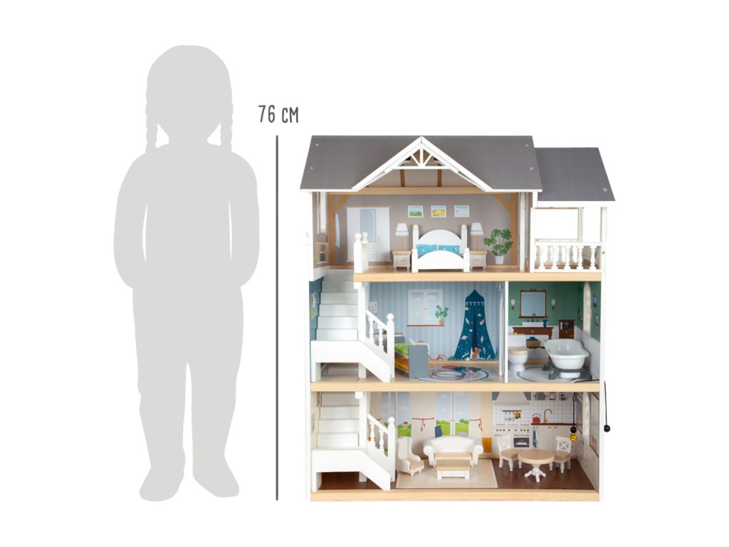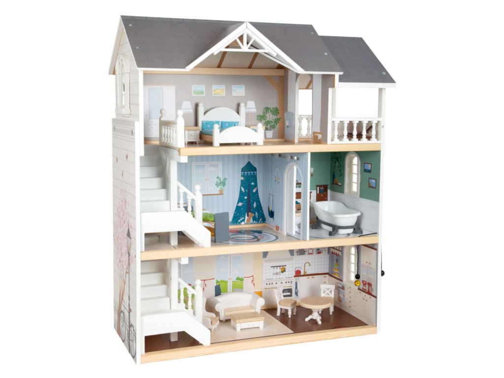 Velký, stabilní dřevěný domeček pro panenky zaujme svým detailním designem jak uvnitř, tak z vnějšku. Díky otevřené přední straně je ideální pro společnou hru více dětí, které si mohou snadno hrát zároveň.Domeček má tři podlaží propojená schodištěm a nabízí celkem pět prostorných místností – jídelnu s obývacím pokojem, dětský pokoj, koupelnu, ložnici a lodžii, které poskytují dostatek prostoru pro kreativní hraní a vytváření vlastních příběhů.Součástí je 12 kusů nábytku a různé doplňky s dřevěnými i plastovými detaily, které zajišťují realistickou a zábavnou hru. Nechybí ani schody, posuvné dveře, otevíratelná okna, noční stolky se zásuvkami a dokonce i funkční zvonek, který oznamuje příchod návštěvy – všechny tyto prvky dodávají domečku autentičnost a podporují dětskou představivost.Výrobek vyžaduje montáž, která je snadná díky detailnímu návodu k sestavení. Tento krásný domeček se tak stane nejen oblíbeným herním centrem, ale i působivým doplňkem dětského pokoje. Hlavní vlastnosti: díky světlé vnější fasádě a modernímu designu se vila hodí do jakéhokoliv dětského či obývacího pokojedostatečně velký pro společnou hru více dětífunkční zvonek a prvky nábytkuobsahuje 12 ks nábytku s doplňkyvhodné pro panenky do velikosti 12 cm Ocenění hračky: Top 10 Spielzeug Nominiert 2021