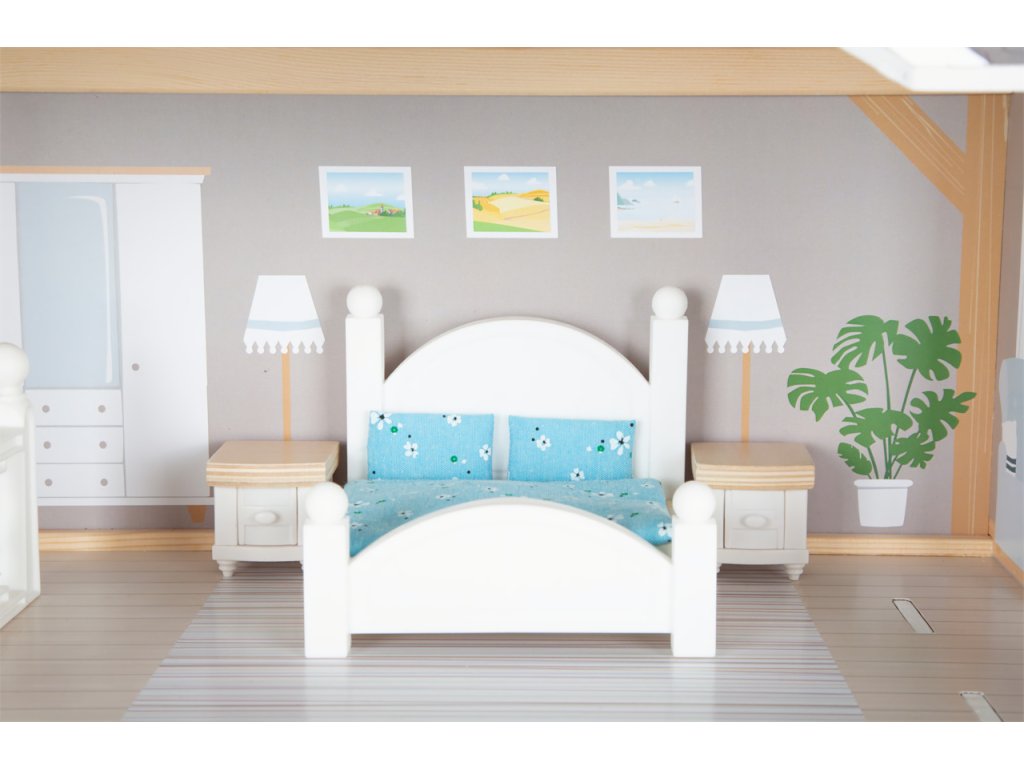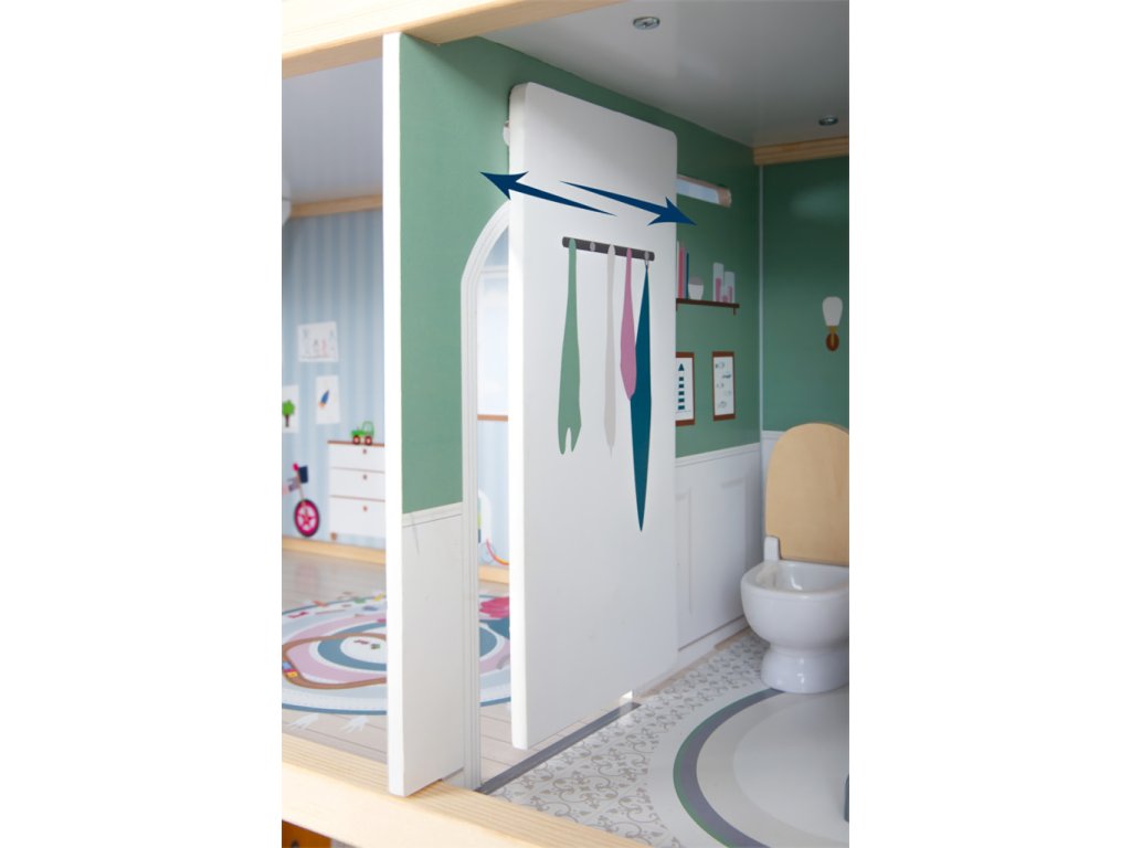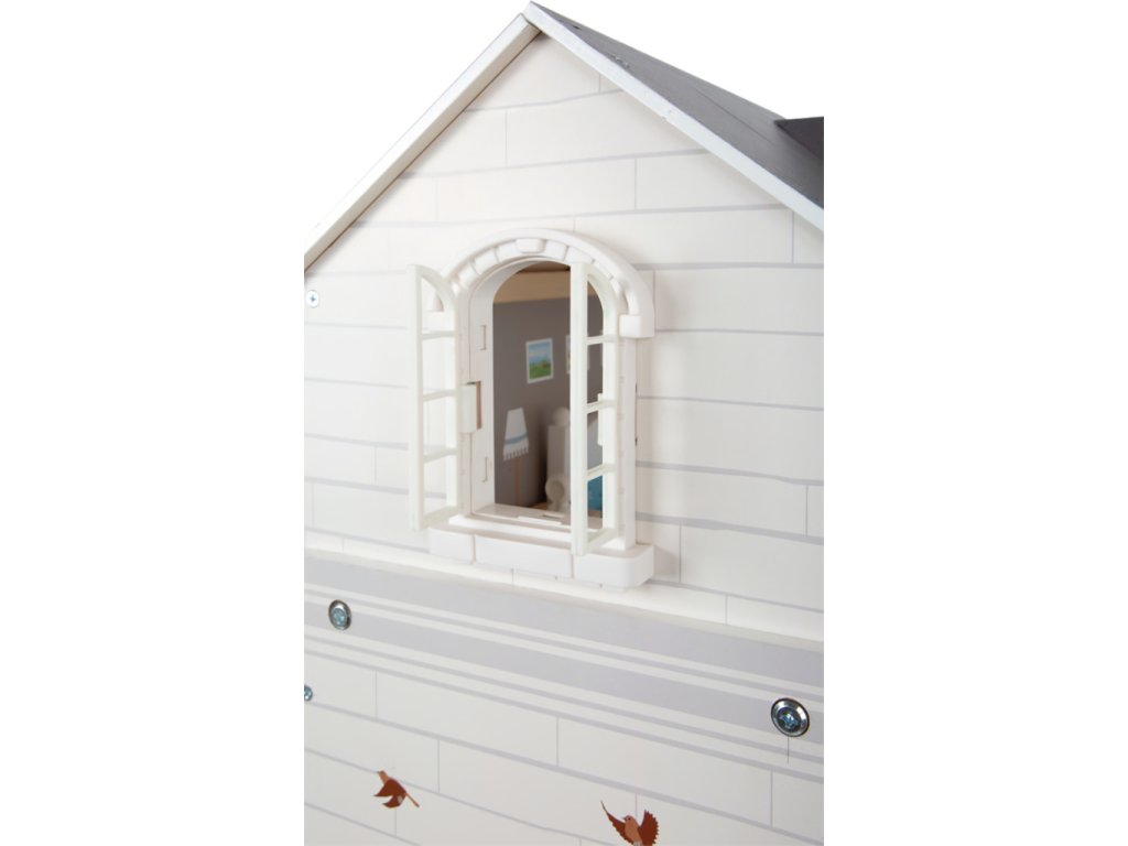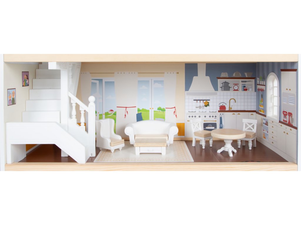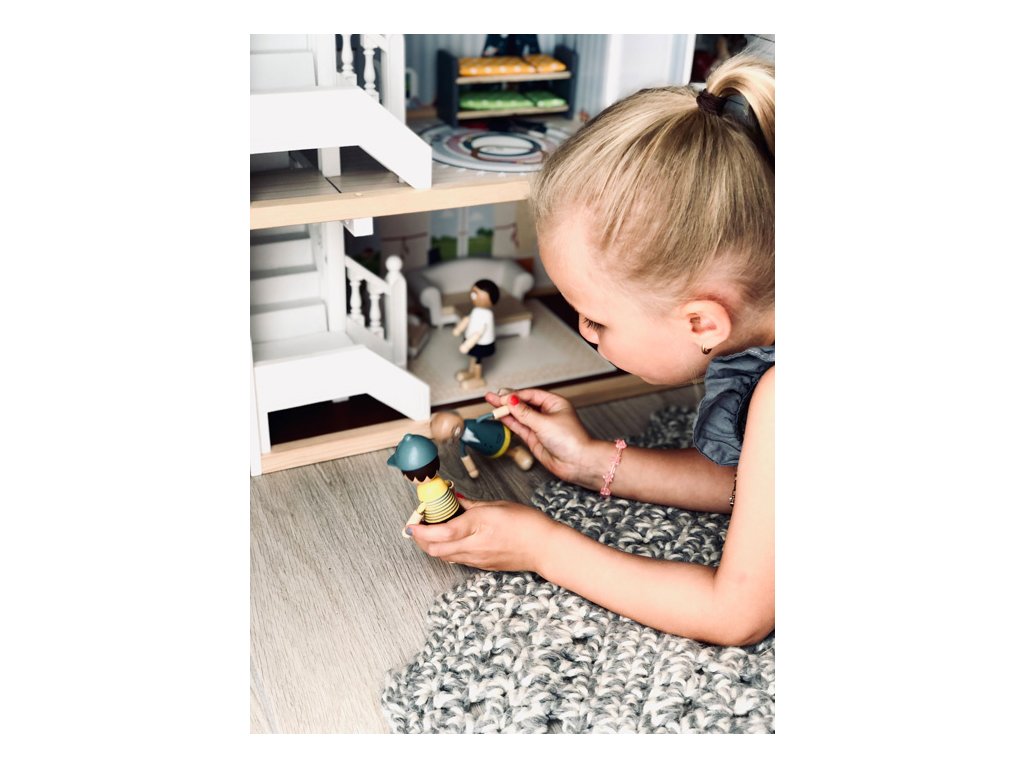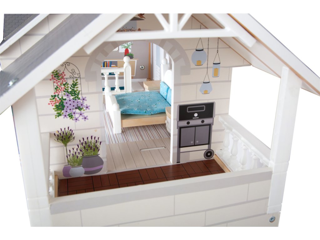 Velký, stabilní dřevěný domeček pro panenky zaujme svým detailním designem jak uvnitř, tak z vnějšku. Díky otevřené přední straně je ideální pro společnou hru více dětí, které si mohou snadno hrát zároveň.Domeček má tři podlaží propojená schodištěm a nabízí celkem pět prostorných místností – jídelnu s obývacím pokojem, dětský pokoj, koupelnu, ložnici a lodžii, které poskytují dostatek prostoru pro kreativní hraní a vytváření vlastních příběhů.Součástí je 12 kusů nábytku a různé doplňky s dřevěnými i plastovými detaily, které zajišťují realistickou a zábavnou hru. Nechybí ani schody, posuvné dveře, otevíratelná okna, noční stolky se zásuvkami a dokonce i funkční zvonek, který oznamuje příchod návštěvy – všechny tyto prvky dodávají domečku autentičnost a podporují dětskou představivost.Výrobek vyžaduje montáž, která je snadná díky detailnímu návodu k sestavení. Tento krásný domeček se tak stane nejen oblíbeným herním centrem, ale i působivým doplňkem dětského pokoje. Hlavní vlastnosti: díky světlé vnější fasádě a modernímu designu se vila hodí do jakéhokoliv dětského či obývacího pokojedostatečně velký pro společnou hru více dětífunkční zvonek a prvky nábytkuobsahuje 12 ks nábytku s doplňkyvhodné pro panenky do velikosti 12 cm Ocenění hračky: Top 10 Spielzeug Nominiert 2021