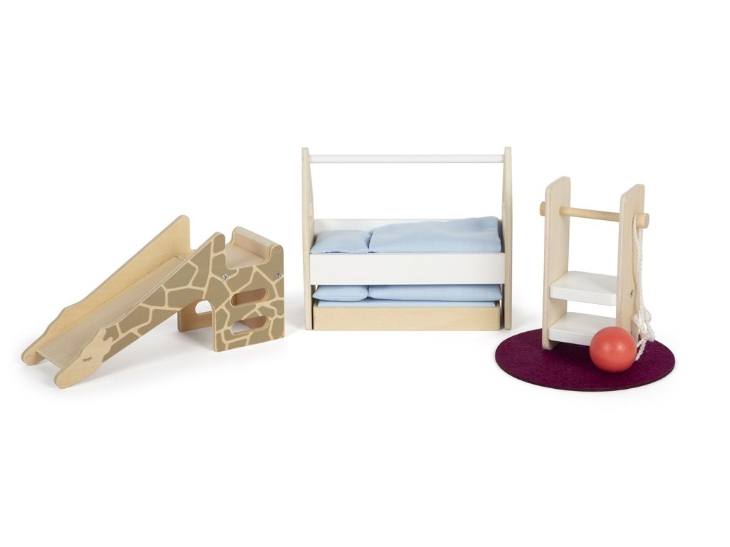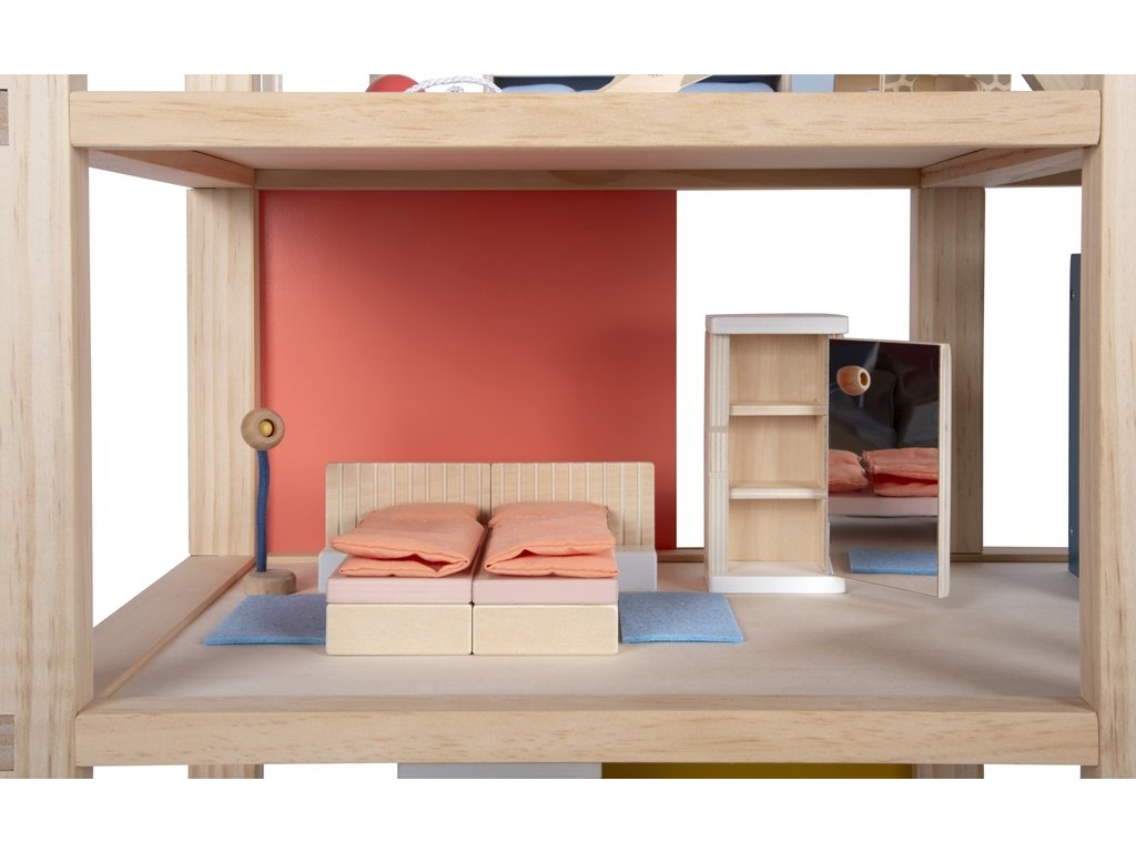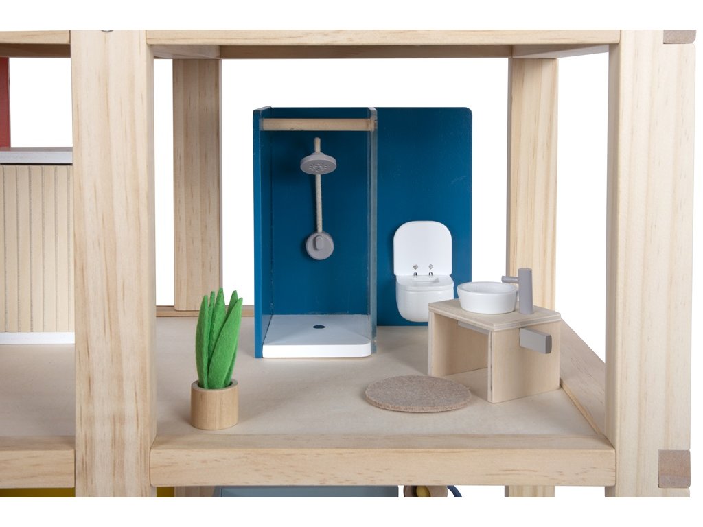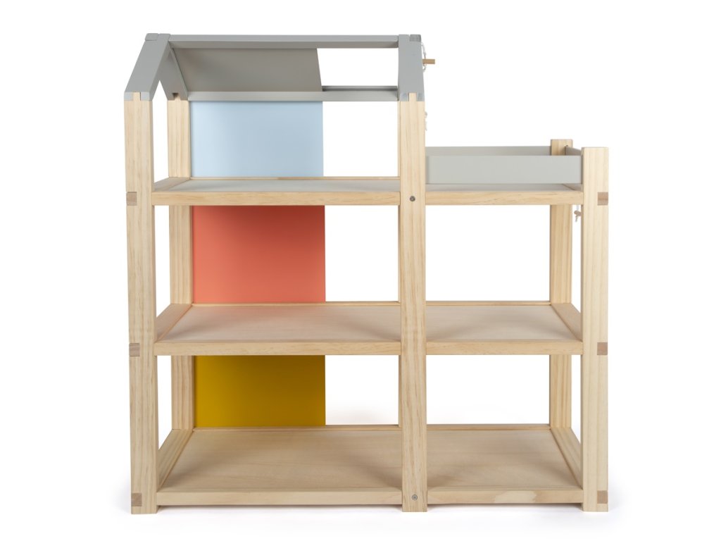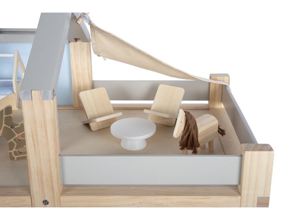 Tento velký dřevěný domeček pro panenky ve skandinávském stylu se třemi podlažími a prostornou střešní terasou se stane nejen zábavnou a kreativní hračkou, ale také interiérovým doplňkem, který se bude vyjímat v každém pokojíčku. Domeček má tři podlaží. Skládá se z útulné ložnice, dětského pokoje se žirafí skluzavkou, stylové koupelny, moderní kuchyně, okouzlující jídelny, útulného obývacího pokoje, prostorné střešní terasy a je kompletně zařízen detailně propracovaným nábytkem pro panenky. Díky posuvným zadním stěnám je možné znovu a znovu měnit vzhled interiéru. Stěny jsou totiž oboustranně použitelné, z jedné strany mají vzhled přírodního dřeva, z druhé strany jsou opatřeny barevným nátěrem. Domeček je ihned připraven ke hře – není už potřeba žádné další příslušenství. Hlavní vlastnosti: pro panenky 12 cmprostorné pokoje a velká střešní terasaplně vybaven nábytkemotevřená přední stěna usnadňuje hruzábavná a kreativní hračkavkusný interiérový doplněkpodporuje kreativitu a zlepšuje prostorové vnímánípodporuje rozvoj motorických, řečových a sociálních dovedností