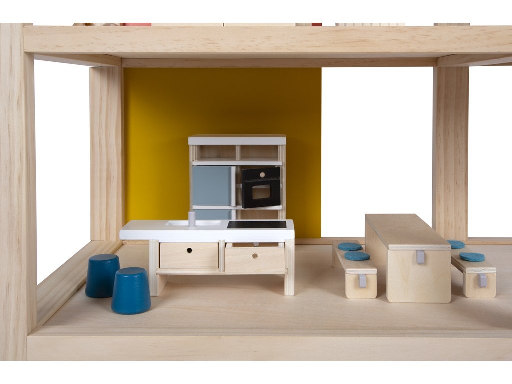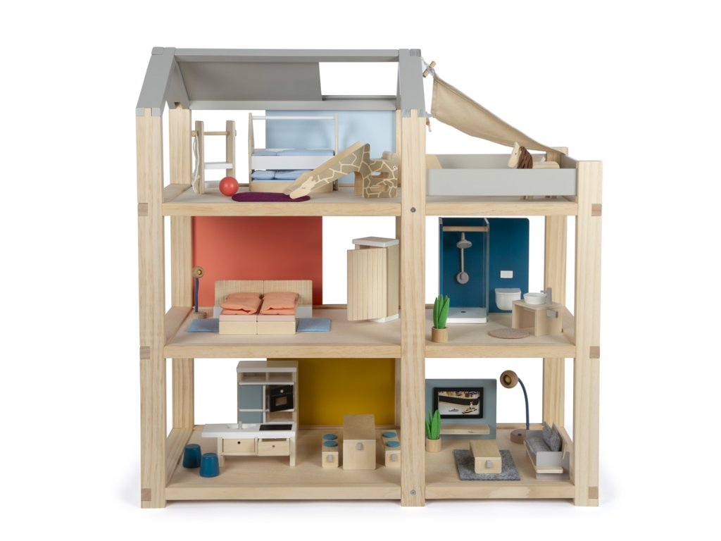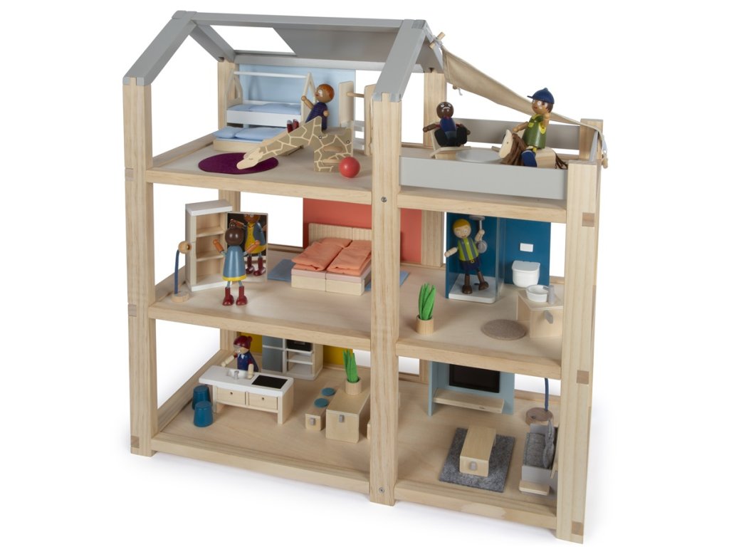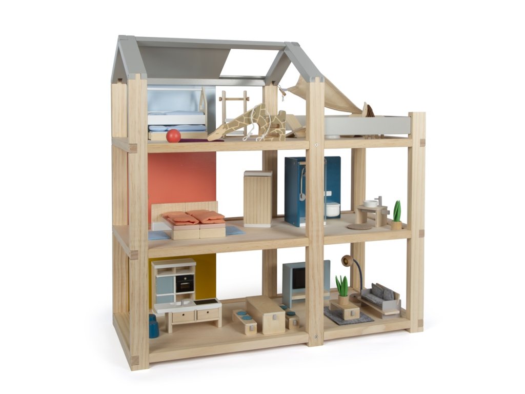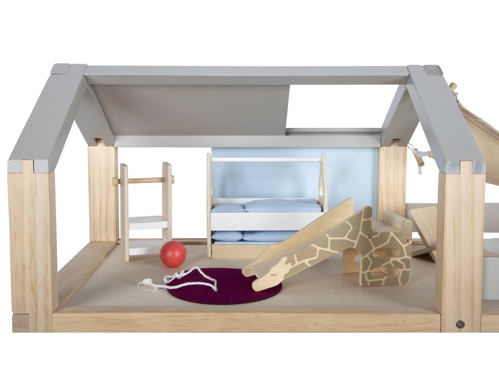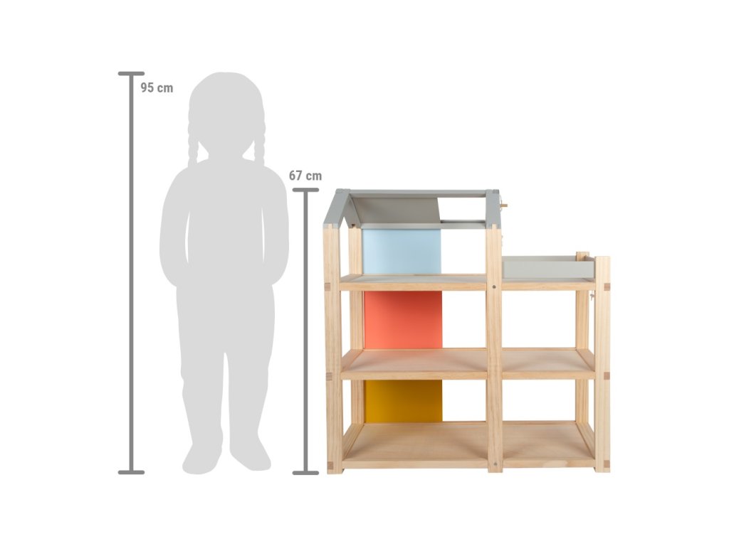 Tento velký dřevěný domeček pro panenky ve skandinávském stylu se třemi podlažími a prostornou střešní terasou se stane nejen zábavnou a kreativní hračkou, ale také interiérovým doplňkem, který se bude vyjímat v každém pokojíčku. Domeček má tři podlaží. Skládá se z útulné ložnice, dětského pokoje se žirafí skluzavkou, stylové koupelny, moderní kuchyně, okouzlující jídelny, útulného obývacího pokoje, prostorné střešní terasy a je kompletně zařízen detailně propracovaným nábytkem pro panenky. Díky posuvným zadním stěnám je možné znovu a znovu měnit vzhled interiéru. Stěny jsou totiž oboustranně použitelné, z jedné strany mají vzhled přírodního dřeva, z druhé strany jsou opatřeny barevným nátěrem. Domeček je ihned připraven ke hře – není už potřeba žádné další příslušenství. Hlavní vlastnosti: pro panenky 12 cmprostorné pokoje a velká střešní terasaplně vybaven nábytkemotevřená přední stěna usnadňuje hruzábavná a kreativní hračkavkusný interiérový doplněkpodporuje kreativitu a zlepšuje prostorové vnímánípodporuje rozvoj motorických, řečových a sociálních dovedností