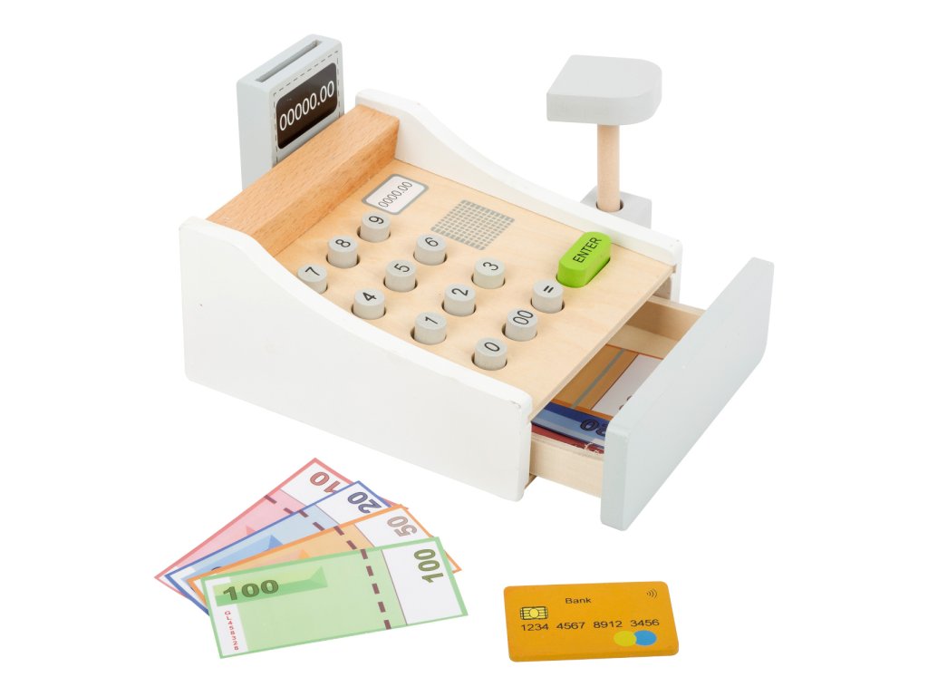 Peníze se jen sypou! Tato krásná dřevěná pokladna patří do každé dobře organizované dětské prodejny. Hraní s touto hračkou pomáhá dětem pochopit ceny zboží a manipulaci s penězi. Součásti jsou bankovky na hraní a dřevěné kreditní karty, které se pohodlně vejdou do spodní zásuvky. Cena zakoupeného zboží může být zadána na klávesnici. Kdo je další na řadě? Hlavní vlastnosti: dřevěná pokladna včetně skeneru, čtečky karet, hracích peněz a dřevěné kreditní kartyučí děti poznávat peněžní částky a cenyideální doplněk pro obchod na hranípodporuje aktivní hraní rolí a rozvoj sociálních dovedností dětí při hře