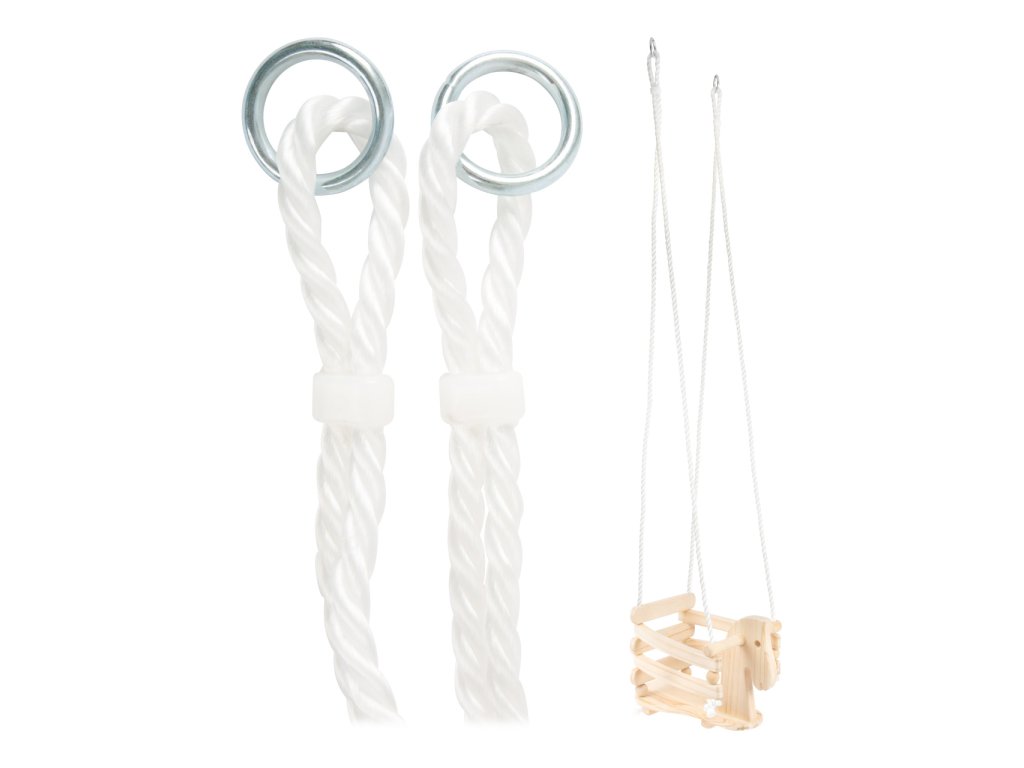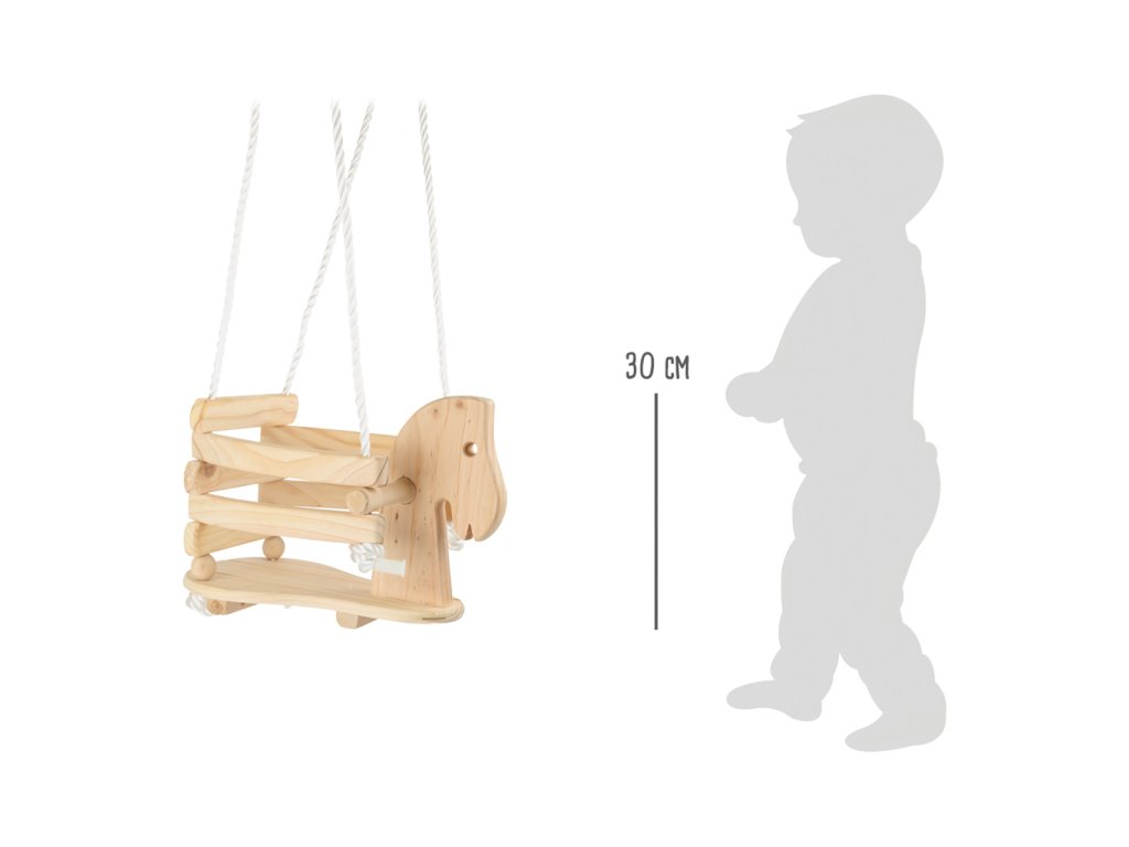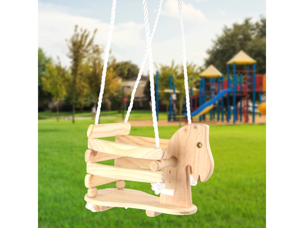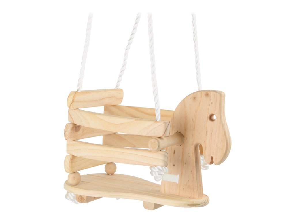 Hyjé, houpáním kupředu! Roztomilá houpačka s hlavou koníka je díky prostornému sedátku, opěrce a vyvýšenému hrazení nejen pohodlná, ale i velmi bezpečná. Po stranách nabízí madla, kterých se děti mohou pevně chytit, a houpání se tak stane ještě jistějším. Vyrobena je z pečlivě opracovaného dřeva a nabízí přírodní úpravu, kterou lze barevně upravit dle vlastní fantazie. Závěs je tvořen pevnými, odolnými, ale i poddajnými nylonovými lany, která jsou zakončena kovovými kroužky k zavěšení. Hlavní vlastnosti: vyvýšené hrazení a madla pro větší bezpečnostnosnost 30 kgrobustní a odolné provedení z masivního dřeva