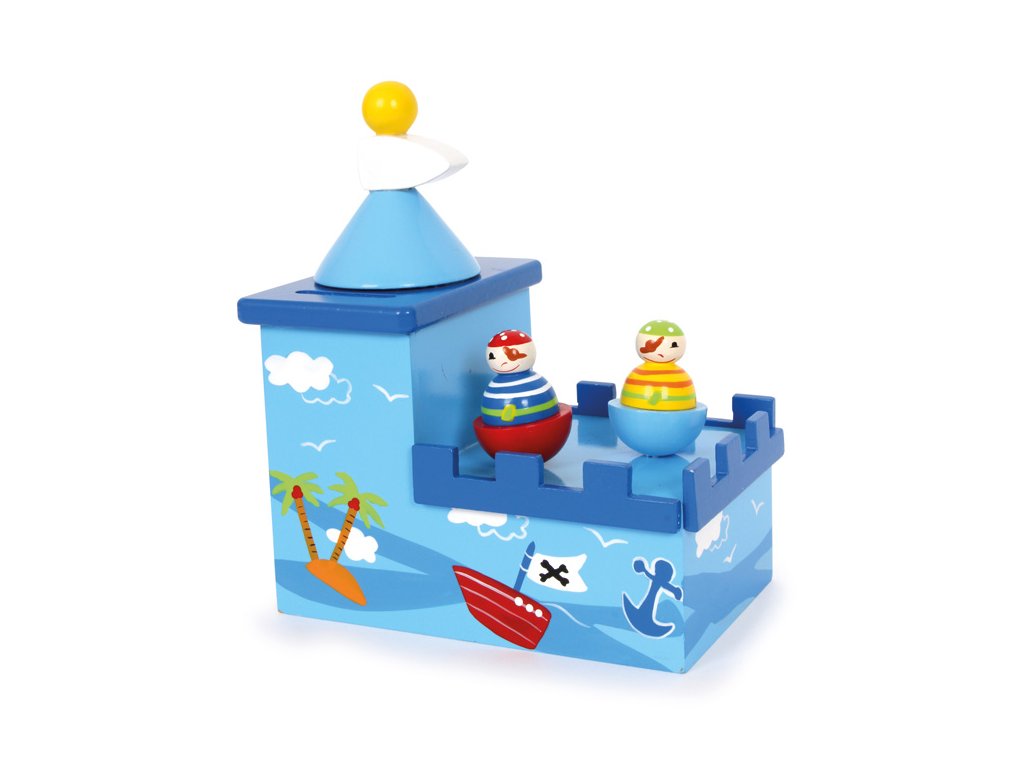 Spořící a hrací skřínka v jednom! Dřevěný hrad v pirátském designu drží poklad v bezpečí a dva piráti tancují radostí na známou melodii. Roztomilý design a motiv nedovolí nikomu na první pohled uhodnout, že se jedná o skutečnou pokladničku. Zábavné spoření! Hlavní vlastnosti: pokladnička a hrací skřínkafigurky na magnet jsou odnímatelné