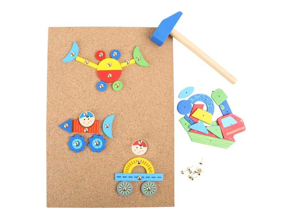 V balení najdete korkovou desku, kladivo, připínáčky a dřevěné objekty různých tvarů. Děti si mohou na desce/nástěnce díky zatloukačce vytvořit různé obrázky. Ať je to robot nebo raketa, tato sada obsahuje vše k vytvoření kouzelného obrazu. V balení najdete také obrázkové předlohy, z kterých se děti mohou inspirovat. Tato hra podporuje rozvoj kreativity a dá dětem vlastní prostor pro tvoření. Hlavní vlastnosti: podporuje kreativitu a koncentracipodporuje jemnou motoriku
