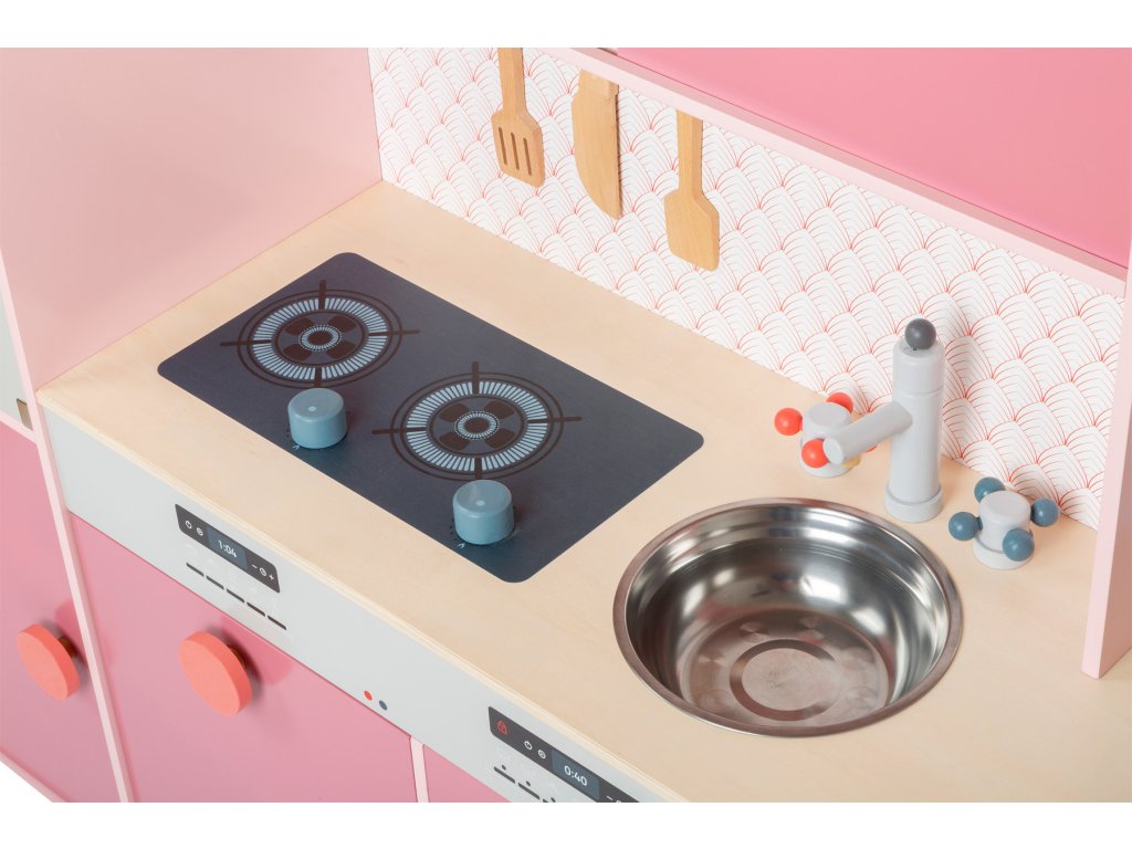 S touto kuchyňkou je michelinská hvězda Vaše! Tato dětská dřevěná kuchyně v moderním růžovém retro vzhledu se sporákem, dřezem, pračkou, myčkou nádobí, lednicí, mikrovlnnou a horkovzdušnou troubou je jako dělaná pro dlouhé hodiny zábavy. Knoflíky cvakají a dvířka spotřebičů jsou otevírací. Dodáváno včetně servírovacího příboru, hrnce, pánve, solničky a pepřenky. Hlavní vlastnosti: množství spotřebičůdvířka s magnetickým zavíráním a cvakající ciferníkyrealisticky ilustrované ovládací panely spotřebičů součástí malá sada příslušenství k vařeníúložný prostorpodporuje aktivní hraní rolí a sociální dovednosti