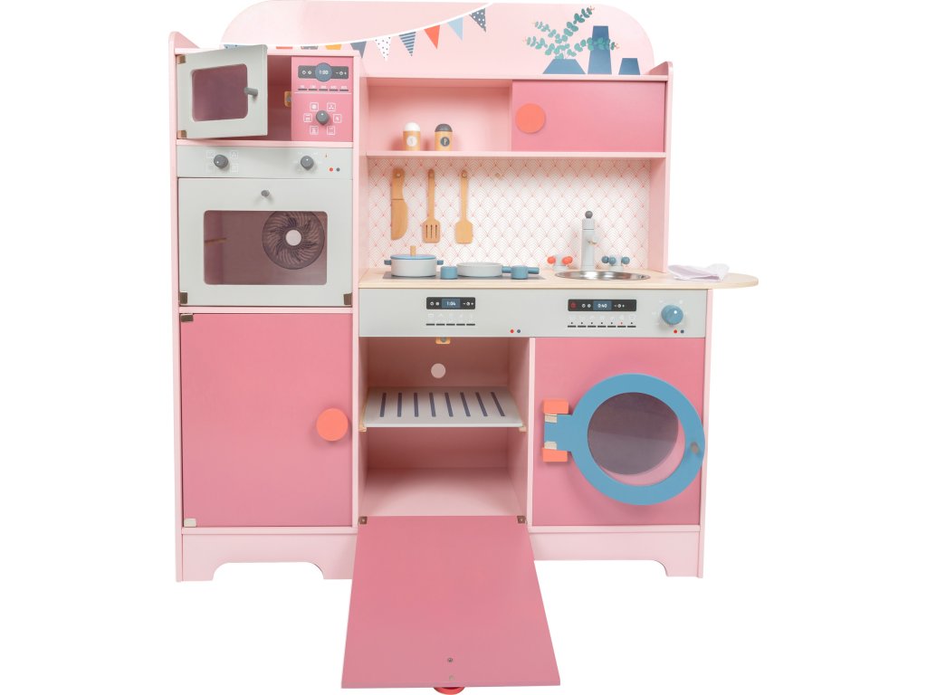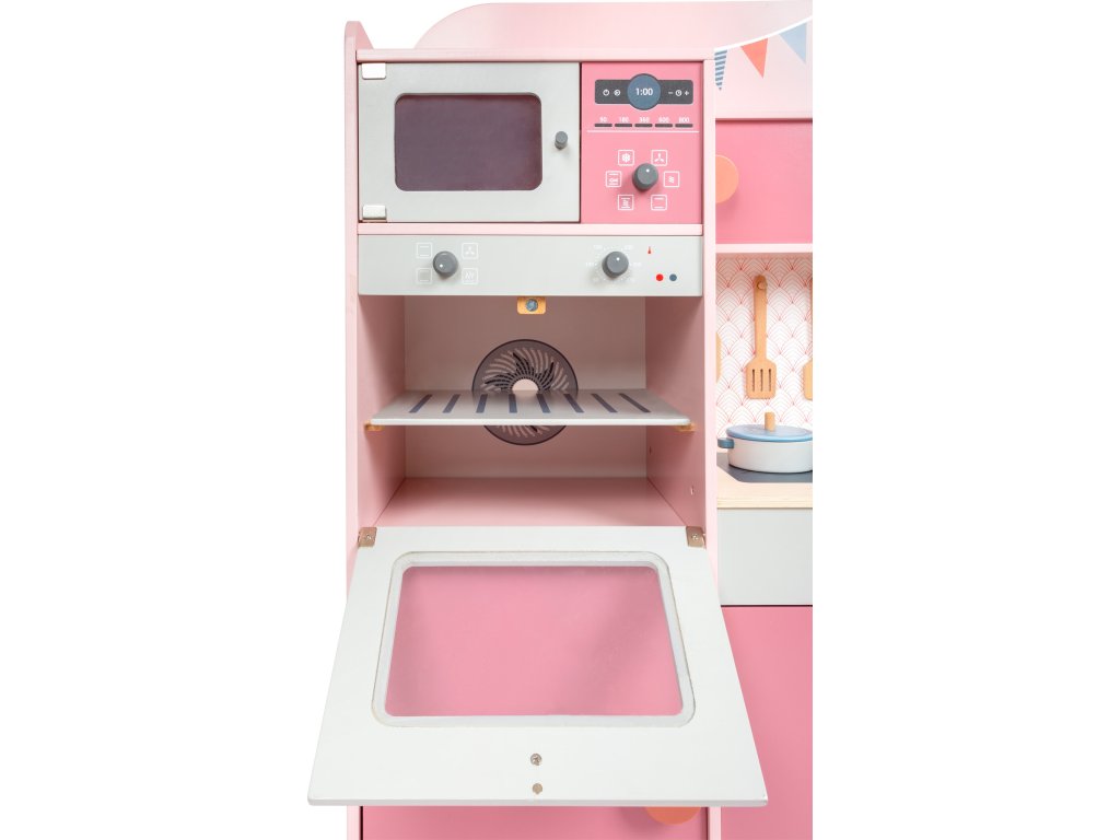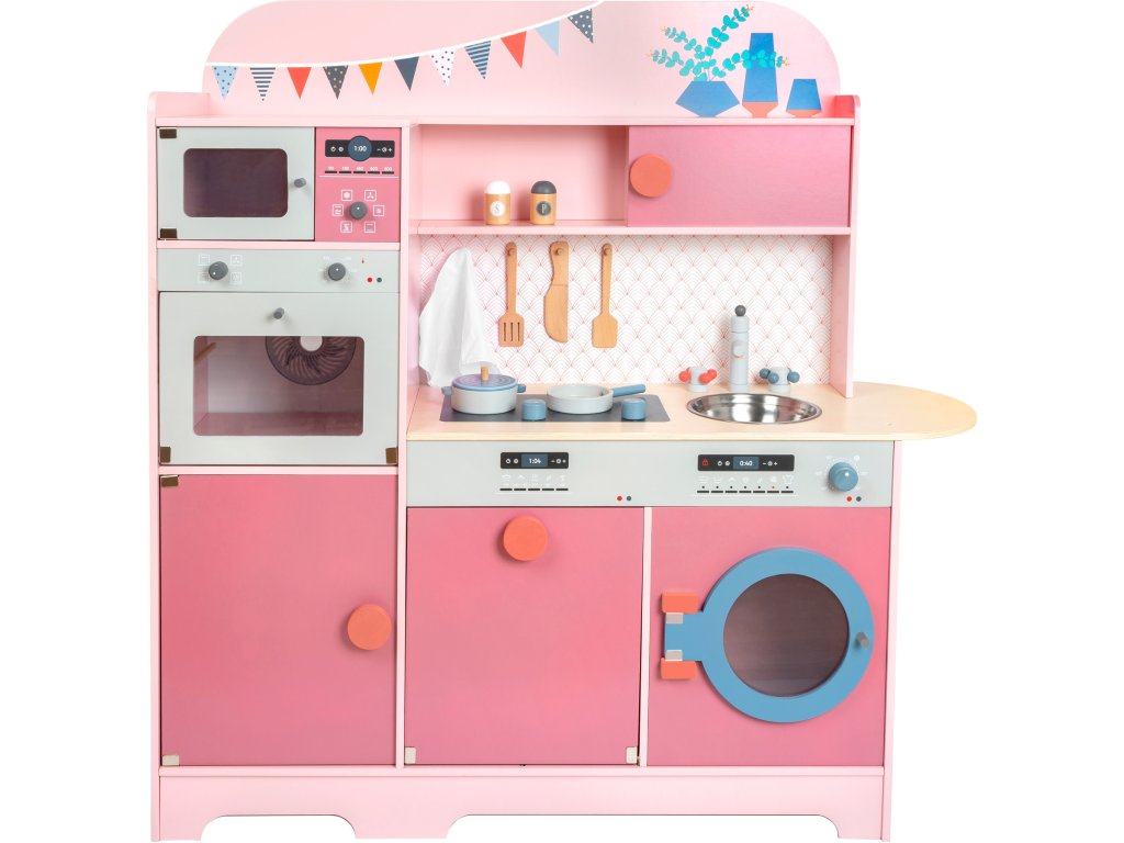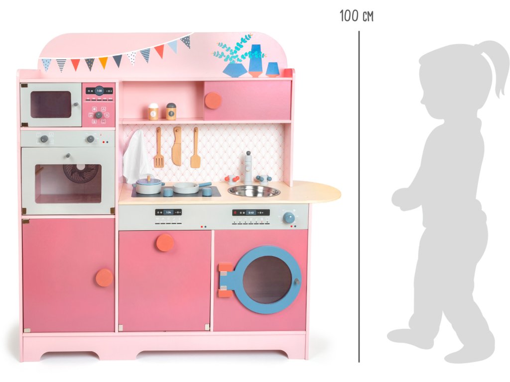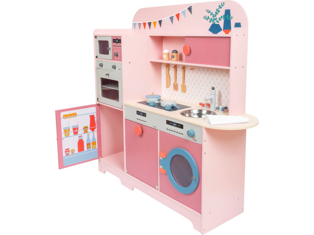 S touto kuchyňkou je michelinská hvězda Vaše! Tato dětská dřevěná kuchyně v moderním růžovém retro vzhledu se sporákem, dřezem, pračkou, myčkou nádobí, lednicí, mikrovlnnou a horkovzdušnou troubou je jako dělaná pro dlouhé hodiny zábavy. Knoflíky cvakají a dvířka spotřebičů jsou otevírací. Dodáváno včetně servírovacího příboru, hrnce, pánve, solničky a pepřenky. Hlavní vlastnosti: množství spotřebičůdvířka s magnetickým zavíráním a cvakající ciferníkyrealisticky ilustrované ovládací panely spotřebičů součástí malá sada příslušenství k vařeníúložný prostorpodporuje aktivní hraní rolí a sociální dovednosti