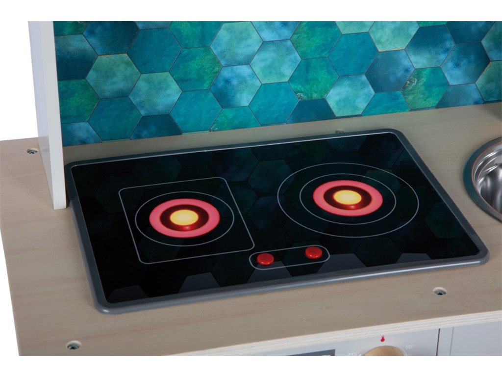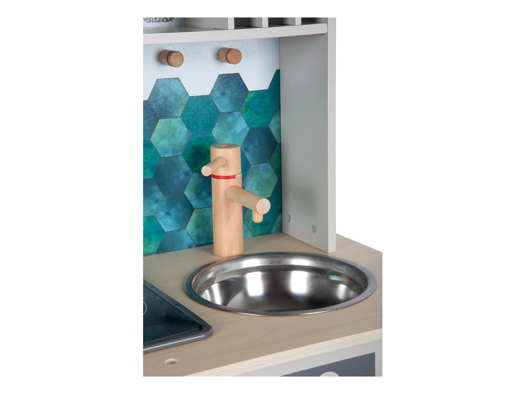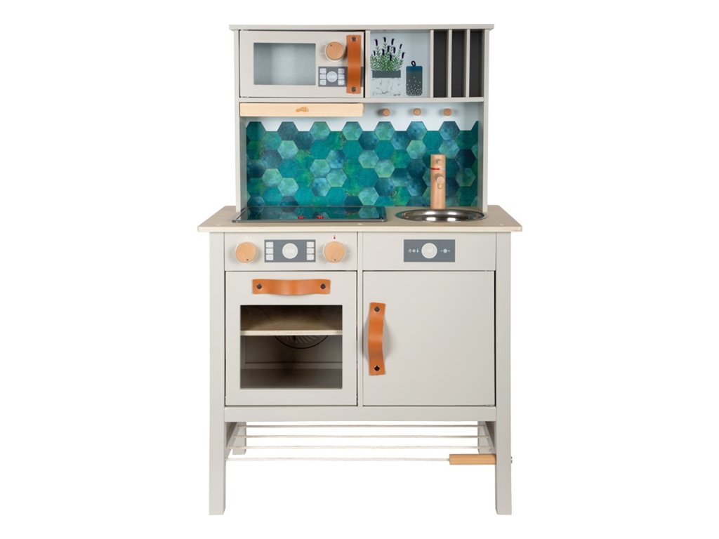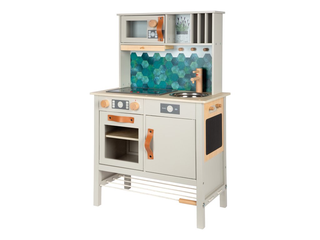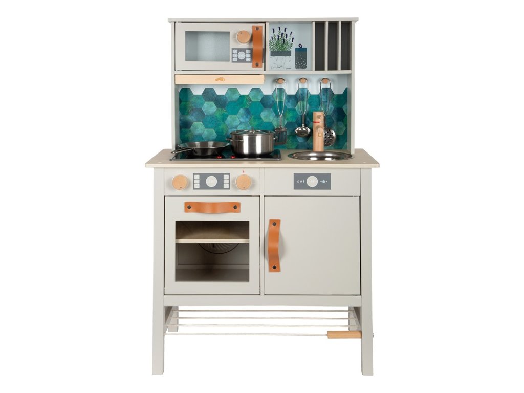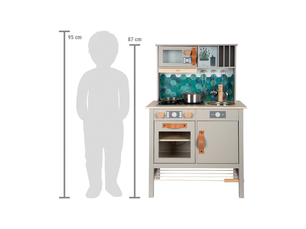 Video je pouze ilustrační. Moderní dětská kuchyňka s robustní konstrukcí v trendy šedé barvě v kombinaci se stylovými koženými madly v koňakové barvě. Okamžitě připravena k hraní s přiloženým hrncem s poklicí, pánví a kovovým kuchyňským náčiním. Dodává se s kovovým dřezem a otočnými knoflíky, které vydávají zvuk. Součástí je elektronická varná deska se světlem a zvukem a zatahovací digestoří se světelným symbolem. Vyjímatelný pekáč lze použít také jako tabuli na kreslení. Povrchy v chladničce a troubě jsou potištěné kuchyňskými detaily pro větší zábavu při hraní. Oboustranný zadní panel s vysoce kvalitním potiskem ve vzhledu dlaždic nebo jednoduché šedé barvě. Lze perfektně doplnit dalšími výrobky a kuchyňskými spotřebiči z kolekce Tasty. Hlavní vlastnosti: kovové doplňky a příslušenstvífunční prvky jako cvakající knoflíky, varná deska s efektem světla a zvukunový moderní designnapájení - 2xAA baterie (nejsou sočástí balení)možné doplnit produkty z kolekce Tasty