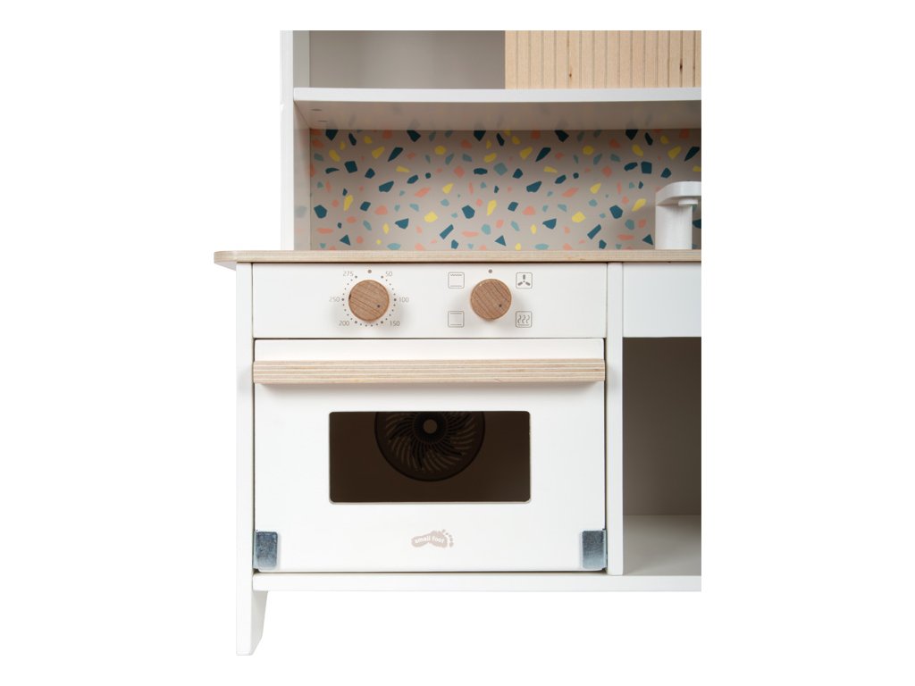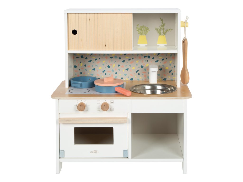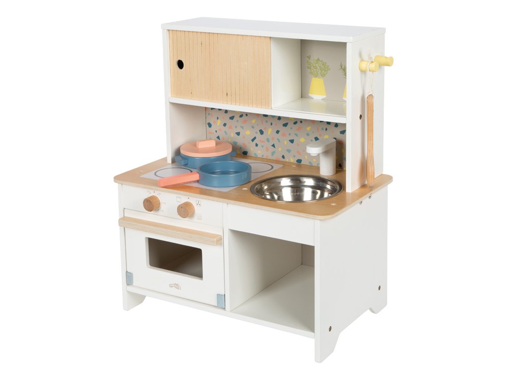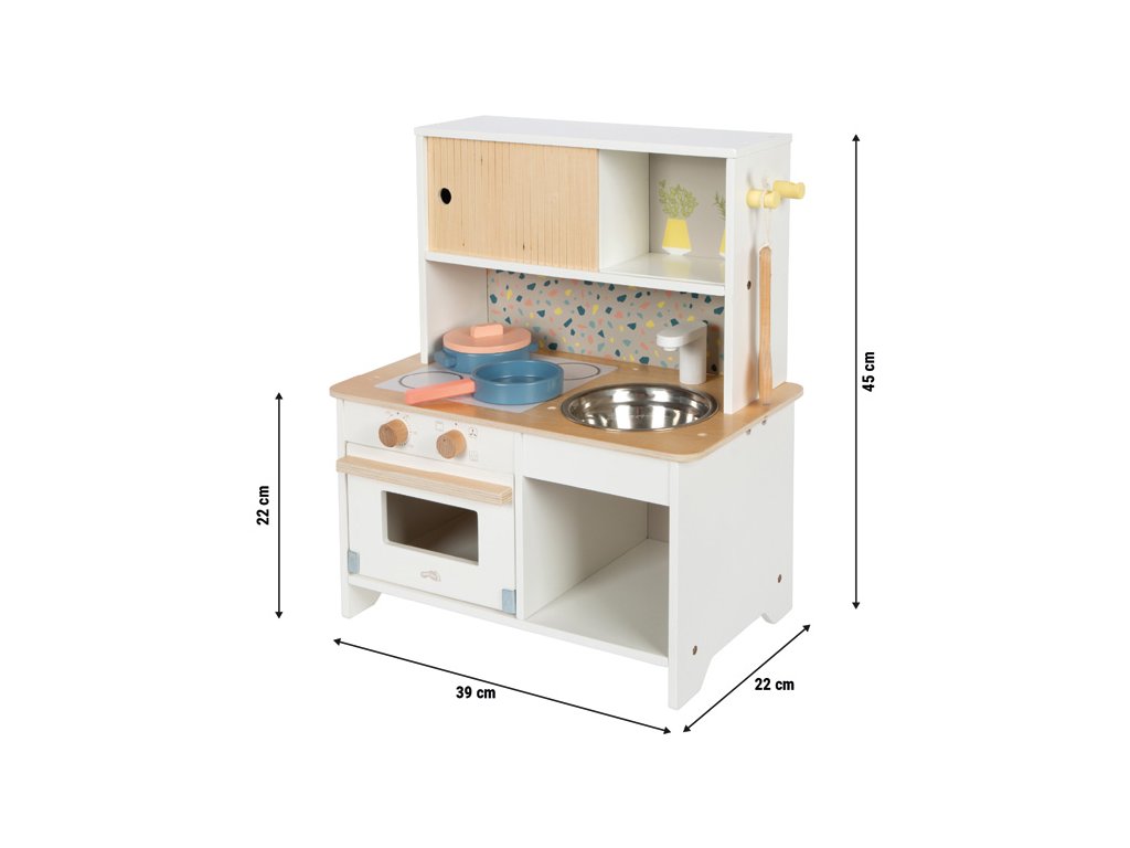 Tato moderní bílá kuchyňka v jemném skandinávském stylu s barevným vzorem inspirovaným terazzem je ideálním vstupem do světa kreativní hry na vaření. Kuchyňka je praktická a skladná a nabízí vše, co malí kuchaři potřebují – sporák s otočnými knoflíky, troubu s magnetickými dvířky, kovový dřez s kohoutkem a také pánev, hrnec s pokličkou a dřevěnou vařečku. Stylová kombinace bílé barvy, přírodního dřeva a hravého vzoru na zadní stěně dělá z kuchyňky krásný doplněk dětského pokoje. Pracovní plocha ve výšce přibližně 22 cm je ideální pro malé dětské ručičky, ale také jako „kuchyňka pro panenky“ – skvělá pro hraní s velkými panenkami (cca 43 cm).Kompaktní konstrukce šetří místo, takže se kuchyňka hodí i do menších bytů nebo jako druhá kuchyňka u prarodičů. Děti si při hře osvojují používání kuchyňského náčiní, rozvíjejí fantazii, jemnou motoriku i sociální dovednosti při společném vaření. Hlavní vlastnosti: kuchyňka, hrnec s pokličkou, pánev, dřevěná vařečkavyjímatelný kovový dřez, dvířka trouby s magnetickým zavíránímrozmanité úložné prostory a odkládací plochy otočné knoflíky s cvakavým zvukem pro realistický zážitek z kuchyně díky pracovní výšce 22 cm si s ní lze hrát i jako s "kuchyní pro panenky" s většími panenkami (cca 43 cm). podporuje hraní rolí a kreativitu a rozvíjí sociální dovednosti