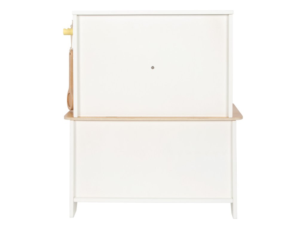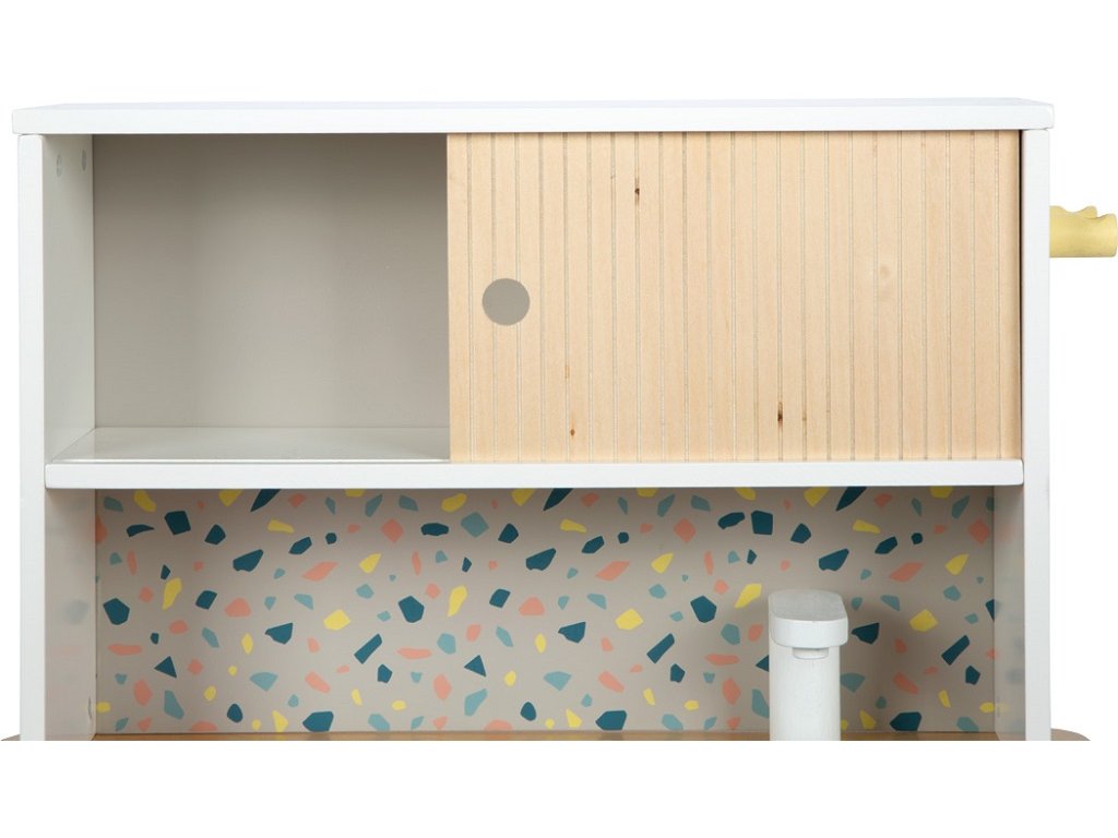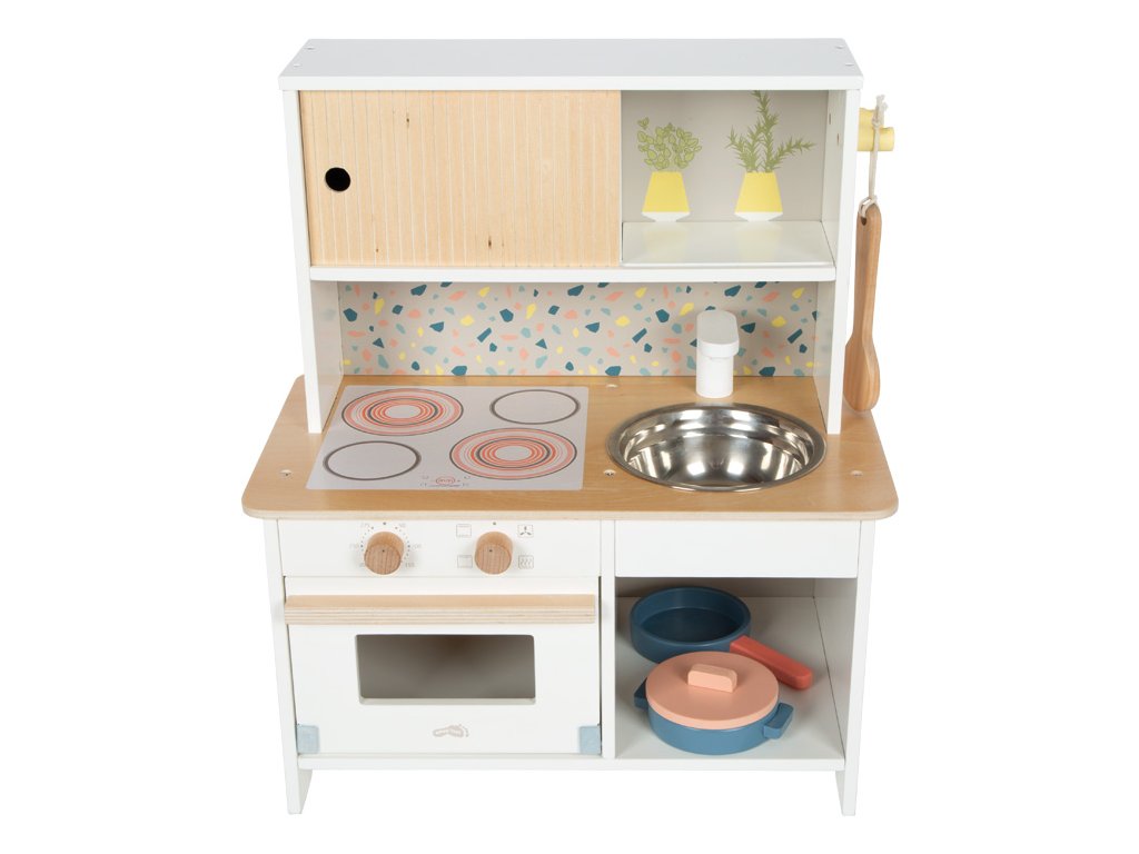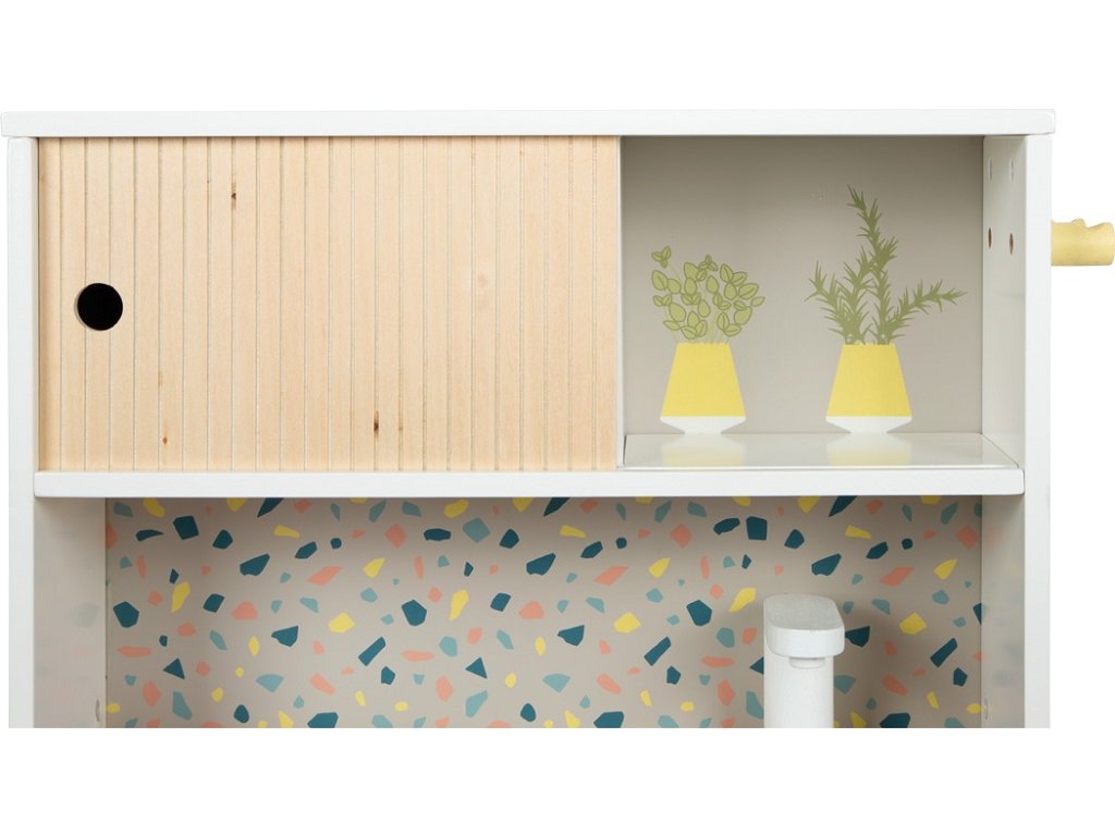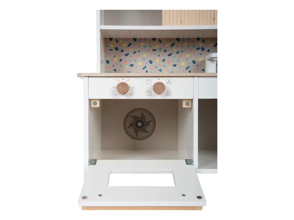 Tato moderní bílá kuchyňka v jemném skandinávském stylu s barevným vzorem inspirovaným terazzem je ideálním vstupem do světa kreativní hry na vaření. Kuchyňka je praktická a skladná a nabízí vše, co malí kuchaři potřebují – sporák s otočnými knoflíky, troubu s magnetickými dvířky, kovový dřez s kohoutkem a také pánev, hrnec s pokličkou a dřevěnou vařečku. Stylová kombinace bílé barvy, přírodního dřeva a hravého vzoru na zadní stěně dělá z kuchyňky krásný doplněk dětského pokoje. Pracovní plocha ve výšce přibližně 22 cm je ideální pro malé dětské ručičky, ale také jako „kuchyňka pro panenky“ – skvělá pro hraní s velkými panenkami (cca 43 cm).Kompaktní konstrukce šetří místo, takže se kuchyňka hodí i do menších bytů nebo jako druhá kuchyňka u prarodičů. Děti si při hře osvojují používání kuchyňského náčiní, rozvíjejí fantazii, jemnou motoriku i sociální dovednosti při společném vaření. Hlavní vlastnosti: kuchyňka, hrnec s pokličkou, pánev, dřevěná vařečkavyjímatelný kovový dřez, dvířka trouby s magnetickým zavíránímrozmanité úložné prostory a odkládací plochy otočné knoflíky s cvakavým zvukem pro realistický zážitek z kuchyně díky pracovní výšce 22 cm si s ní lze hrát i jako s "kuchyní pro panenky" s většími panenkami (cca 43 cm). podporuje hraní rolí a kreativitu a rozvíjí sociální dovednosti