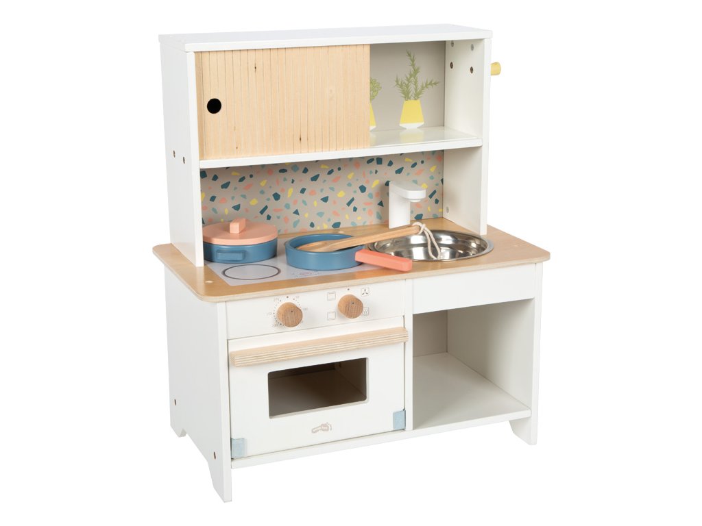 Tato moderní bílá kuchyňka v jemném skandinávském stylu s barevným vzorem inspirovaným terazzem je ideálním vstupem do světa kreativní hry na vaření. Kuchyňka je praktická a skladná a nabízí vše, co malí kuchaři potřebují – sporák s otočnými knoflíky, troubu s magnetickými dvířky, kovový dřez s kohoutkem a také pánev, hrnec s pokličkou a dřevěnou vařečku. Stylová kombinace bílé barvy, přírodního dřeva a hravého vzoru na zadní stěně dělá z kuchyňky krásný doplněk dětského pokoje. Pracovní plocha ve výšce přibližně 22 cm je ideální pro malé dětské ručičky, ale také jako „kuchyňka pro panenky“ – skvělá pro hraní s velkými panenkami (cca 43 cm).Kompaktní konstrukce šetří místo, takže se kuchyňka hodí i do menších bytů nebo jako druhá kuchyňka u prarodičů. Děti si při hře osvojují používání kuchyňského náčiní, rozvíjejí fantazii, jemnou motoriku i sociální dovednosti při společném vaření. Hlavní vlastnosti: kuchyňka, hrnec s pokličkou, pánev, dřevěná vařečkavyjímatelný kovový dřez, dvířka trouby s magnetickým zavíránímrozmanité úložné prostory a odkládací plochy otočné knoflíky s cvakavým zvukem pro realistický zážitek z kuchyně díky pracovní výšce 22 cm si s ní lze hrát i jako s "kuchyní pro panenky" s většími panenkami (cca 43 cm). podporuje hraní rolí a kreativitu a rozvíjí sociální dovednosti