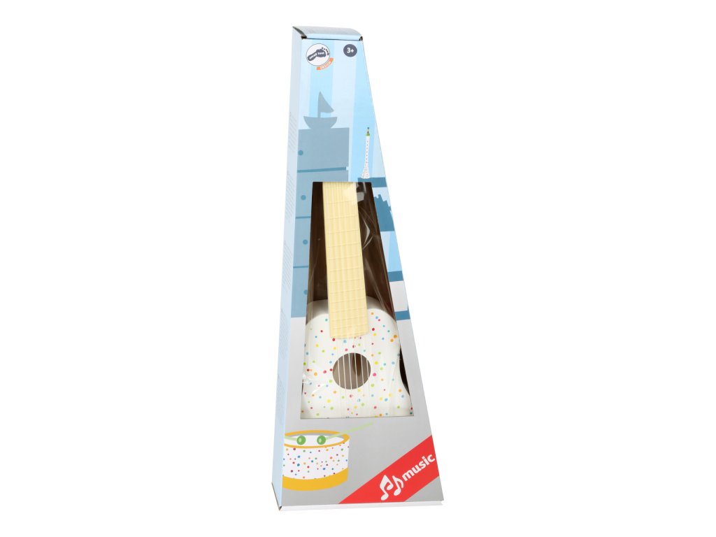 Tato kytara v bílé barvě s malými barevnými puntíky je nutnou výbavou pro všechny mladé milovníky hudby. Kytara je také nezbytnou součástí dětské kapely či herny. Může sloužit k naučení prvních akordů a citu pro rytmus. S pomocí malé kytary se mohou děti naučit doprovázet první říkanky a popěvky. Hlavní popis: děti se naučí akordy a hudební sluch