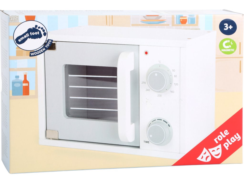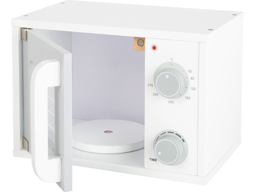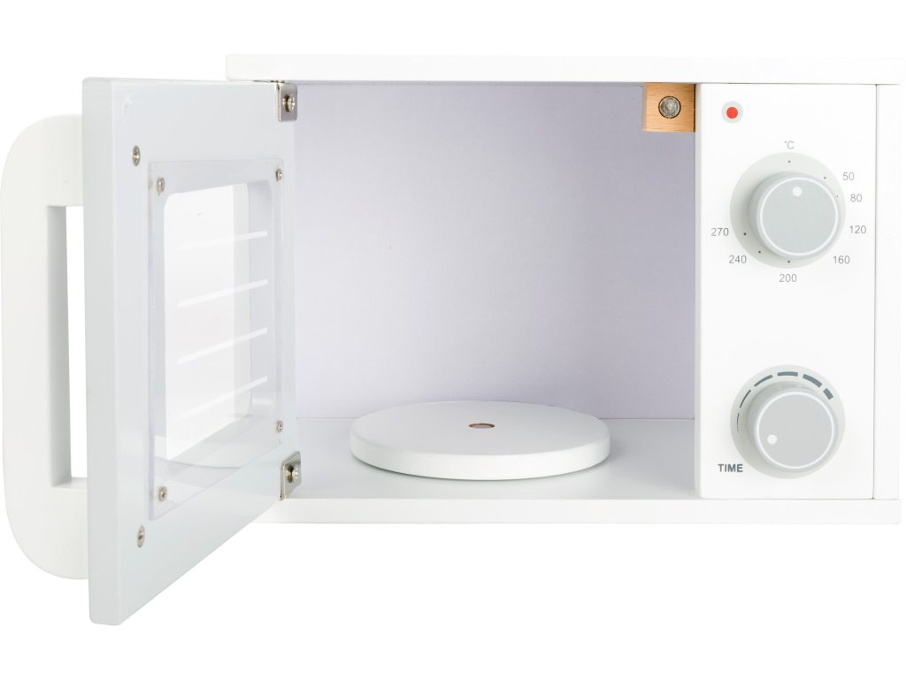 Cink ... a jídlo je připravené! S touto dřevěnou mikrovlnnou troubou mohou děti předstírat, že si ohřejí a připraví pokrm jako ve skutečném světě. Tento realistický domácí spotřebič má otočný talíř a dvířka s magnetickým zavíráním. Pomocí otočných knoflíků lze snadno nastavit funkce teploty a času. Praktický domácí spotřebič, který patří do každé moderní dětské hry. Ideální doplněk všech dětských kuchyněk. Hlavní vlastnosti: otočný talíř, cvakající ciferníkydvířka s magnetickým zavíráním