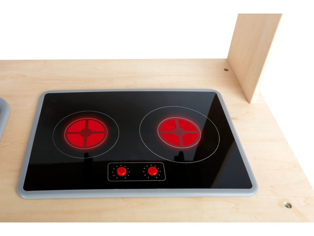 Dnes vařím já! Tato hrací kuchyňka má mnoho různých možností hraní. Kuchyňka má výškově nastavitelné nohy a je vyrobena ze stabilního laminovaného dřeva. Baterie nejsou součástí balení. Drobné detaily, jako je dřez s interaktivní baterií, sporák, který se po stisknutí tlačítka rozsvítí, trouba s otočnými knoflíky a malý odsavač par, nabízejí spoustu zábavy na hraní. Za dvířky skříněk je spousta místa pro vše, co malí kuchaři potřebují. Hlavní vlastnosti: otočné knoflíky, magnetická dvířka, svítící sporákvýškově nastavitelné nohy kuchyňkybaterie nejsou součástí balenípodporuje hraní rolí a sociální dovednosti