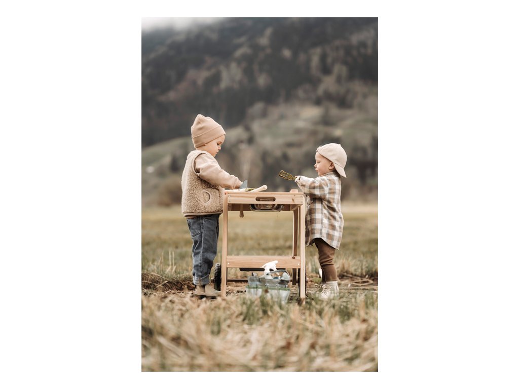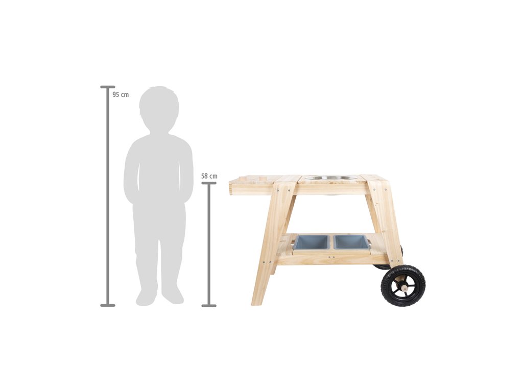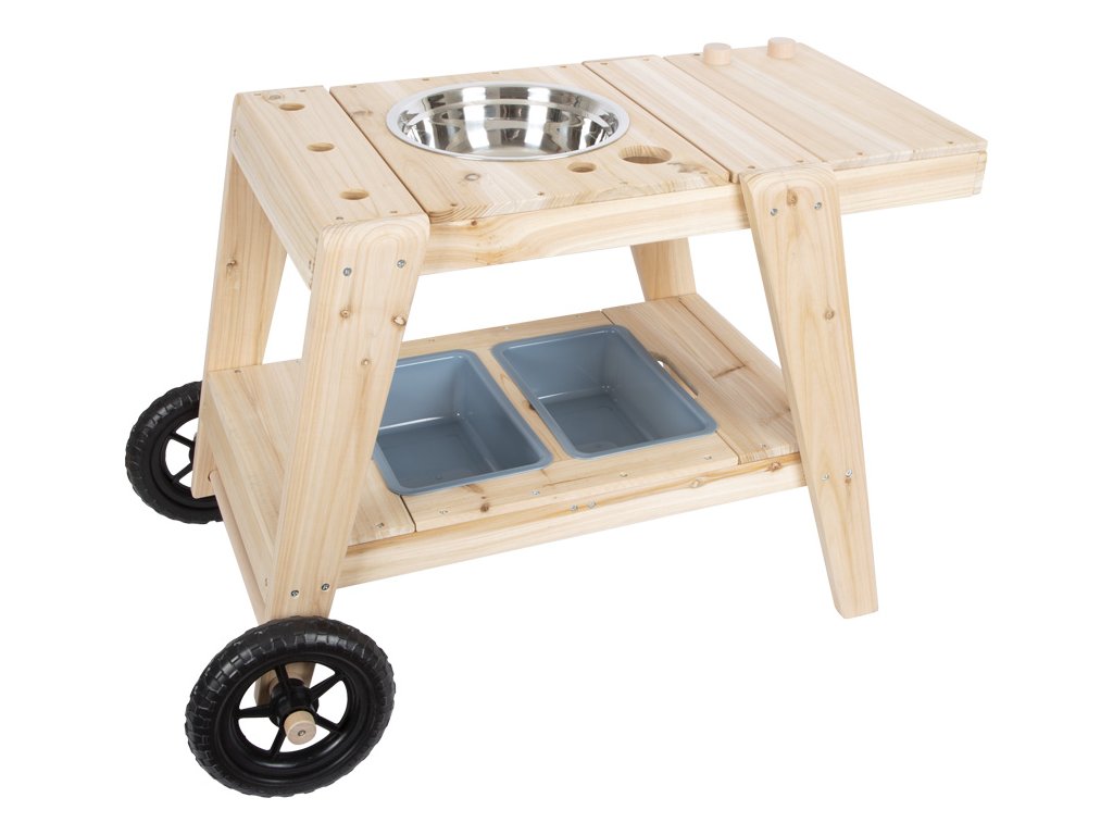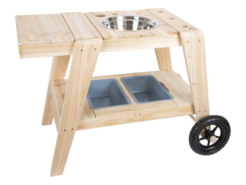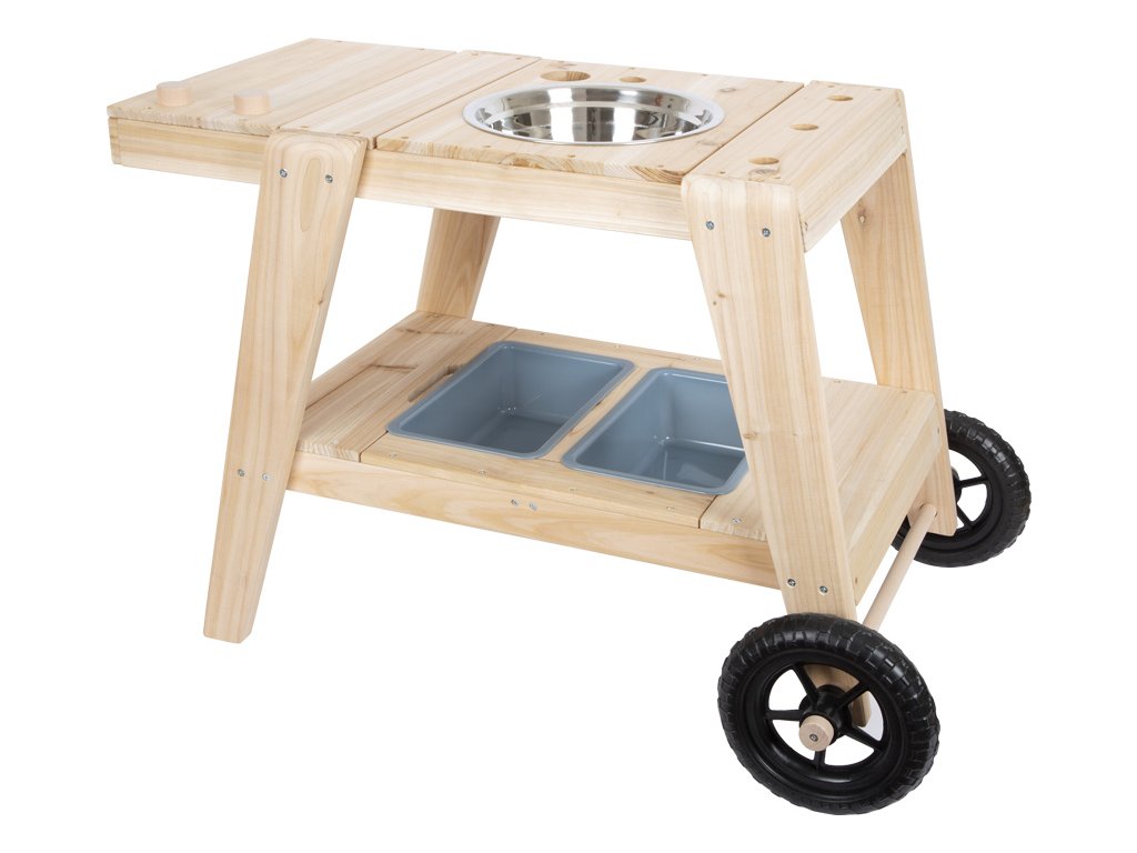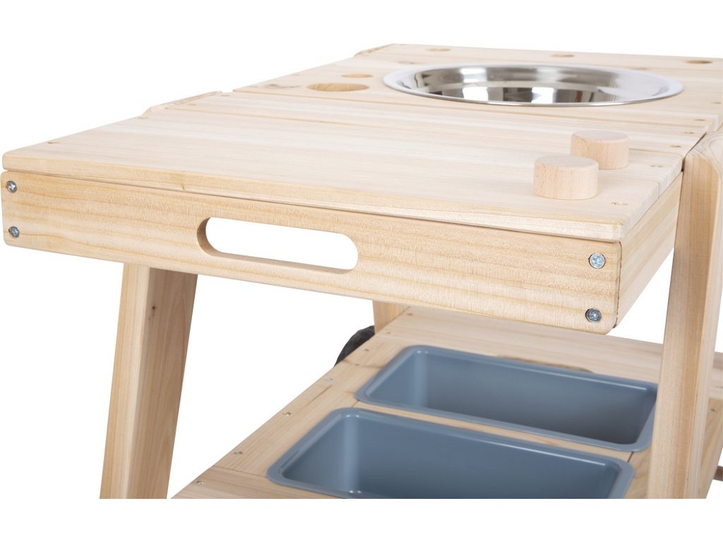 Máchání, vaření a stavění z vody a písku! Tato venkovní „letní“ kuchyňka na hraní je ideální na malou zahradu, terasu nebo balkon. I přes kompaktní rozměry nabízí kuchyňka dostatek prostoru pro kreativní hru. Dodává se se dvěma odnímatelnými miskami, které dokážou rozehrát celý stavební a kulinářský proces. Varná deska je opatřena otočnými knoflíky a řadou otvorů, které můžou posloužit například jako otvor pro vodní hadici. Díky robustním kolečkům lze kuchyňku snadno přemisťovat. Hodí se jako doplněk nebo alternativa pískoviště a k výrobě nejroztomilejších „pískových“ báboviček a dalších pochoutek. Hlavní vlastnosti: ideální pro malou zahradu, terasu nebo balkonpraktické zapuštěné otvory pro hračky na písek či hadici na voduopatřeno kolečky, snadno přemístitelnéneošetřené dřevo vhodné k osobitým úpravám a lakování