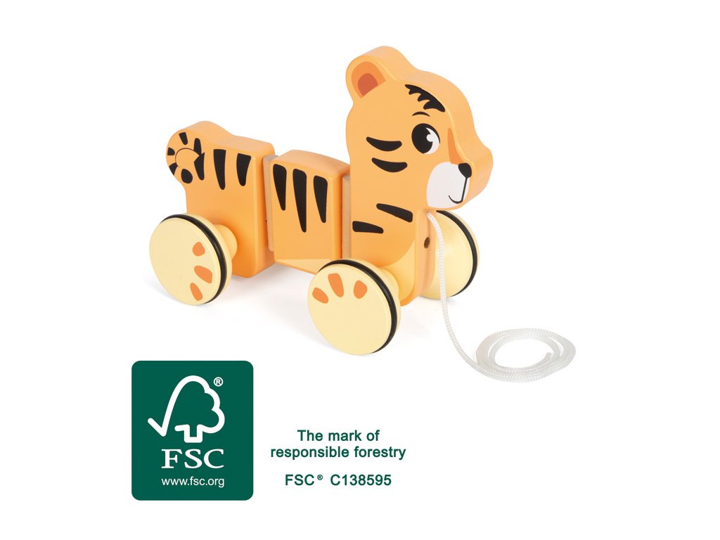 Roztomilý tahací tygřík potěší všechny malé objevitele. Vyrobený ze 100% certifikovaného dřeva FSC®, je nejen ekologický, ale i mimořádně odolný. Díky pogumovaným, tichým kolečkům se hladce pohybuje po podlaze, zatímco flexibilní třídílné tělo se při tažení krásně vlní. Součástí je i tahací provázek, který dětem usnadňuje vedení tygříka a zároveň podporuje jejich samostatnost při chůzi. Jeho přátelský design v safari stylu si děti okamžitě zamilují. Tento veselý společník podporuje rozvoj motoriky, rovnováhy i první krůčky těch nejmenších.Kvalitní zpracování a detailní ilustrace dělají z tygříka oblíbenou hračku, která se skvěle doplňuje s dalšími hračkami z kolekce Safari. Hlavní vlastnosti: robustní provedenípodporuje rovnováhu a koordinaci pohybůrozvíjí motorické dovednostis tichými pogumovanými kolečkyinspiruje dětskou kreativitu a představivost Značka a certifikát FSC® (Forest Stewardship Council) zaručuje, že dřevo, ze kterého byl produkt vyroben, nebylo vytěženo nelegálně a pochází z lesů obhospodařovaných šetrným či přírodě blízkým způsobem, ve kterém jsou dodržovány přísné environmentální a sociální požadavky. Značka FSC® na výrobku znamená, že svým nákupem pomáháte chránit lesy a podporujete šetrné, odpovědné či přírodě blízké hospodaření, díky kterému jsou naše lesy stabilnější, zdravější, mají přirozenou druhovou skladbu a lépe odolávají negativním následkům klimatických změn.