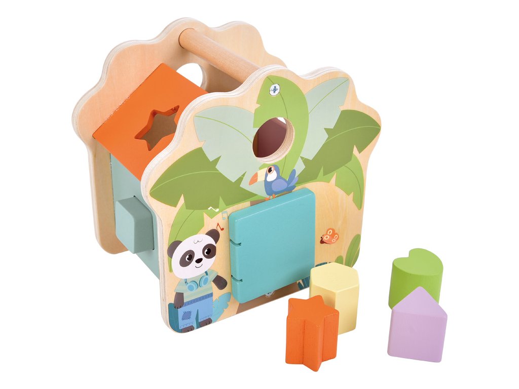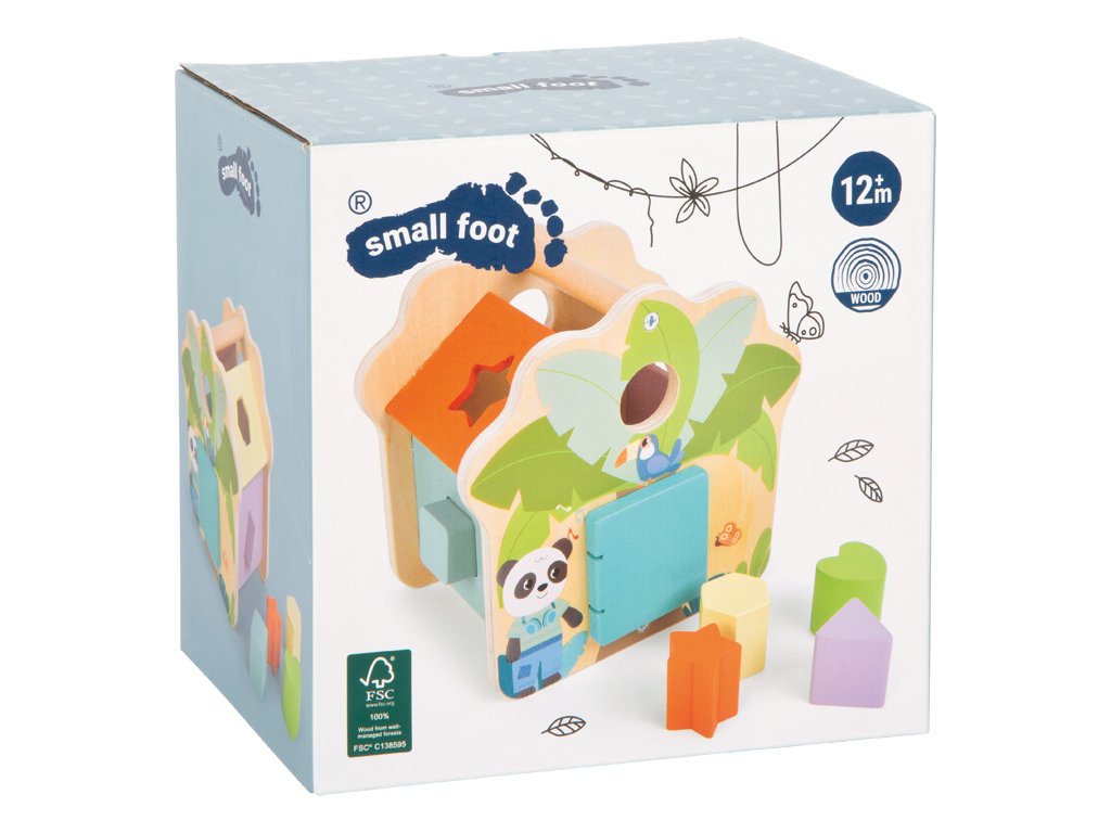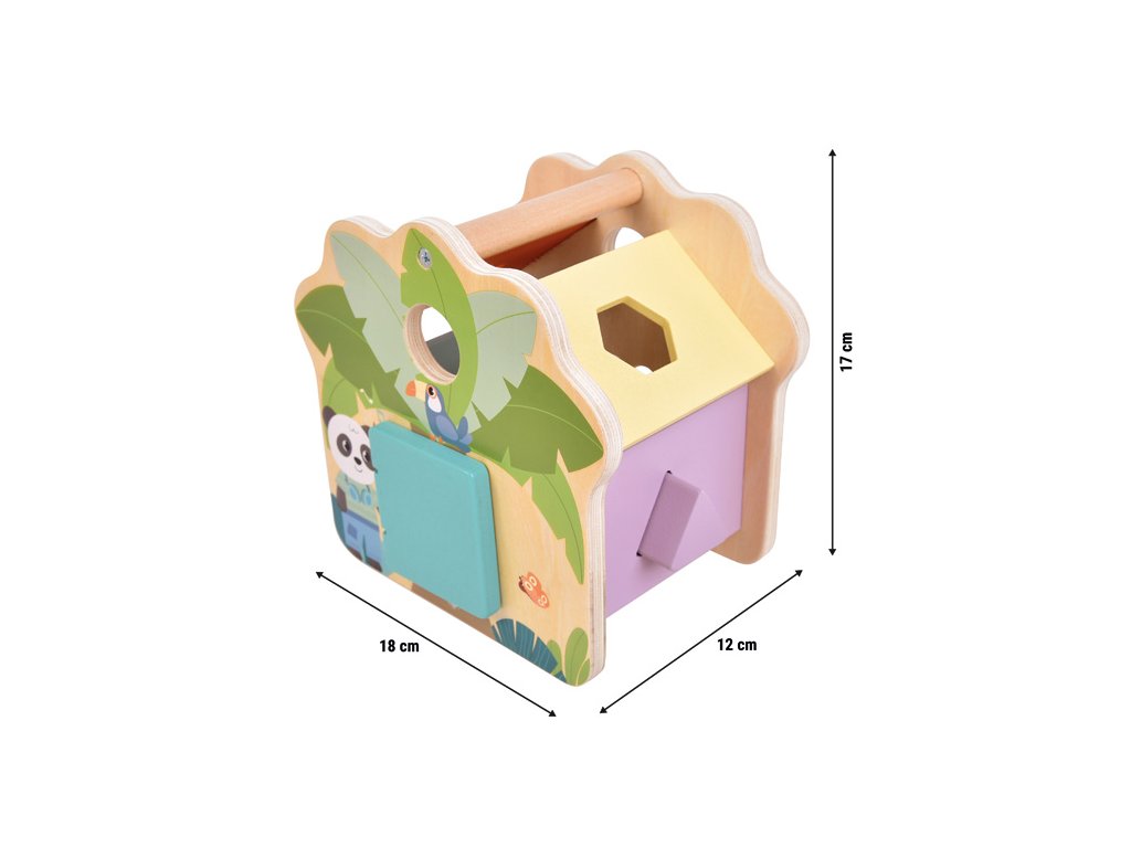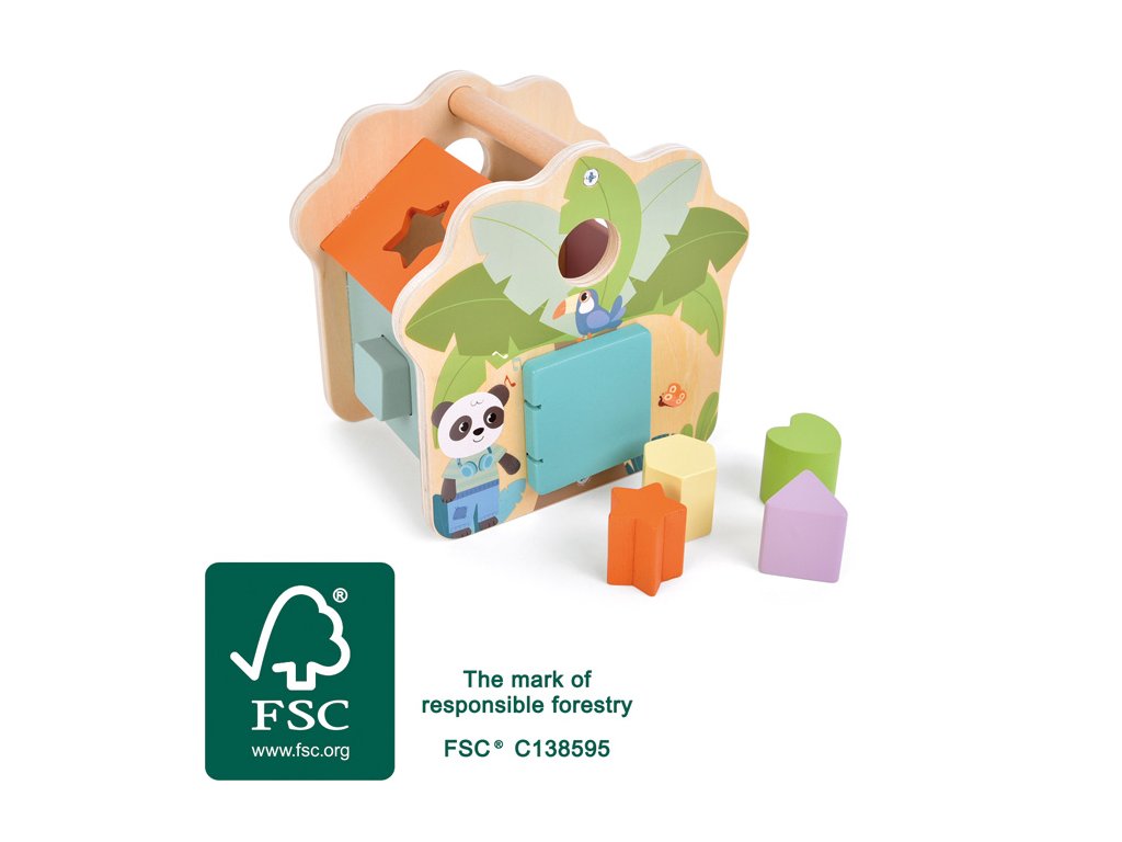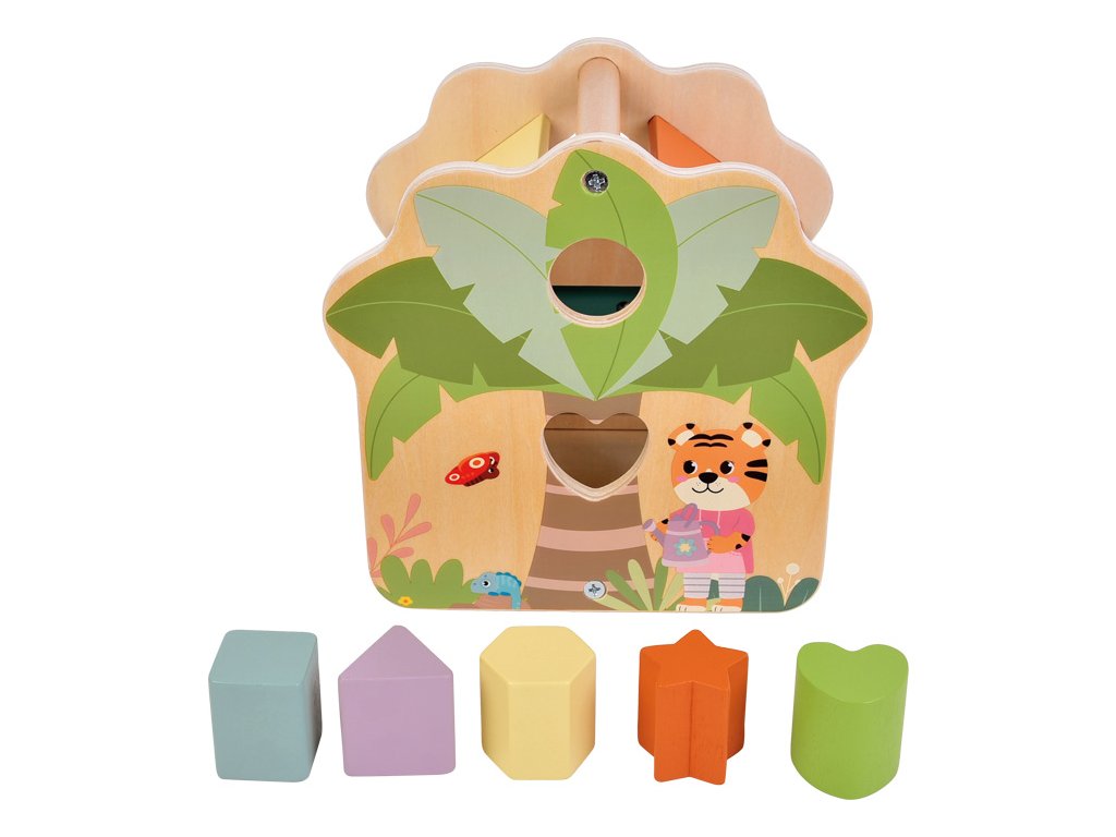 Třídění, vkládání a učení ještě nikdy nebylo tak zábavné! Tento s láskou navržený domeček z certifikovaného FSC® 100% dřeva přináší dětem hravý způsob, jak objevovat svět tvarů a barev. Barevné dřevěné kostky v pěti různých tvarech se vkládají do odpovídajících otvorů po stranách domečku a procvičují tak logické myšlení, jemnou motoriku a koordinaci ruka-oko.Po vložení všech kostek lze dvířka jednoduše otevřít a kostky znovu vysypat. Domeček zdobí roztomilé ilustrace pandy, tygra a palmy, které v dětech probouzejí fantazii a chuť objevovat svět džungle. Díky pestrým barvám, hladkým hranám a zaobleným tvarům je hra naprosto bezpečná i pro malé ručičky. Praktická rukojeť na střeše umožňuje domeček snadno přenášet, ideální na cesty, do školky nebo na hraní doma. Hlavní vlastnosti: vyrobeno z FSC® 100% certifikovaného dřeva obsahuje 5 barevných a tvarově odlišných kostekstřecha s praktickou rukojetí pro snadné přenášení podporuje rozvoj jemné motoriky, trpělivosti a koordinaceučí rozpoznávat barvy a tvary hravou formou Značka a certifikát FSC® (Forest Stewardship Council) zaručuje, že dřevo, ze kterého byl produkt vyroben, nebylo vytěženo nelegálně a pochází z lesů obhospodařovaných šetrným či přírodě blízkým způsobem, ve kterém jsou dodržovány přísné environmentální a sociální požadavky. Značka FSC® na výrobku znamená, že svým nákupem pomáháte chránit lesy a podporujete šetrné, odpovědné či přírodě blízké hospodaření, díky kterému jsou naše lesy stabilnější, zdravější, mají přirozenou druhovou skladbu a lépe odolávají negativním následkům klimatických změn.