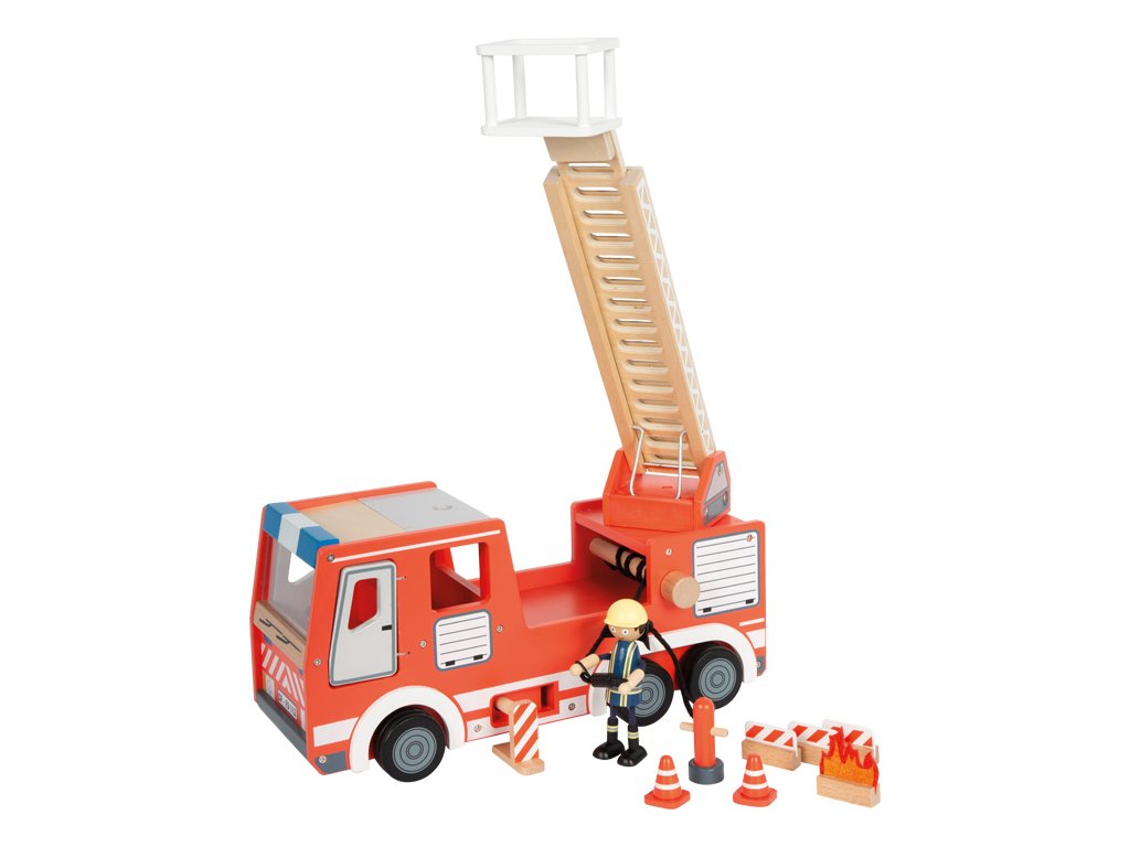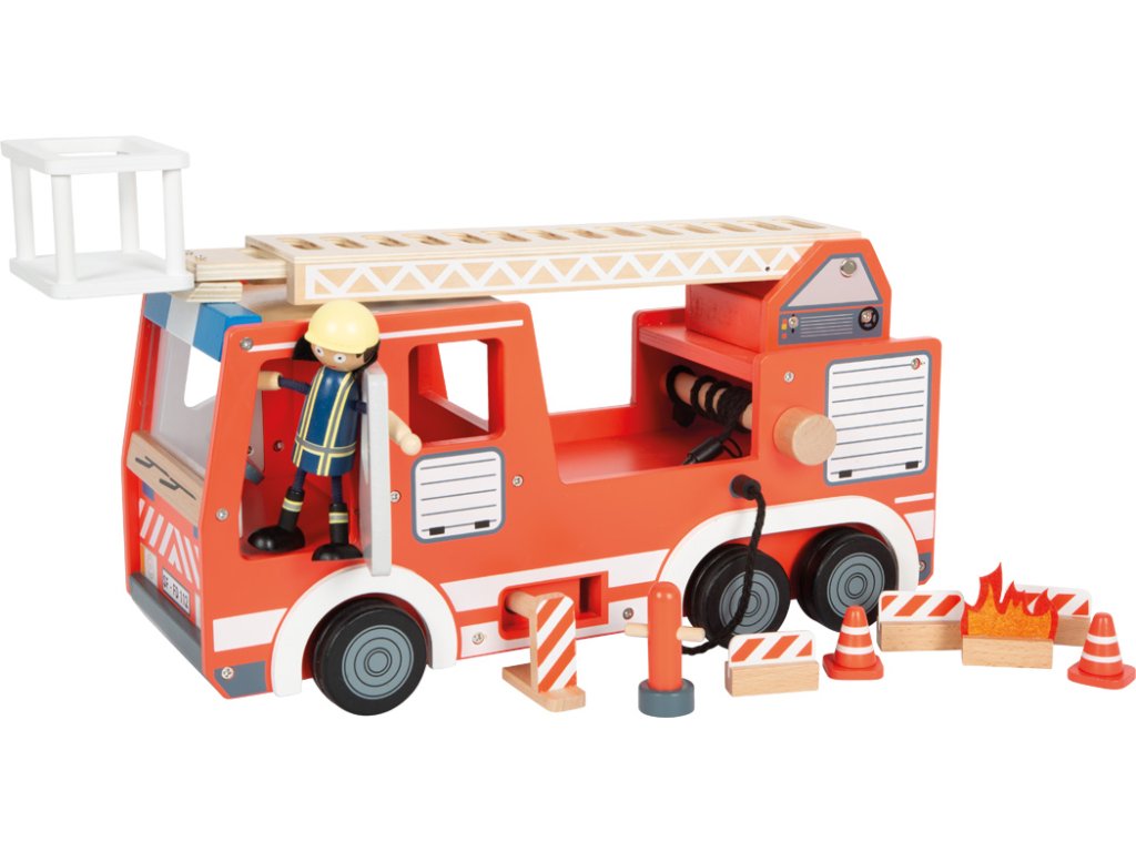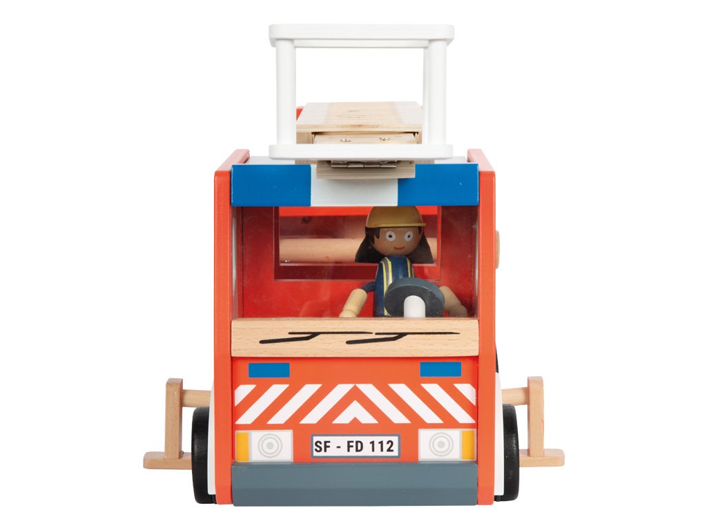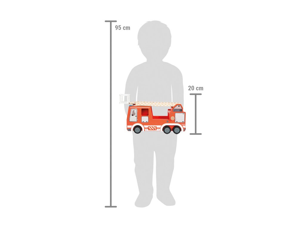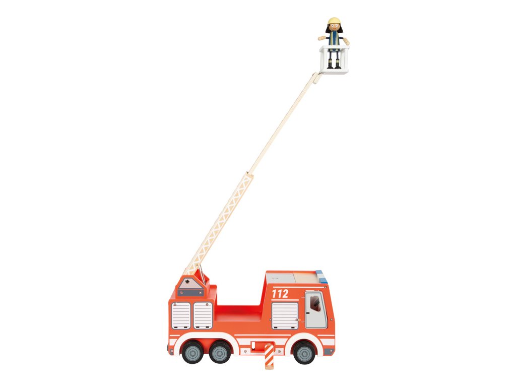 Velké hasičské auto, které přijede na místo, co nevidět! Navíc zaujme svými detaily a robustním zpracováním. Výsuvný žebřík s košem, který lze otáčet o 360 stupňů, umožňuje záchranné práce ve vysokých výškách a díky magnetu žebřík bezpečně uzamkne na místě. Výsuvné podpěrné nohy poskytují stabilní základnu, zatímco navíjecí hadice s magnetickým systémem a odpovídajícím hydrantem je připravena na akční hasičské mise. Otevírací střecha poskytuje úložný prostor pro širokou škálu příslušenství. V kabině řidiče s pohyblivými dveřmi je také dostatek místa pro přiloženou figurku hasiče (ohebná panenka s pohyblivýma rukama a nohama). Pogumovaná kola zajišťují tichou a bezpečnou cestu na místo další mise. Ať už se jedná o zabezpečení míst nehod pomocí bariérových zábran nebo o hašení požárů pomocí zatahovací hadice a rozprašovače vody, tato herní sada nabízí nespočet možností pro kreativní hraní na téma hašení požáru a záchrany. Funkční a detailní design zajišťuje obzvláště autentický zážitek ze hry.Hlavní vlastnosti: obsahuje 1 hasičský vůz s žebříkem a hadicí, 1 ohebnou figurku, 2 dopravní výstražné kužely, 3 zábrany, 1 výsuvný stojan, 1 hydrant, 1 plstěný oheňideální pro fanoušky autíček a hasičůpevné dřevo, zaoblené hranyrealistický designdo auta se vejde figurkapohyblivý žebříktichá pogumovaná kolečka