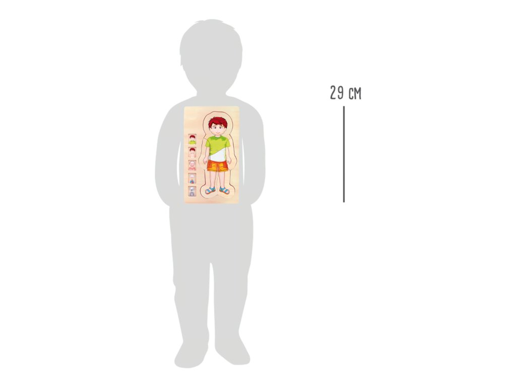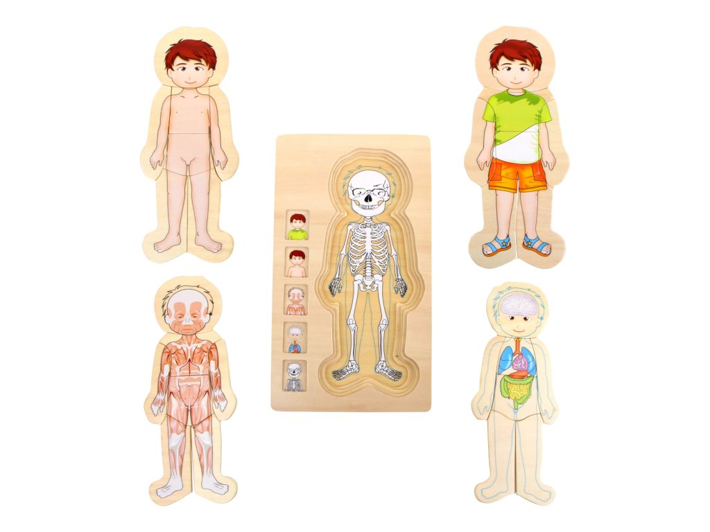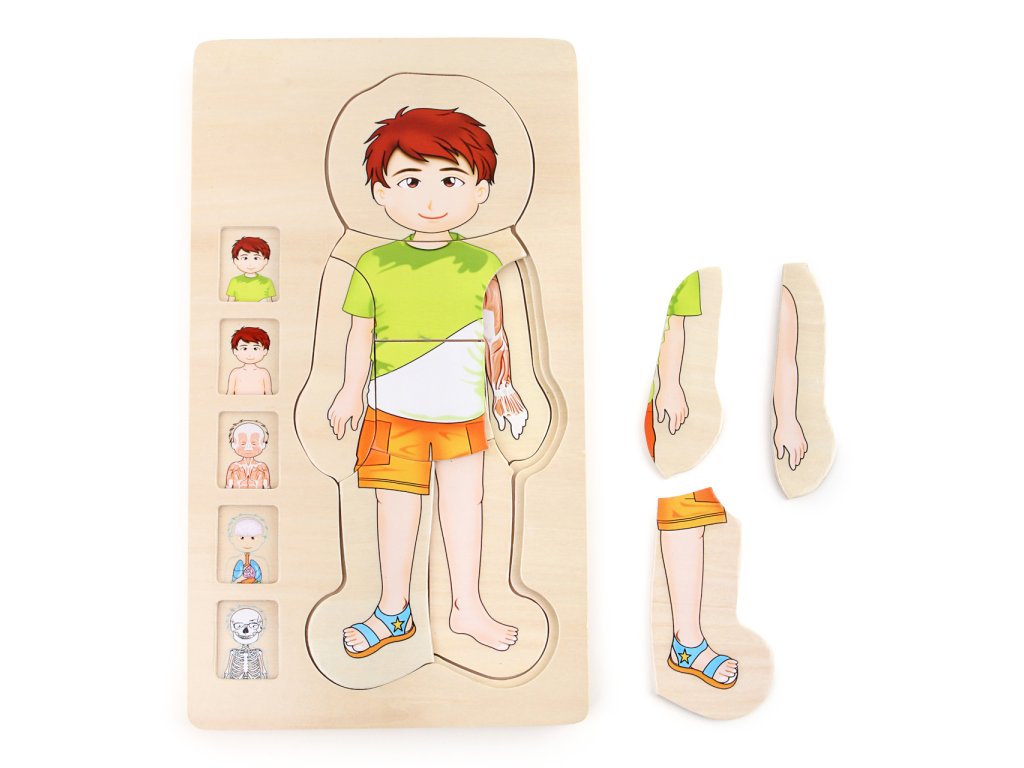 Jak vlastně vypadá Tim zevnitř? Už děti mateřských škol se zajímají o tělo a jeho funkci. Kostra, svaly, krevní oběh, vnitřní orgány – postupně se úroveň po úrovni sestavuje lidské tělo. Toto puzzle z lepeného dřeva přináší nejen nové poznatky, ale trénuje současně motorické dovednosti. Hlavní vlastnosti: lidské tělo zobrazeno ve čtyřech vrstvách získávání znalostí a vědomostí trénuje motoriku