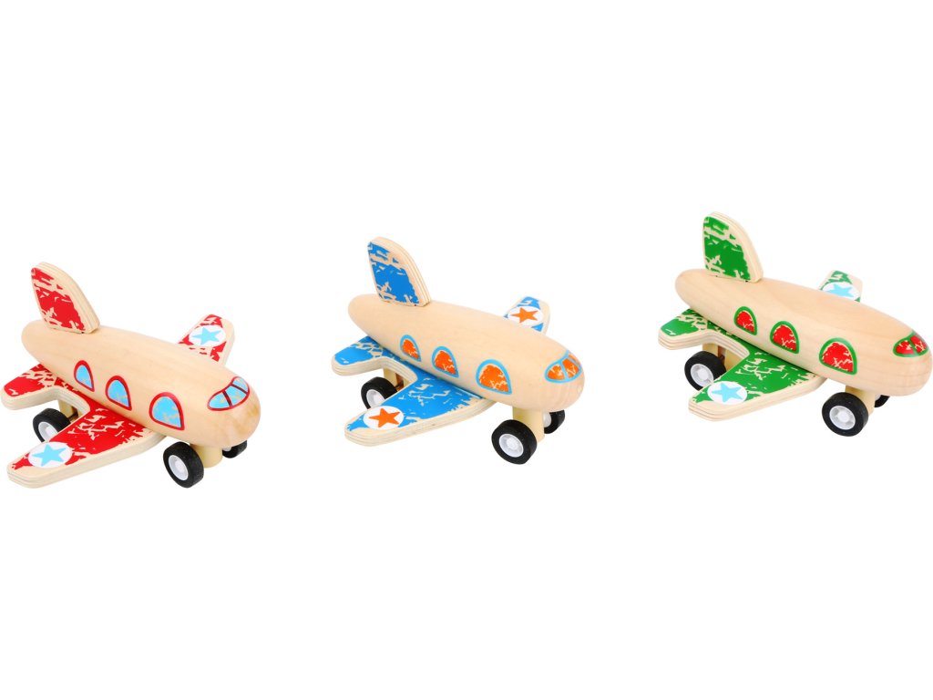Připraveni na odlet! Letadla s natahovacím motorkem v kombinaci přírodního a barevného dřeva. Hračky s natahovacím motorem jsou velmi populární, stačí je potáhnout směrem vzad, pustit a pak jen sledovat jakou rychlostí se derou dopředu. Letadlo s modrými, červenými nebo zelenými křídly. Hlavní vlastnosti: natahovací mechanismustři barevné druhyírobustní a odolné provedení