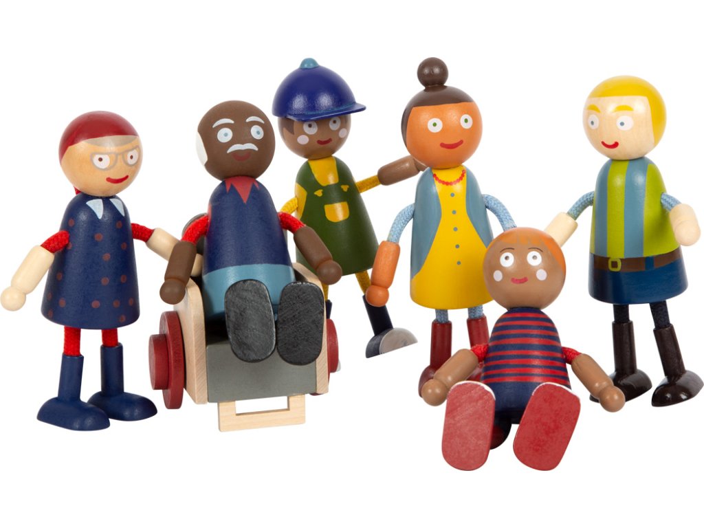 Zpestřete svou kolekci! Tato moderní 6 členná rodina dřevěných panenek čeká na svůj nový domov! Ohýbací panenky jsou různého pohlaví, věku a barvy pleti. Hlava s tělíčkem jsou z masivního dřeva. Ručky a nohy jsou ohebné. Fyzická omezení související se zrakem nebo pohyblivostí lze také integrovat do hry s detaily, jako jsou brýle a invalidní vozík. Hraní rolí s touto sadou podporuje rozvoj identifikace, komunikace, představivosti a sociálních dovedností. Hlavní vlastnosti: rozvíjí představivost a kreativitutrénuje jemnou motorikupodporuje komunikaci a sociální schopnosti