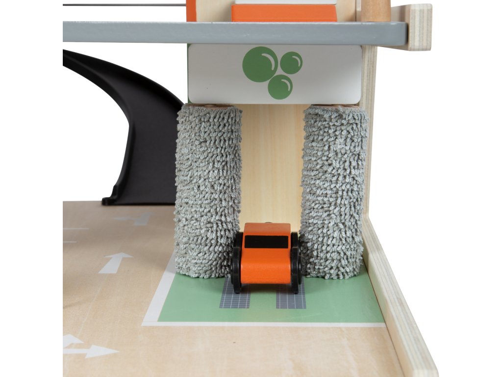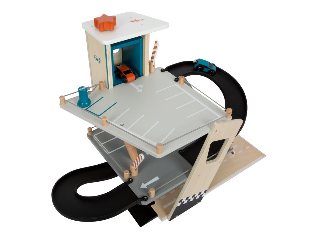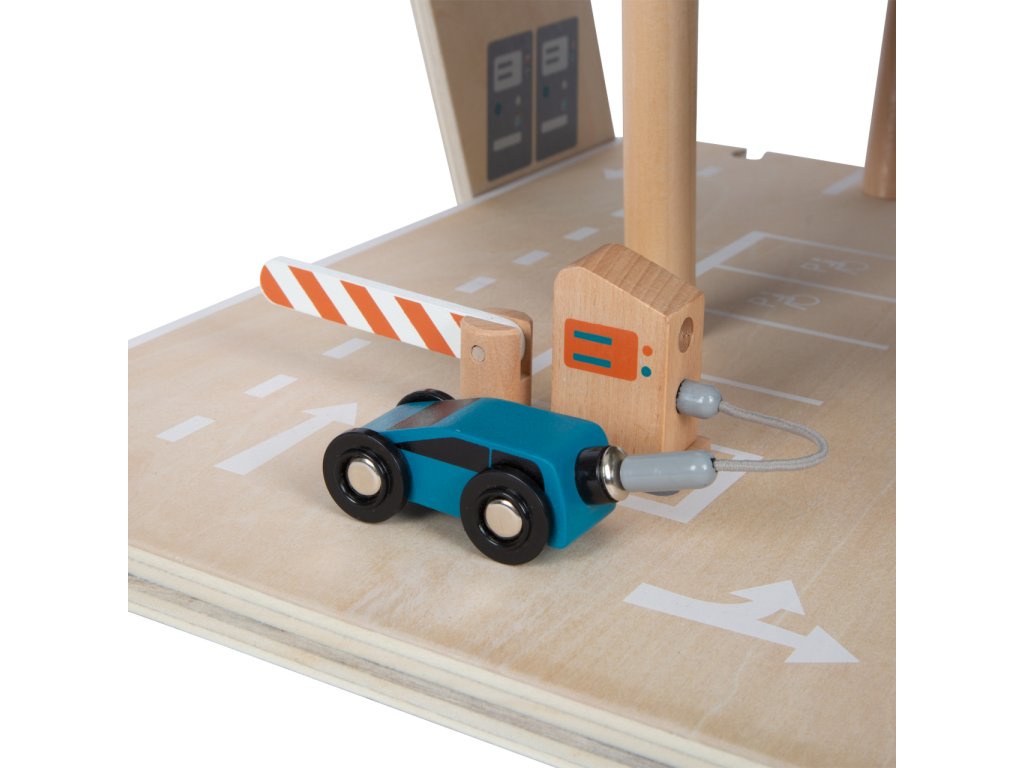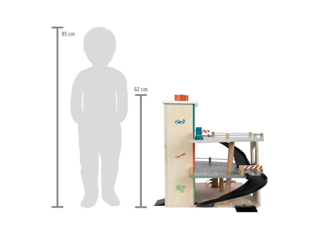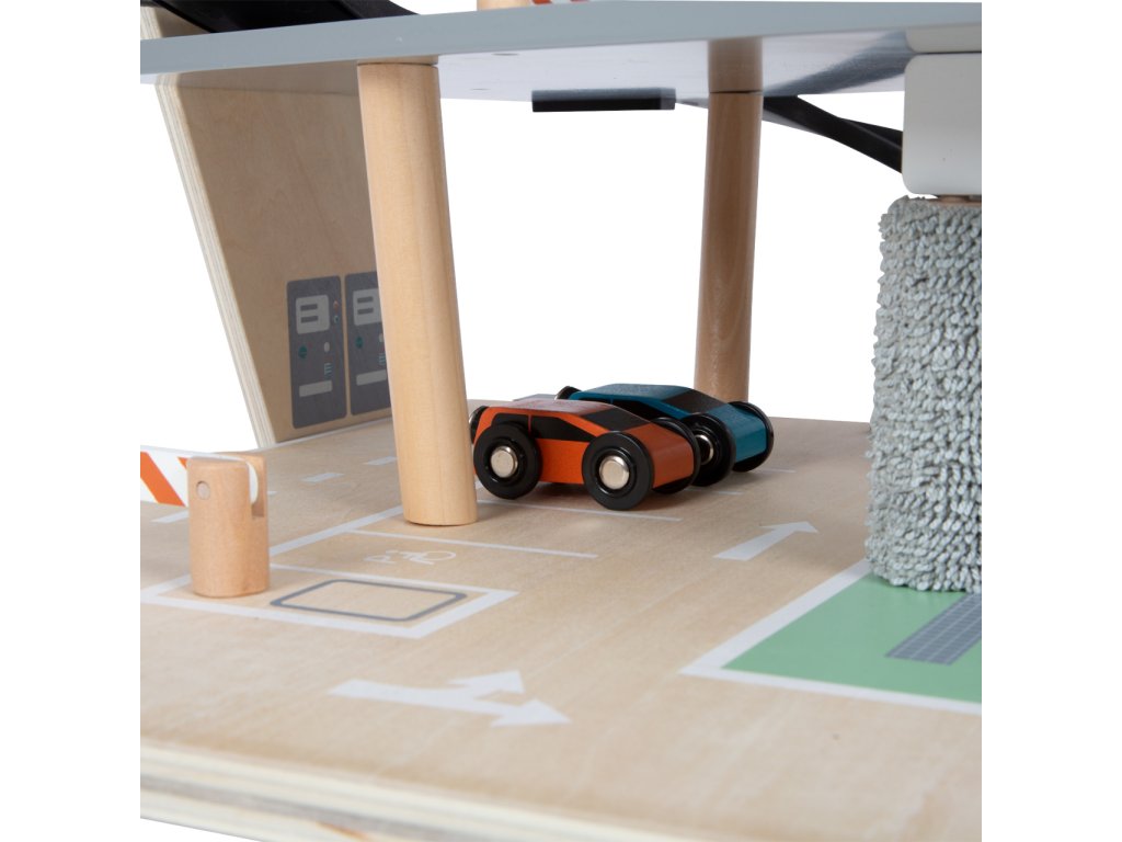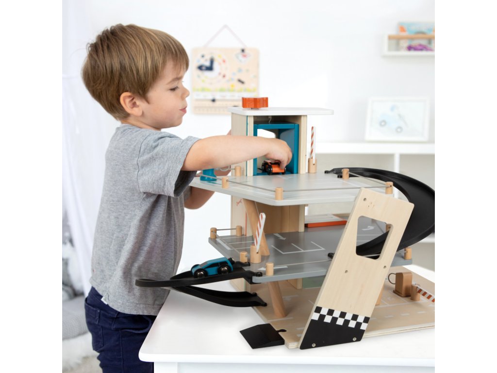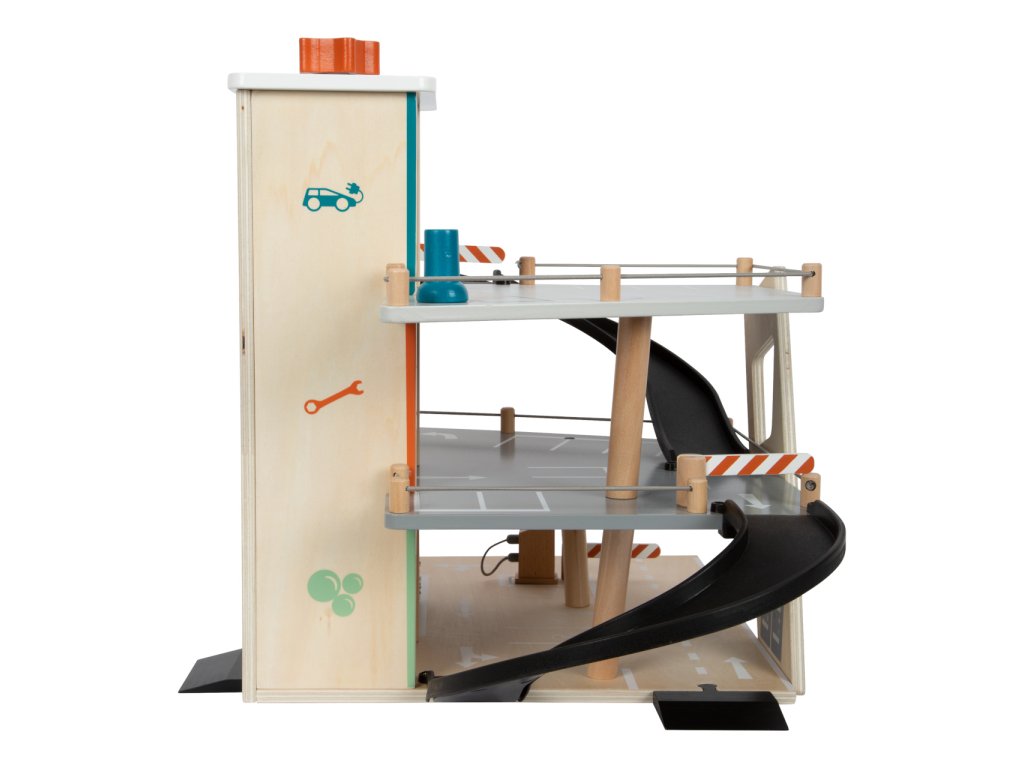 Video je pouze ilustrační, zobrazuje příbuzný produkt. Parkujte, tankujte, myjte nebo opravujte, a to vše s jednou garáží! Nabízí tři bohatě vybavená podlaží propojená atraktivním funkčním výtahem a zábavnými, na sebe plynule navazujícími rampami. Její součástí je dvojice autíček, která mohou při fantastických hrách využít pumpy, nabíjecí stanice, zvedací rampy, nebo myčky s realistickými kartáči. Každá z úrovní je navíc opatřena mechanickou závorou pro dokonale poutavé zážitky. Patra jsou opatřena gumovým hrazením, které dodávají jízdě autíček na dynamice a brání jejich vypadnutí. Garáž je podrobně zdobena mnoha barevnými ikonami a značením, které do her vnese i poučení. Je vyrobena ze silné, pevné a odolné dřevěné překližky s doplňky z masivního dřeva a nezávadného plastu. Výrobek vyžaduje montáž, dodáváno s obrázkovým návodem k sestavení. Hlavní vlastnosti:garáž a 2 autíčka3 podlaží propojená funkčním výtahem a 2 rampamipumpa, nabíjecí stanice, zvedací rampa, myčka a 3 závorykompatibilní s vláčkodráhami a souvisejícím příslušenstvím jiných výrobcůbohatě zdobeno jednoduchými ikonami a značenímpevné a odolné dřevěné provedení