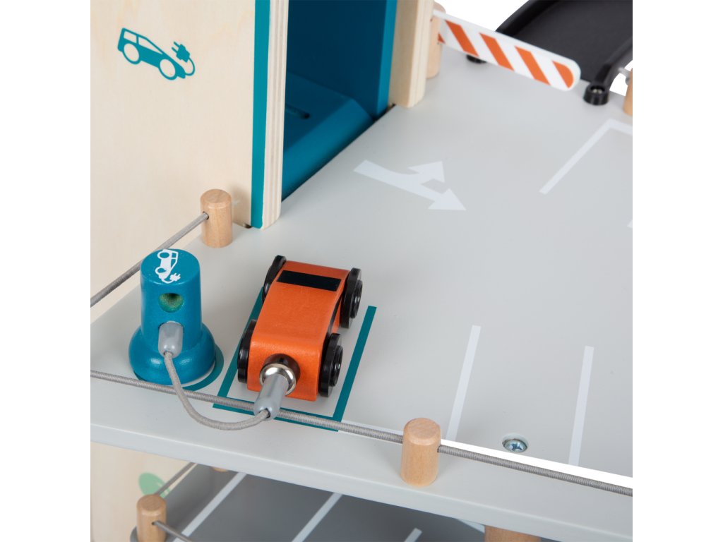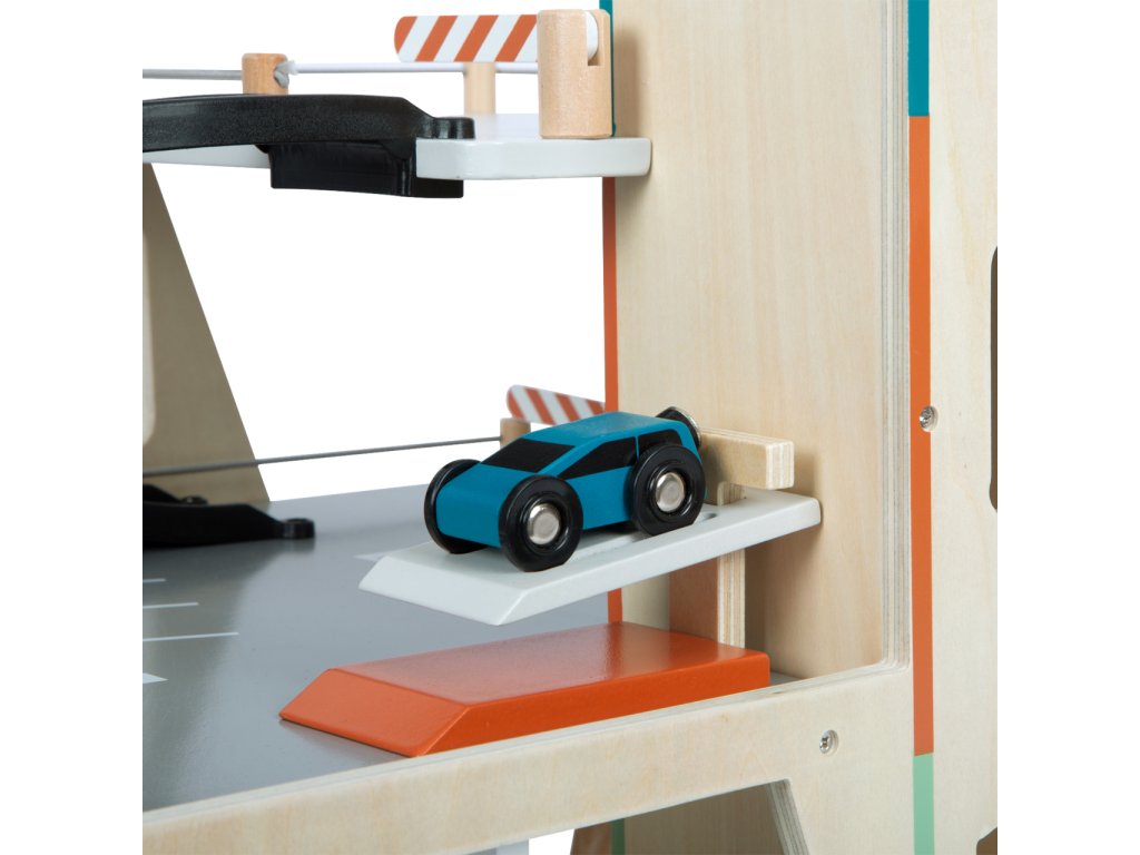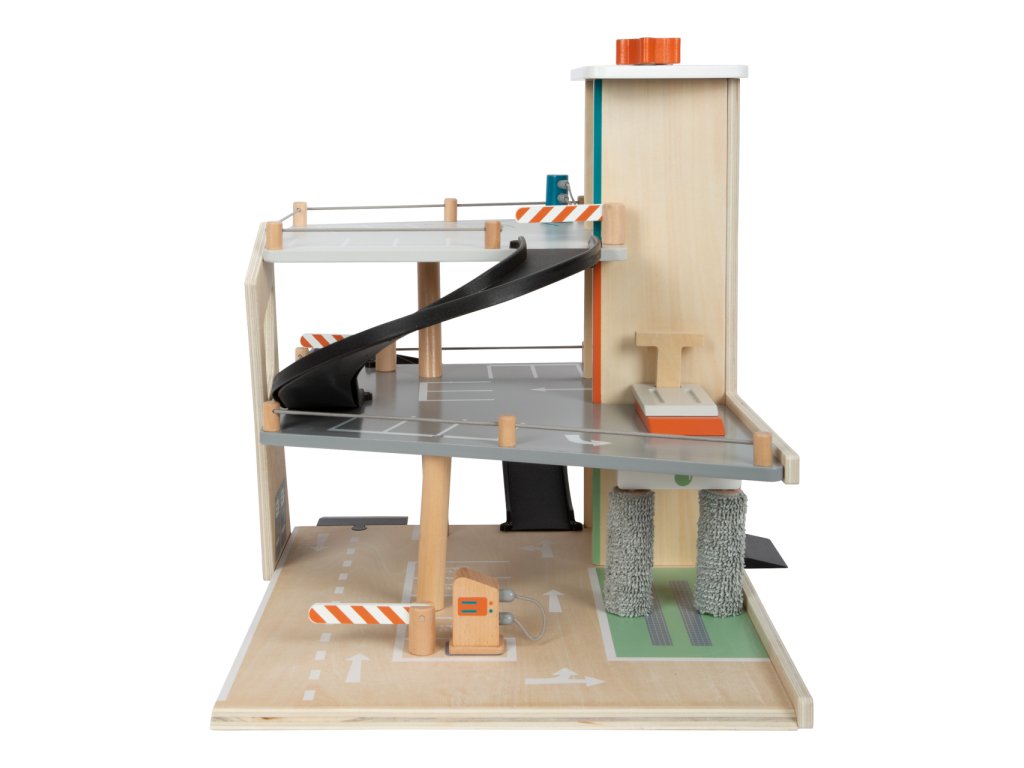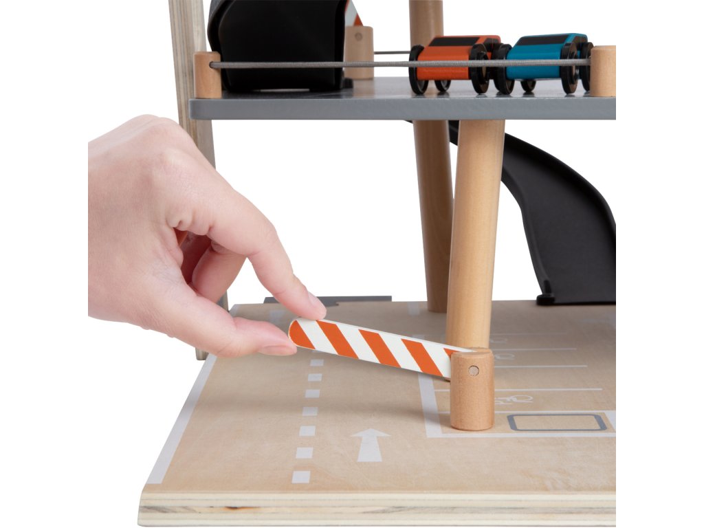 Video je pouze ilustrační, zobrazuje příbuzný produkt. Parkujte, tankujte, myjte nebo opravujte, a to vše s jednou garáží! Nabízí tři bohatě vybavená podlaží propojená atraktivním funkčním výtahem a zábavnými, na sebe plynule navazujícími rampami. Její součástí je dvojice autíček, která mohou při fantastických hrách využít pumpy, nabíjecí stanice, zvedací rampy, nebo myčky s realistickými kartáči. Každá z úrovní je navíc opatřena mechanickou závorou pro dokonale poutavé zážitky. Patra jsou opatřena gumovým hrazením, které dodávají jízdě autíček na dynamice a brání jejich vypadnutí. Garáž je podrobně zdobena mnoha barevnými ikonami a značením, které do her vnese i poučení. Je vyrobena ze silné, pevné a odolné dřevěné překližky s doplňky z masivního dřeva a nezávadného plastu. Výrobek vyžaduje montáž, dodáváno s obrázkovým návodem k sestavení. Hlavní vlastnosti:garáž a 2 autíčka3 podlaží propojená funkčním výtahem a 2 rampamipumpa, nabíjecí stanice, zvedací rampa, myčka a 3 závorykompatibilní s vláčkodráhami a souvisejícím příslušenstvím jiných výrobcůbohatě zdobeno jednoduchými ikonami a značenímpevné a odolné dřevěné provedení