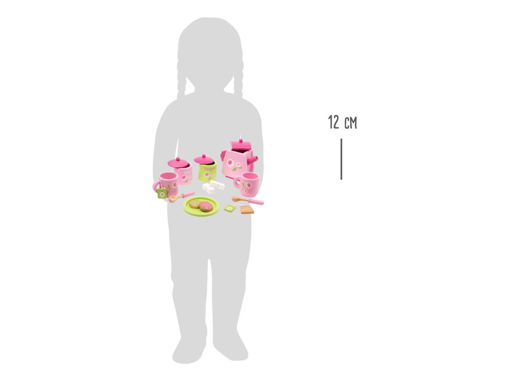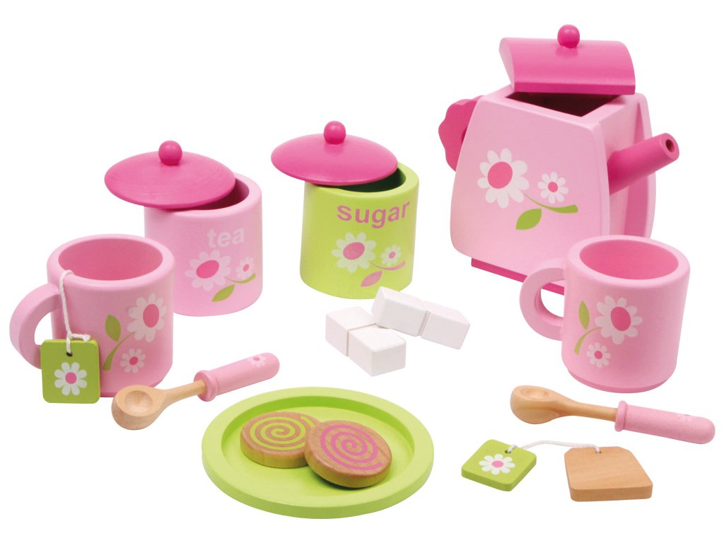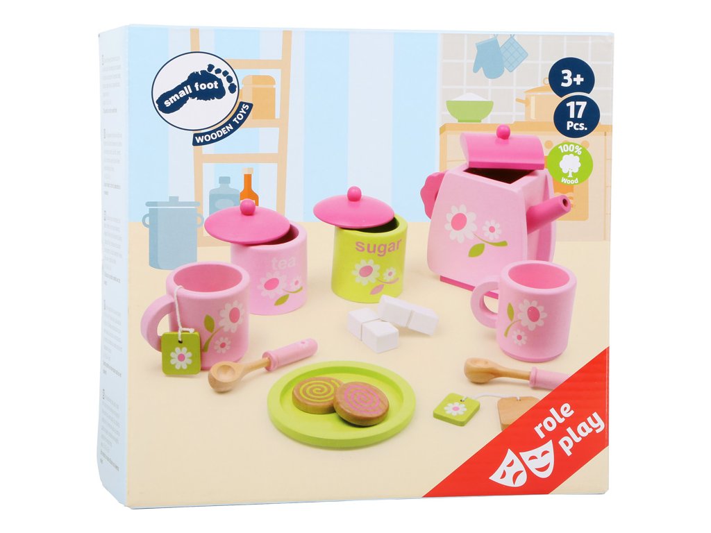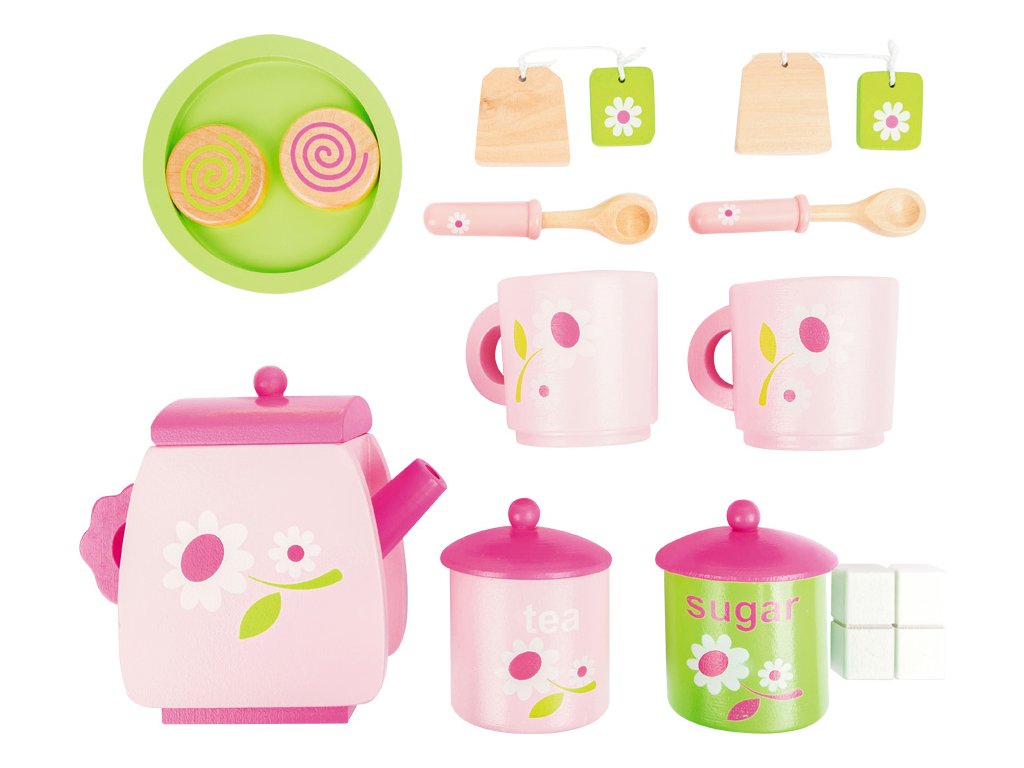 V jemně růžové a pastelově zelené barvě jsou dva šálky s víčkem, konvička, cukřenka a hrnečky na čaj, pastvou pro oči při čajovém dýchánku. Čajový servis s jemnými květinovými motivy doplňují dvě lžičky, dva čajové sáčky, dvě kostky cukru i talíř a dvě sušenky. Konvička, dóza na cukr a čaj mají odnímatelé víko. Hlavní vlastnosti: jemný květinový designpodporuje kreativitu a sociální dovednosti vyrobeno z odolného dřeva pro dlouhotrvající zábavuskvělý doplněk do dětské kuchyňky