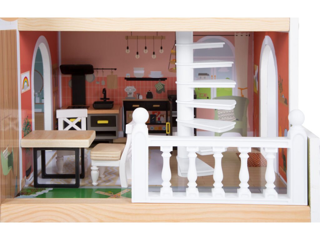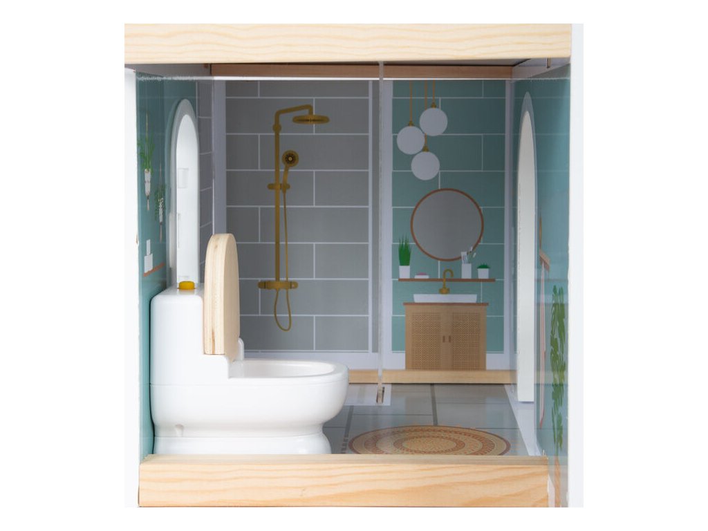 Tento moderní domeček pro panenky má otevřenou přední stranu s krásnými uměleckými detaily a moderním interiérem. Kombinovaná kuchyně s jídelním koutem, ložnicí, koupelnou a také malou terasou s posezením. Perfektní hračka pro představivou hru dětí. Otevřené bydlení s točitým schodištěm, otevíratelnými okny, moderní koupelnou v přízemí, s plexisklem. Najdete zde také 8 ks nábytku, textilní doplňky jako např. povlečení a polštáře. Velká terasa s posezením, otevíratelná toaleta, kuchyňské skříňky a lednice s dveřmi, také šuplíky zajistí realistickou hru. Lavice i postel mají textilní polštáře, postel také peřinu. Tato vila pro panenky se bude hodit do každého obývacího i dětského pokoje a to díky světlé fasádě a moderním barvám. Díky otevřené straně si s domečkem může hrát několik dětí najednou. Vhodné pro panenky do 12 cm. Hlavní vlastnosti: 3 pokoje, terasa, zahrádkafunkční nábytek z plastu s dřevěnými detailysvětlý exteriér a moderní barevné schémakompaktní a stabilní dřevěný domeček s mnoha detaily zevnitř i zvenku2 poschodí spojená točitým schodištěmmoderní design interiéru, otevíratelná okna, stěna sprchy z plexisklakompatibilní s postavičkami LE11804