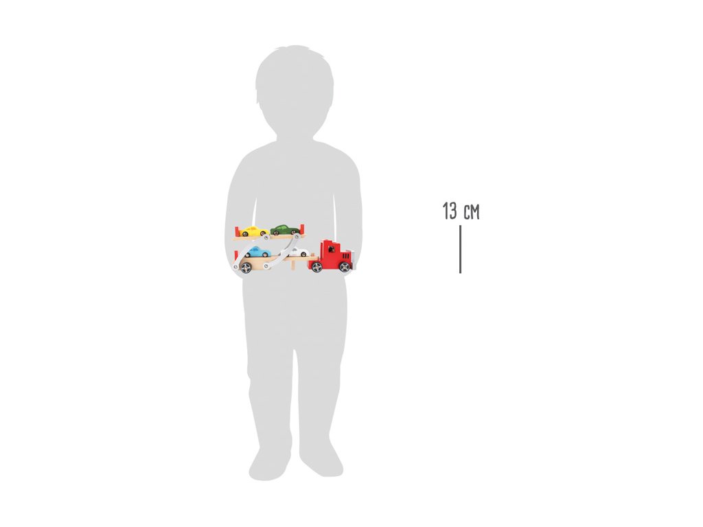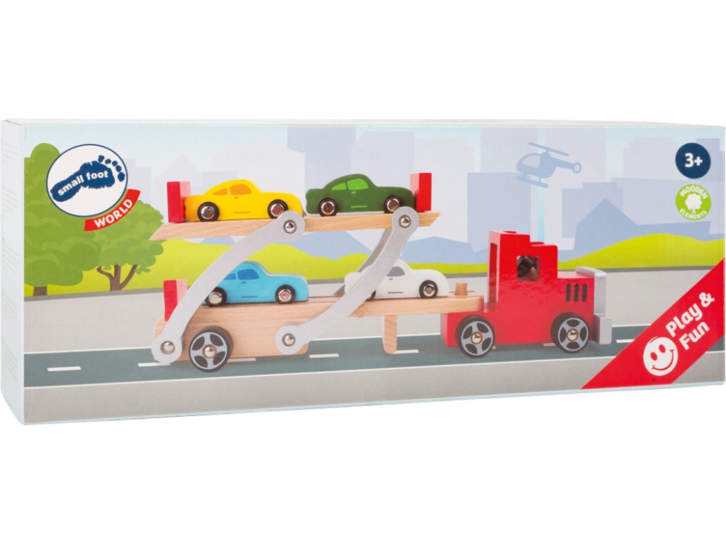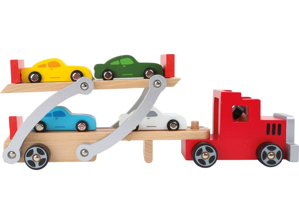 Pozor, zde se nakládají břemena! Chcete-li převézt nové modely aut z místa A na místo B, budete určitě potřebovat tento auto-přepravník. Naložit lze čtyři auta. Dřevěná auta mohou pohodlně vyjet na nákladní rampu. Zvednutá plocha opatřena závorou zabrání nechtěnému couvnutí aut. Včetně čtyř dřevěných aut v designu sportovních vozů. Přívěs se připojí k tahači a vše je připraveno na dlouhou a bezpečnou cestu. Ideální pro fanoušky aut a skvělý doplněk do vozového parku autíček v dětském pokoji. Hlavní vlastnosti: vyrobeno z robustního dřeva v pestrobarevném provedení pohyblivá horní plošina pro snadné nakládání a vykládání včetně čtyř autíček
