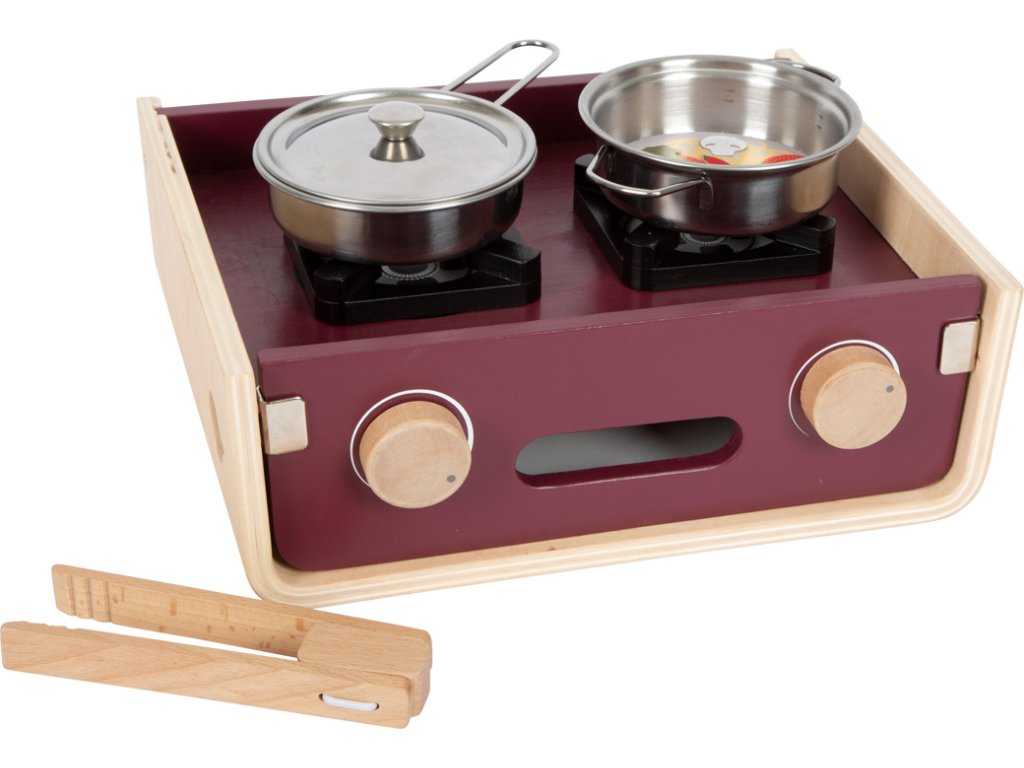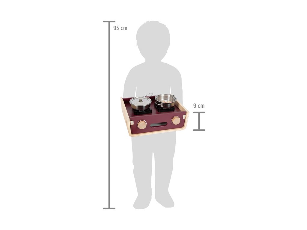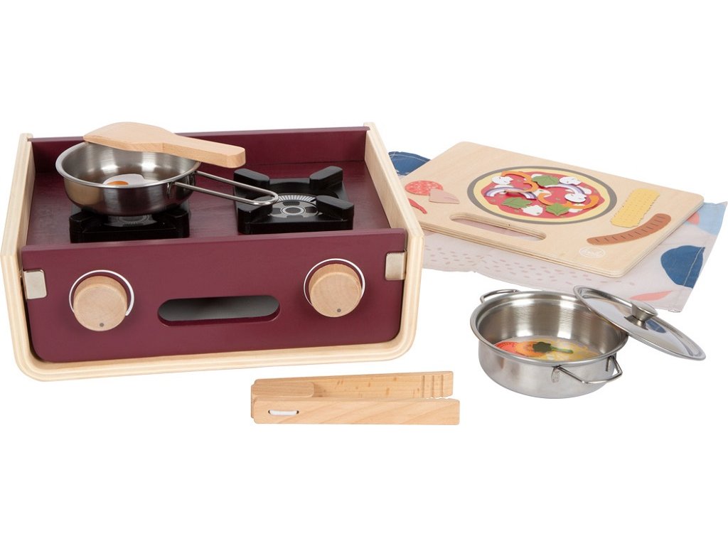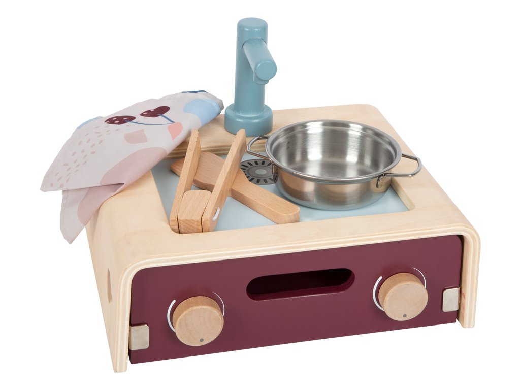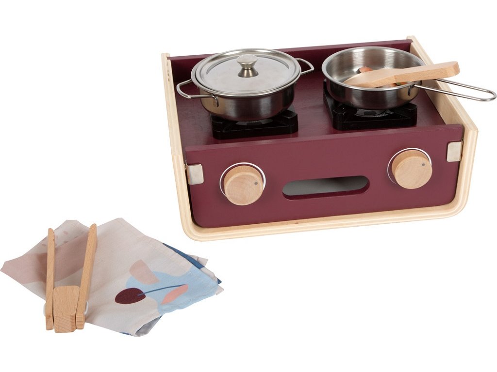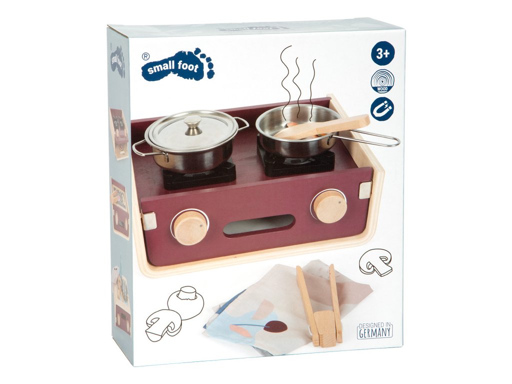 Tento mobilní sporák působí skvělým dojmem pro svou multifunkčnost. Kombinuje stolní kuchyni, kempingový vařič, gril, umyvadlo a troubu. Nabízí prostor pro nápadité hry a rozmanité herní scénáře. Moderní barvy ve spojení s přírodním ohýbaným dřevem dělají z této kuchyňky absolutní poutač. Obsahuje praktickou rukojeť (lano) pro přenášení. 2 kartonové listy obsahují potraviny/ingredience potřebné pro vaření. Součástí je také kuchyňská utěrka, pánev, hrnec s poklicí, grilovací kleště a dřevěná obracečka a samozřejmě obsahuje také oboustrannou troubu na pečení (vrch a spodek slouží buď jako vařič nebo umyvadlo). Hlavní vlastnosti: rozvíjí představivost a kreativitupodporuje komunikaci a sociální schopnosti
