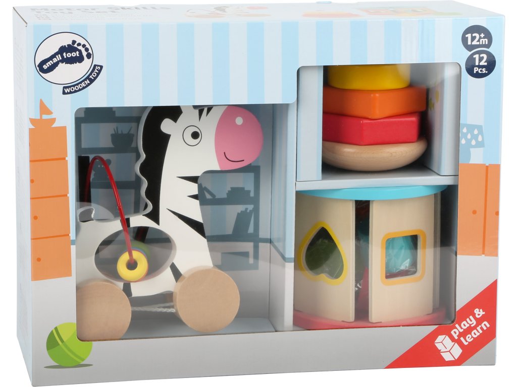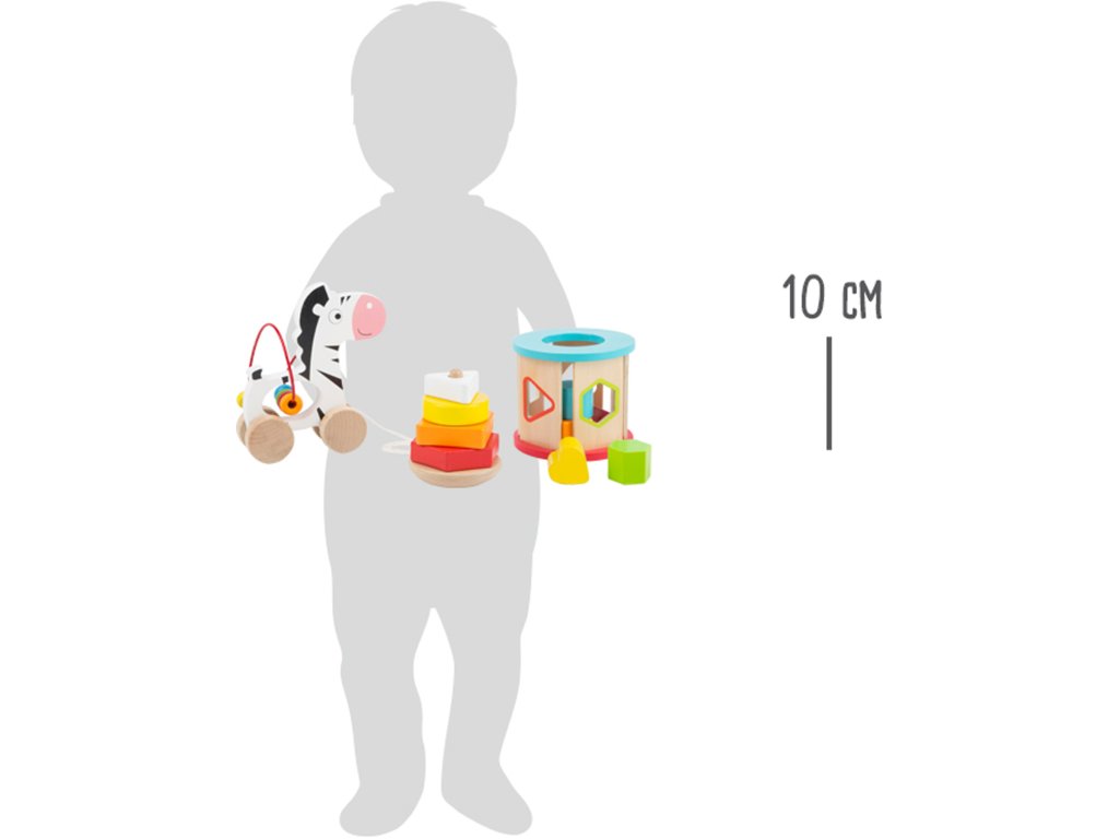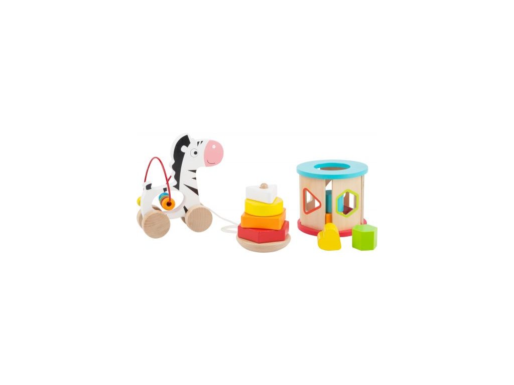 Rozmanitá hrací sada pro motorický rozvoj nejmenších potěší svými pestrými barvami a zpracováním. Tahací zebra je opatřená provázkem a integrovanou korálkovou dráhou. Stohovací hra má vypouklou základnu, a tak stále balancuje. Vkládací základní tvary lze umisťovat do válce z překližky a při kutálení se rozezní chrastivými zvuky. Hlavní vlastnosti: sada 3 dřevěných hraček pro motorické aktivityjezdící zebra, vkládací a stohovatelná hraobsahuje 12ks