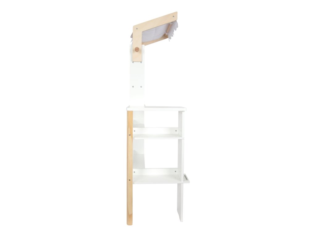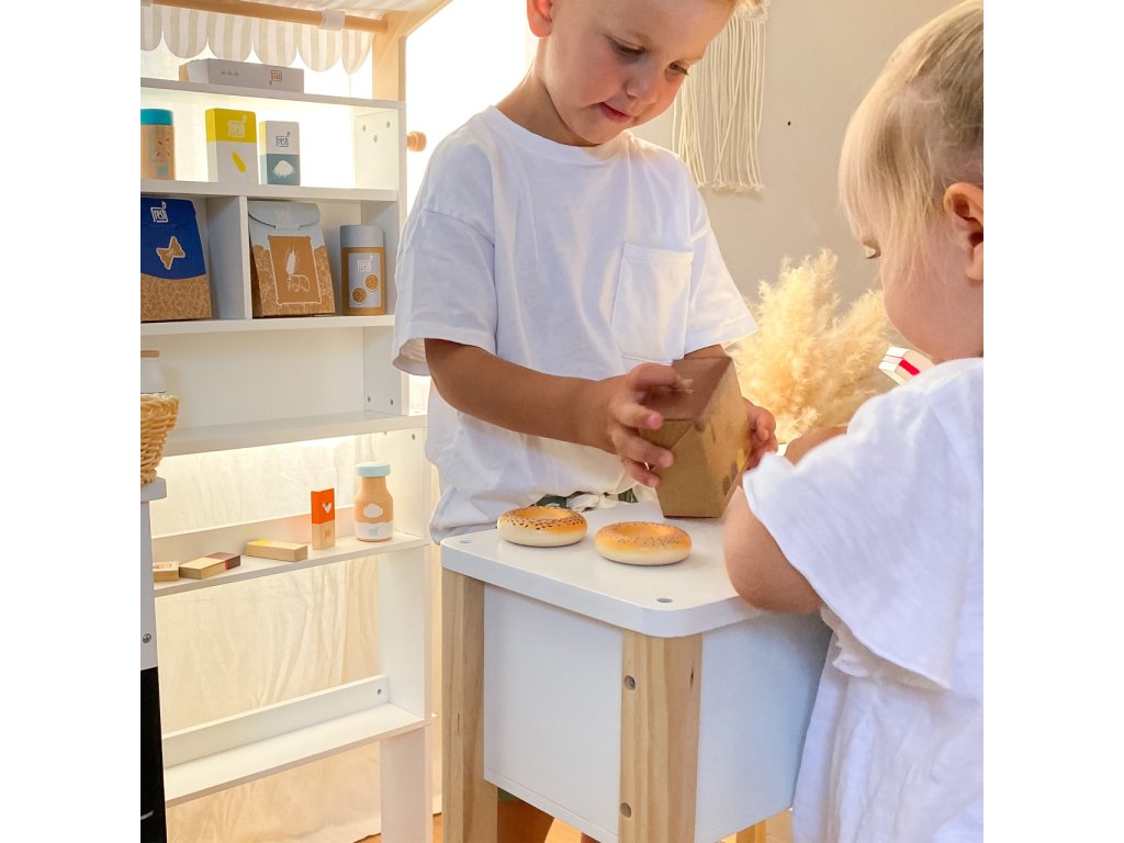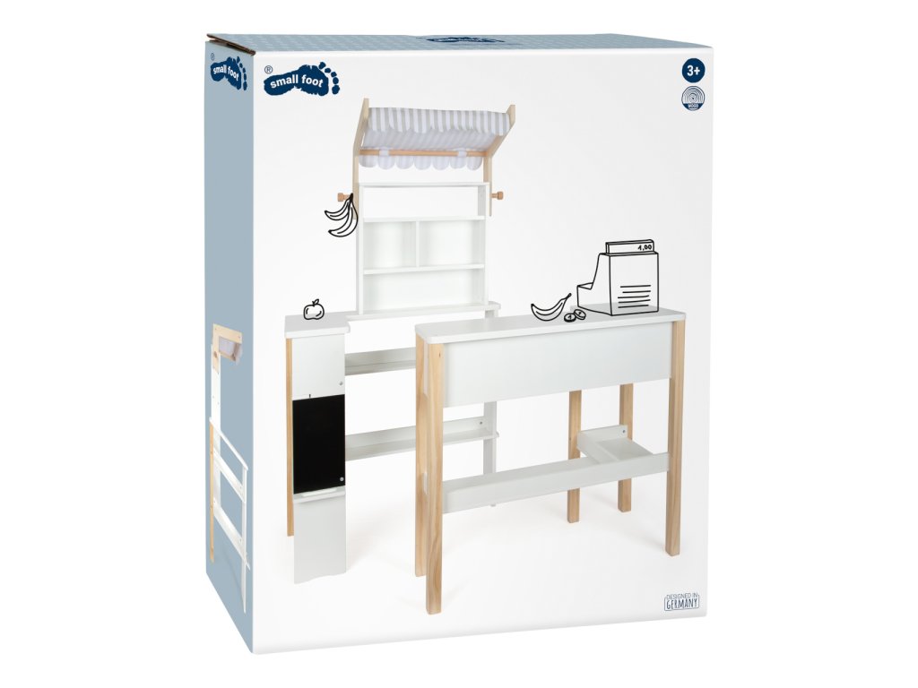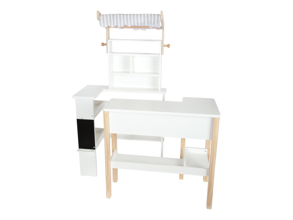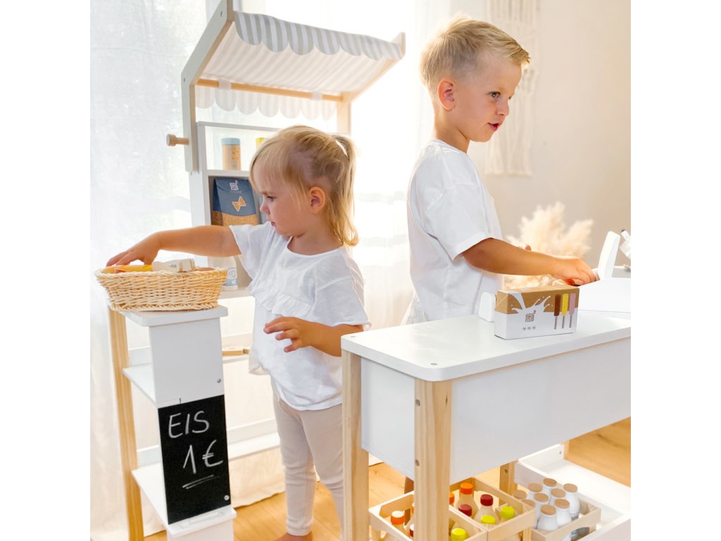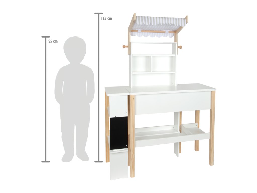 Kompaktní, modulárně konstruovaný obchod s odnímatelnou látkovou markýzou, můžete flexibilně začlenit do dětského pokoje. Díky kombinaci neutrální bílé a přírodního dřeva, krásně zapadne do každého dětského pokoje. Včetně popisovatelná tabule s policí na křídu. Látková markýza mu dodává typický vzhled obchodu . Zaoblené hrany pultu poskytují dodatečnou bezpečnost. Neobsahuje příslušenství. Hlavní vlastnosti: moderní a jednoduchý severský designrozvíjí komunikační a sociální dovednosti dětíčásti lze po hře přisunout k soběvhodný k ostatním hračkám z produktové řady Fresh