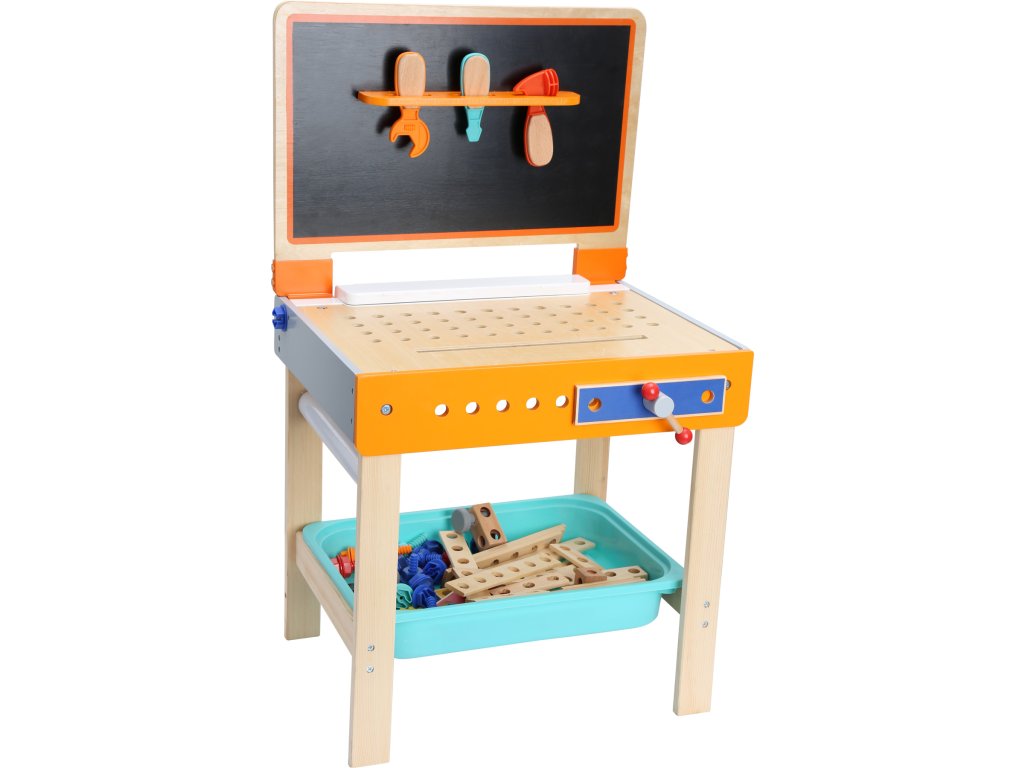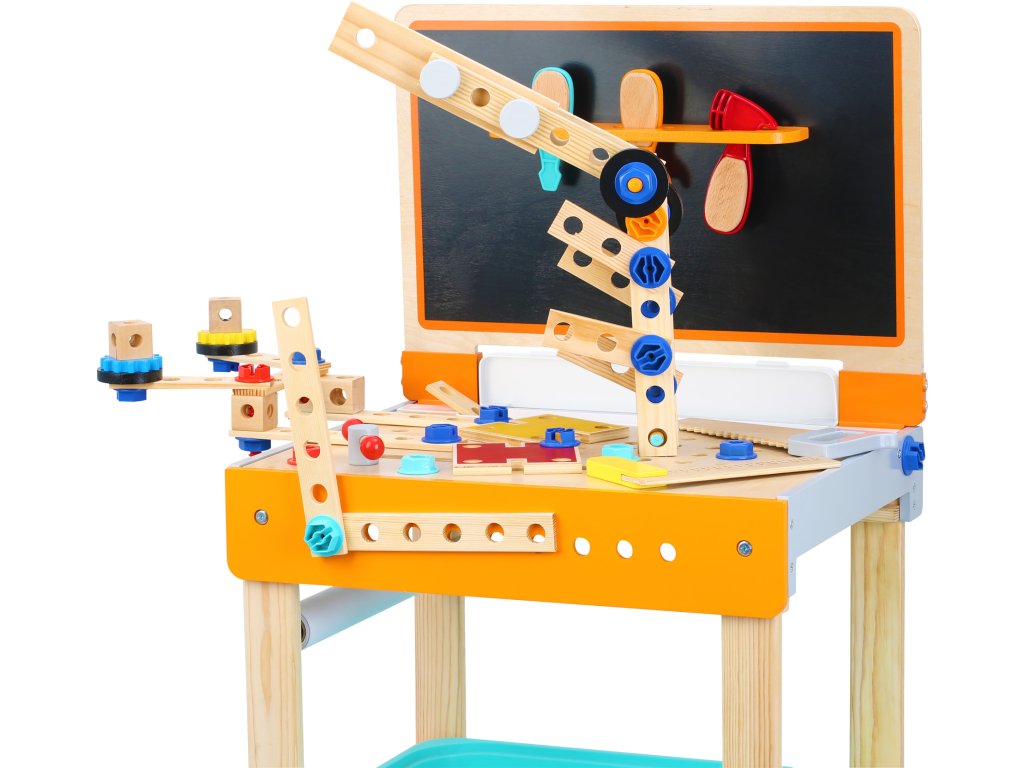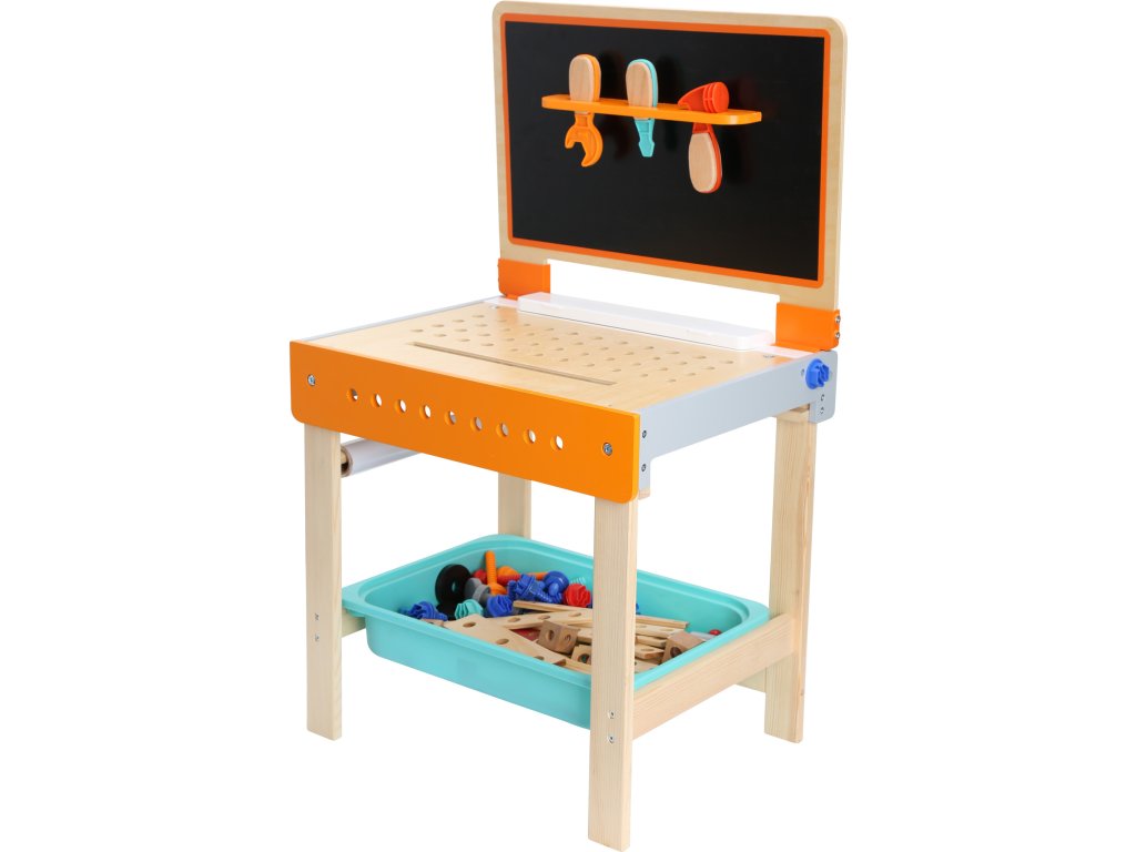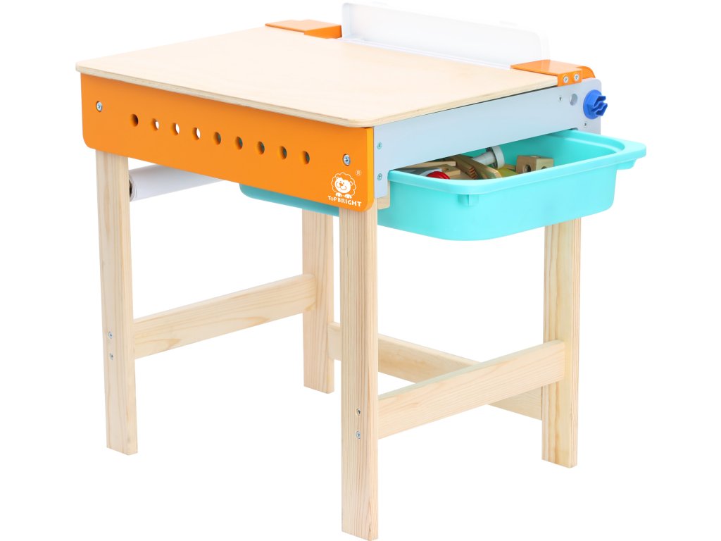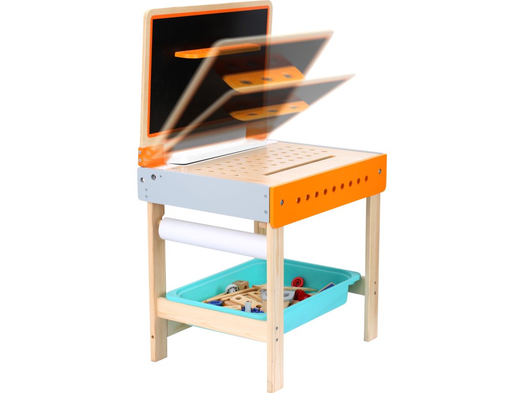 Multifunkční pracovní stůl s sklápěcím panelem nabízí možnost využít stůl k malování nebo jako pracovní ponk. Stůl je vybaven sklápěcím kreslícím panelem s policí na nářadí, pracovní plochou s otvory pro uchycení, v boční části je prostor pro papírovou roli na kreslení, úložným boxem na součástky. Skládací komponenty jsou součástí balení. Hlavní vlastnosti: pevná konstrukceinspiruje ke kreativní a představivé hřerozvíjí obratnost a koordinaci