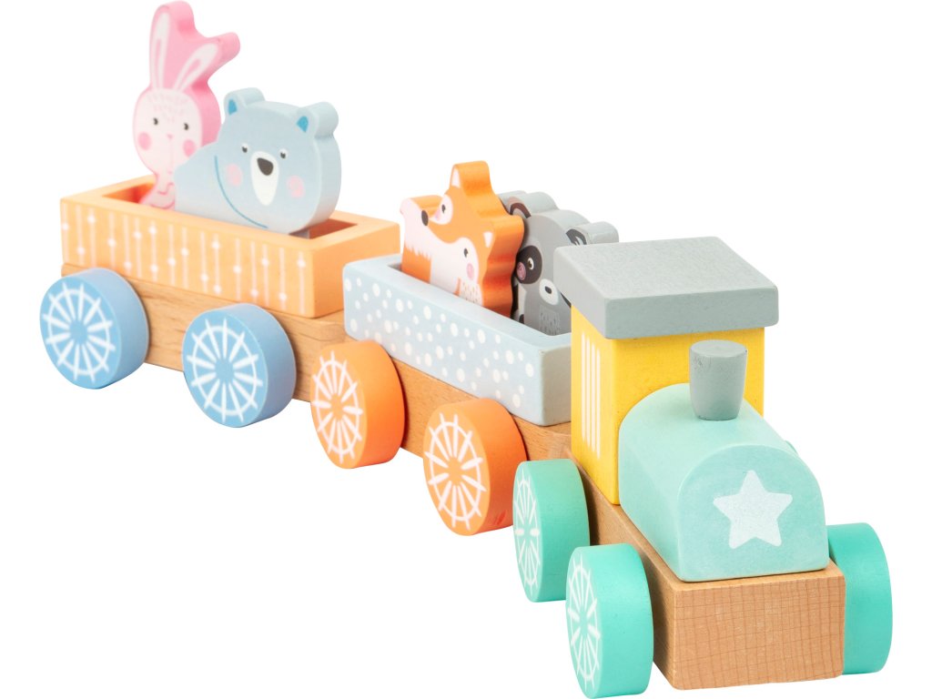 Hú, hú, přijíždí vlak! Tento vláček v pastelových barvách veze veselé pasažéry. Dva vagóny můžete jednoduše spojit. Malá lokomotiva se skládá z podvozku a dvou nasazovacích kostek. V balení také barevná liška, zajíc, mýval a medvěd, kteří už čekají na odjezd vlaku. Hlavní vlastnosti: 1 lokomotiva, 2 vagónyfigurky zvířátekdřevěná hračka v pastelových barvách