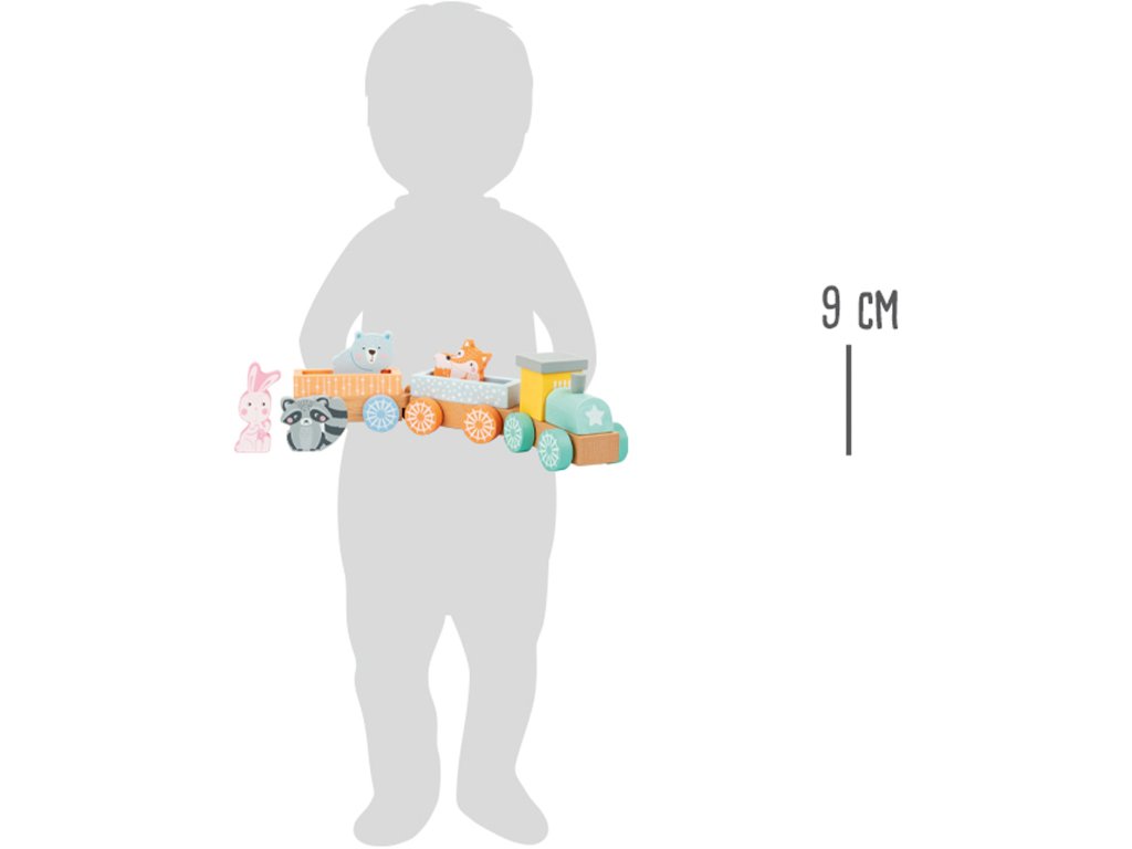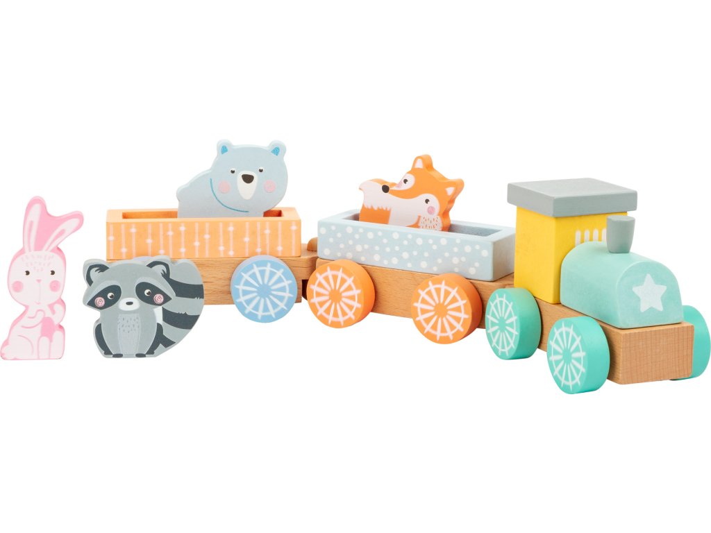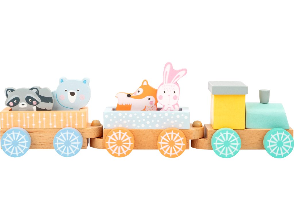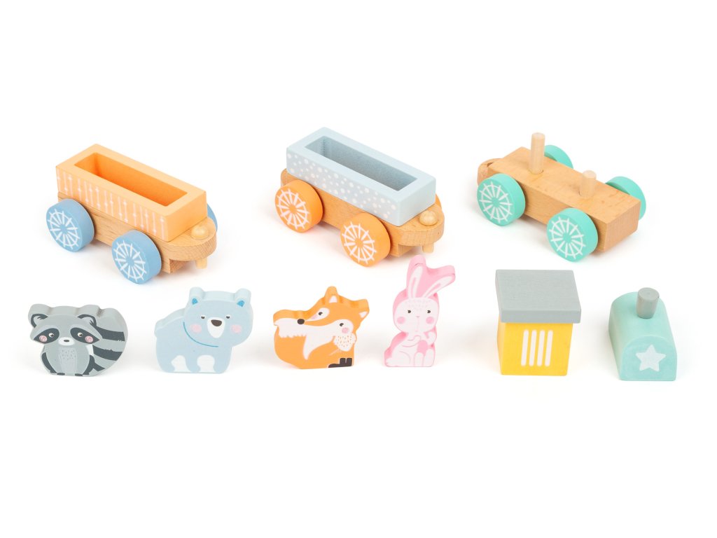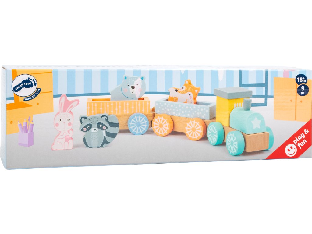 Hú, hú, přijíždí vlak! Tento vláček v pastelových barvách veze veselé pasažéry. Dva vagóny můžete jednoduše spojit. Malá lokomotiva se skládá z podvozku a dvou nasazovacích kostek. V balení také barevná liška, zajíc, mýval a medvěd, kteří už čekají na odjezd vlaku. Hlavní vlastnosti: 1 lokomotiva, 2 vagónyfigurky zvířátekdřevěná hračka v pastelových barvách