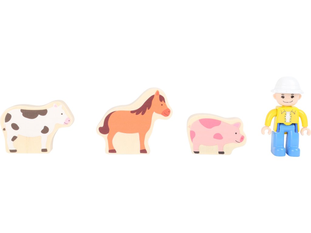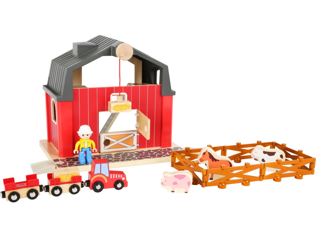 Vzrušující život na venkově! S touto farmou mohou děti zažít den plný zážitků s farmářem a jeho zvířaty. Farma ze dřeva a plastu obsahuje stodolu s dvojitými vraty, traktor s přívěsem a balíky sena, které lze přemisťovat pomocí magnetů. Sadu doplňuje kůň, kráva, prasátko a šest dílů ohrady. Budova stodoly má funkční jeřáb, kterým může farmář traktorem přivezené balíky sena uskladnit v suchu druhého patra. Posledním večerním úkolem je nakrmení zvířat, které jste dovedli z polí do stáje. Nezapomeňte zavřít bránu! Na tomto statku je opravdu živo, a tak si děti užijí spoustu rozmanité zábavy. Hlavní vlastnosti: sada obsahuje 19 dílůpodporuje představivost, obratnost a koordinaci