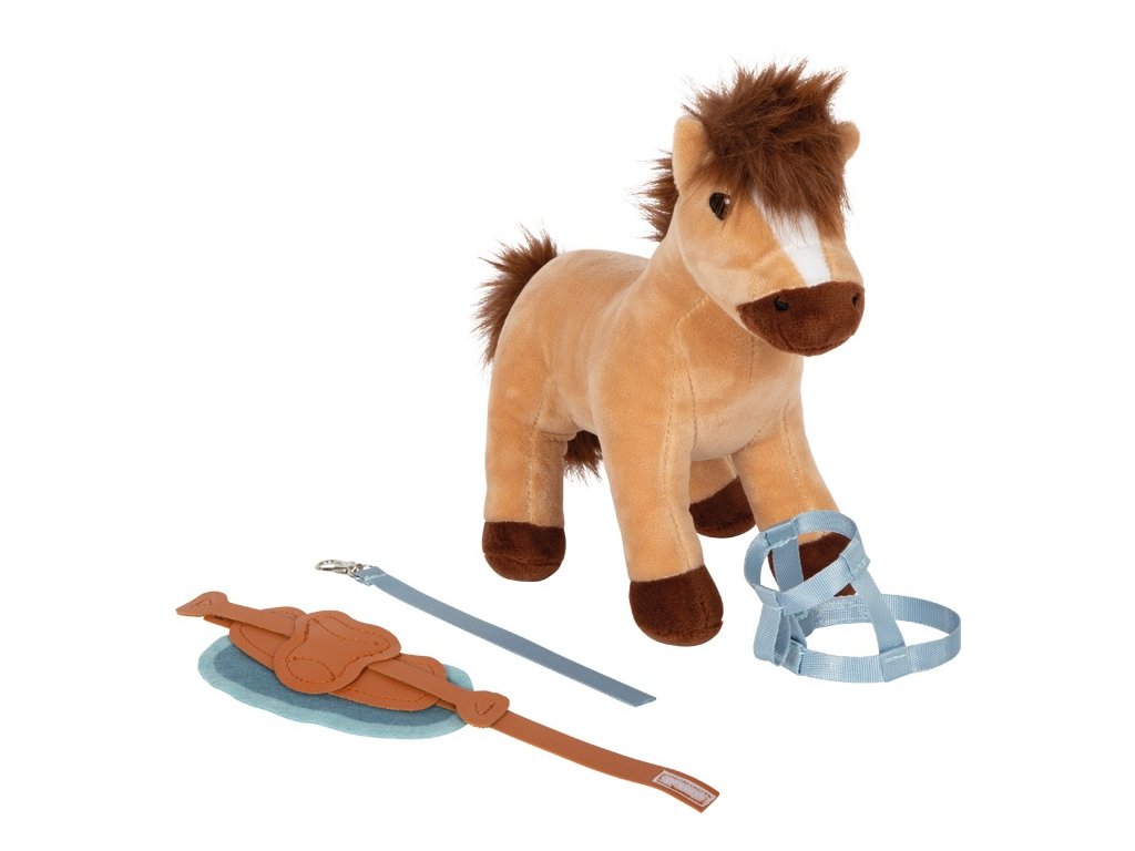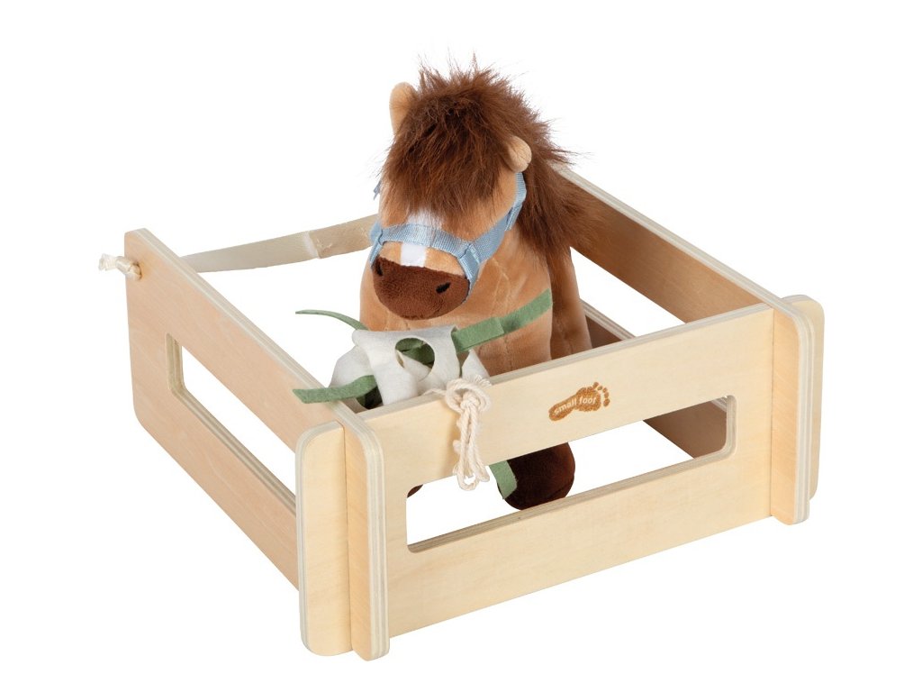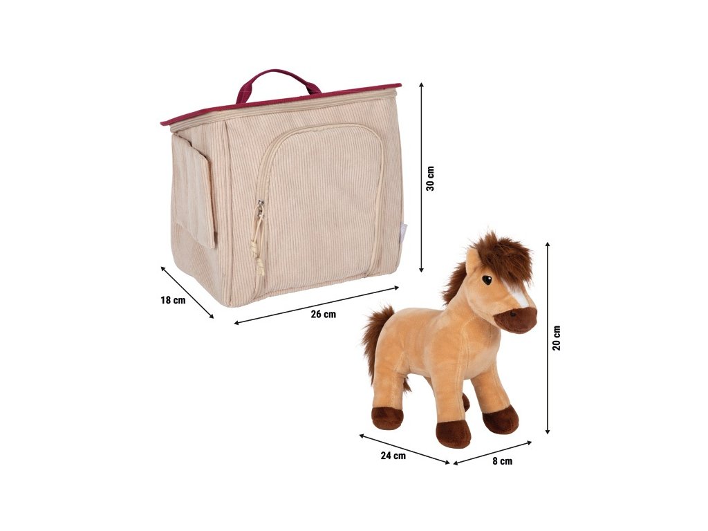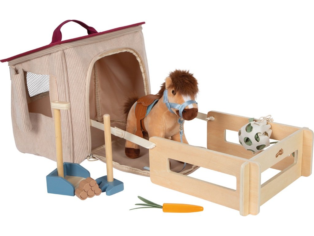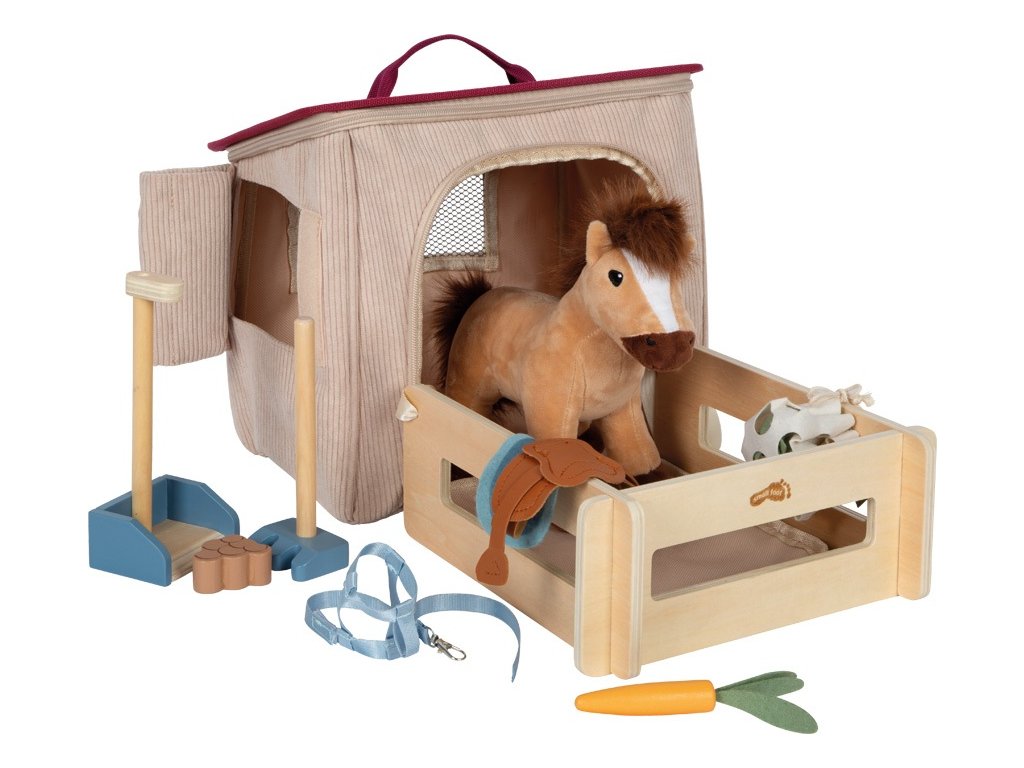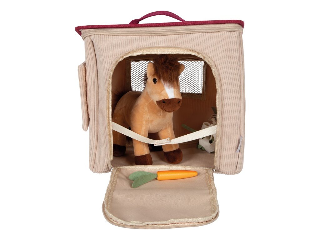 Nasedat a hrajeme si! Tento nádherně zpracovaný set s tématem koní a ježdění má vše, co malí milovníci koní potřebují ke štěstí! Hlavní roli hraje roztomilý plyšový koník, který bydlí v pevné manšestrové tašce. A teď pozor! Díky zipům se taška během chvilky promění ve stáje a zároveň slouží jako praktické úložiště pro všechno příslušenství! Ohrádku s připevněním na suchý zip můžete sestavit před stájemi, nebo ji uzavřít do kruhu jako výběh, hra tak působí opravdu realisticky. Součástí setu je: sedlo, dečka a uzdečka,mrkvička a síť na seno pro krmení a dokonce i "mistička na bobky" s hráběmi, lopatkou a dřevěnými koblížky. Sen každého malého milovníka koní: detailní hrací set, který spojuje kreativní hraní s realistickými prvky. Připravený ke hře hned po vybalení, ideální i na cesty! Hlavní vlastnosti: celá herní sada v tašcepodpoří dětskou fantaziipodporuje jemnou motoriku včetně doplňků a příslušenství