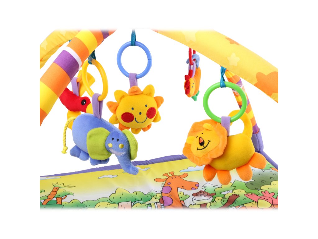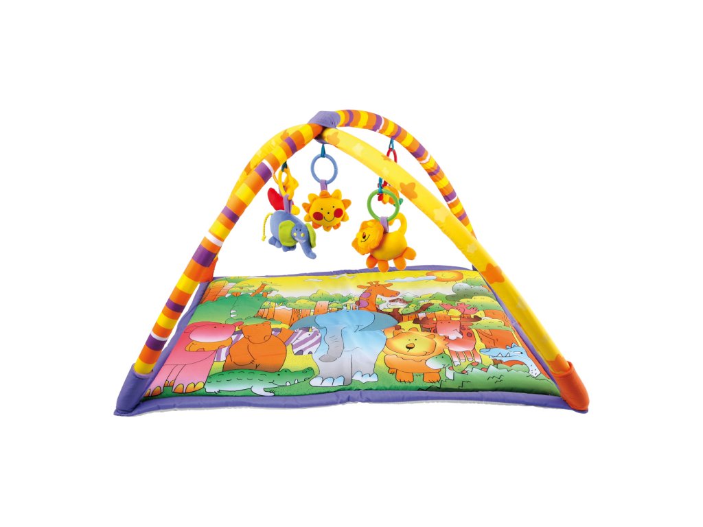 Kdo by nechtěl dovádět obklopený těmi nejroztomilejšími zvířátky! Příjemně měkká pestrobarevná podložka zdobená zvířecími motivy umožňuje nejmenším pohodlně ležet a hrát si s plyšovými hračkami pod klenbou z měkkých a pružných podpěr. Poutavé hračky různě chrastí, nebo pískají, přispívají tak k vývoji dětských smyslů a motoriky, motivují a postupně učí děti sedět. Jsou zavěšené na rozevíratelných kroužcích umožňujících jejich odepnutí, děti tak mohou mít své oblíbence vždy u sebe. Podložka je skladná a snadno rozložitelná, balená a dodáváná v praktické, snadno přesnosné plastové tašce. Hlavní vlastnosti: příjemně měkké, bezpečné a pohodlné provedení5 odnímatelných plyšových hračekzvukové efekty chrastění a pískánípraktické balení
