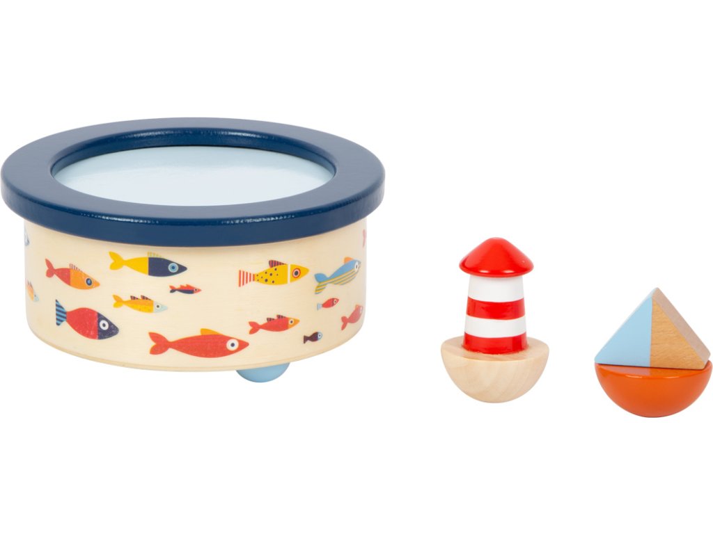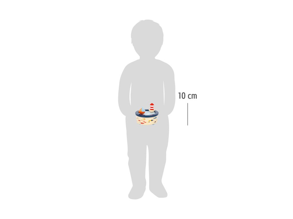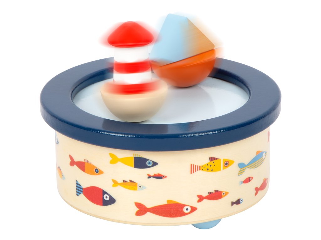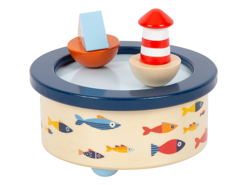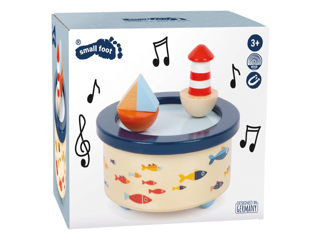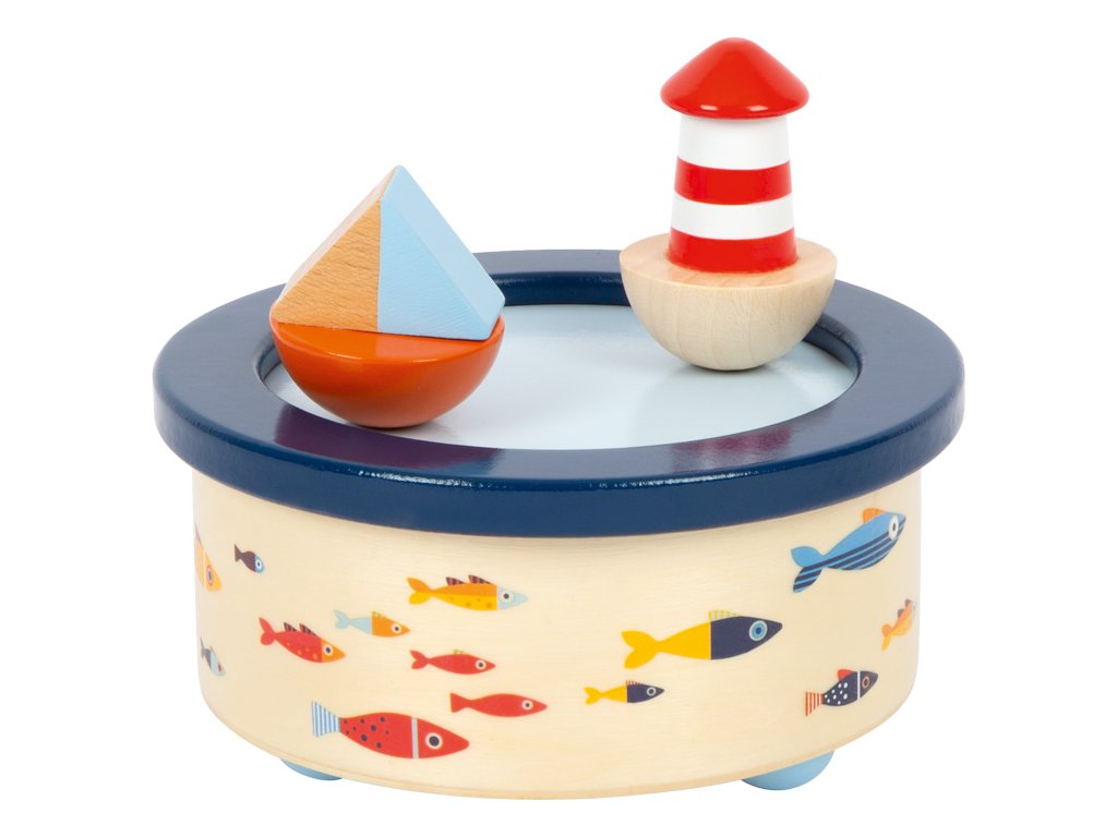 Hrací skříňka s mořským designem děti uspí německou ukolébavkou. Maják a plachetnice se pohybují do kolečka v rytmu melodie. Obě dřevěné figurky lze ze skříňky oddělit, drží za pomoci magnetu. Děti mohou hudební skříňku natáhnout jednoduše samy, procvičí si při tom jemnou motoriku. Materiál příjemný na dotek, zaoblené hrany pro bezpečnost dětí. Kvalitní potisk a moderní barvy, bude se hodit do každého pokojíčku. Hlavní vlastnosti: Figurky se pohybují v rytmu ukolébavkyTrénuje jemnou motorikuZaoblené hrany