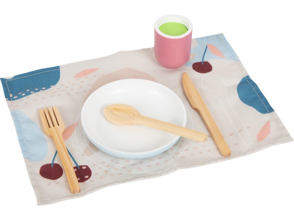 Moderní sada nádobí včetně talířů, šálků, příborů a prostírání pro dvě osoby. Vysoce kvalitní zpracování z robustního a odolného dřeva, které je vyrobeno tak, aby vám vydrželo. Nabízí další učební efekty s tištěným prostíráním, které ukazují, jak správně prostřít stůl. Moderní vzhled s lineárními tvary a kombinací přírodního dřeva s trendy barvami kouřově modré a bobulově červené. Dokonalá harmonie barvy a designu s kolekcí Tasty kde naleznete dětskou kuchyňku a další kuchyňské produkty. Pro obzvláště realistickou zábavu při hraní na role v dětské kuchyňce. Podporuje rozvoj jemné motoriky, sociálních dovedností a dalších každodenních dovedností. Díky vyváženému designu a modernímu barevnému schématu se obzvláště dobře hodí do moderního prostředí dětského i obývacího pokoje. Hlavní vlastnosti: Podporuje rozvoj jemné motoriky a sociálních dovedností Obsahuje 12 dílů