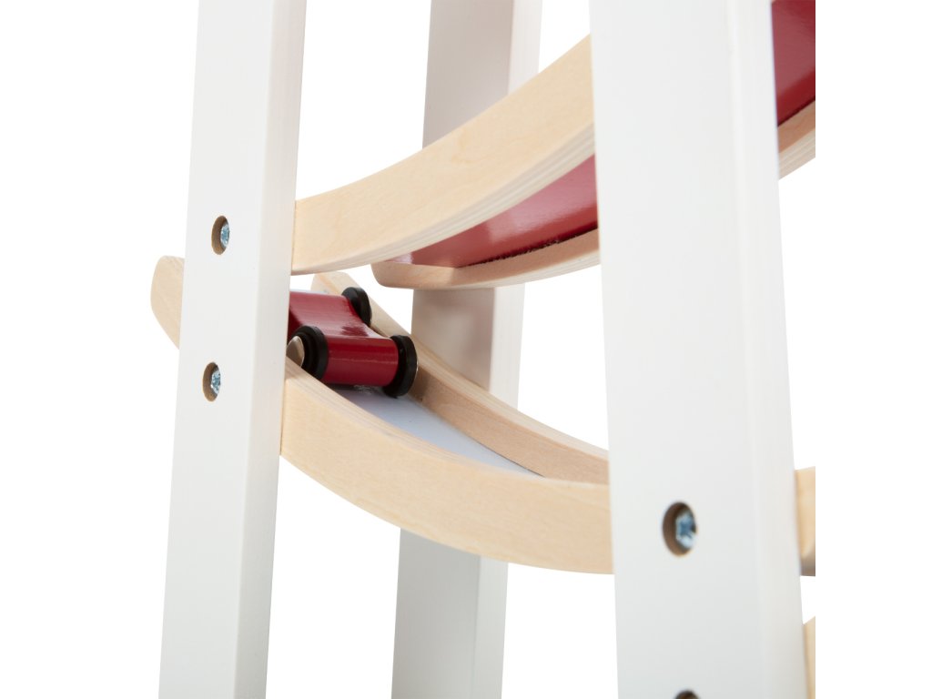 Na značky, připravit, start! Tato dřevěná kaskádová závodní dráha nabízí prostor pro změření rychlosti 4 autíček. Z jednoho patra na druhé, autíčka dělají přemety a jen koukat na ně je zábavné. Dráha je vyrobena z přírodního a bílého dřeva, jedno autíčko je přírodní, zbylé 3 jsou barevné. Hračka rozvíjí motoriku dětí, také koordinaci ruka-oko. Hlavní vlastnosti Přírodní dřevo s barevnými detailyOboustranná autíčka s pogumovanými kolyRozvíjí motoriku a koordinaci ruka-oko