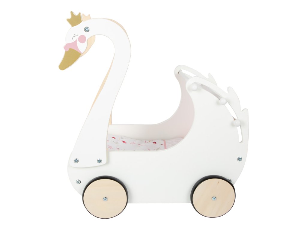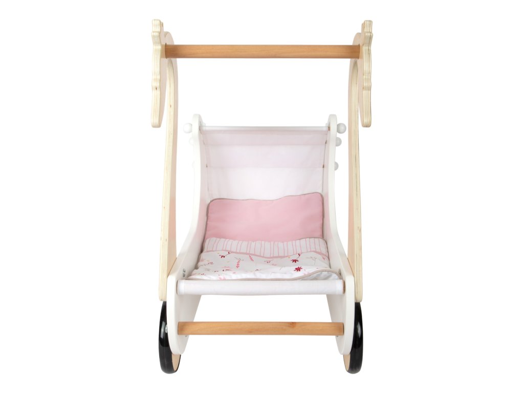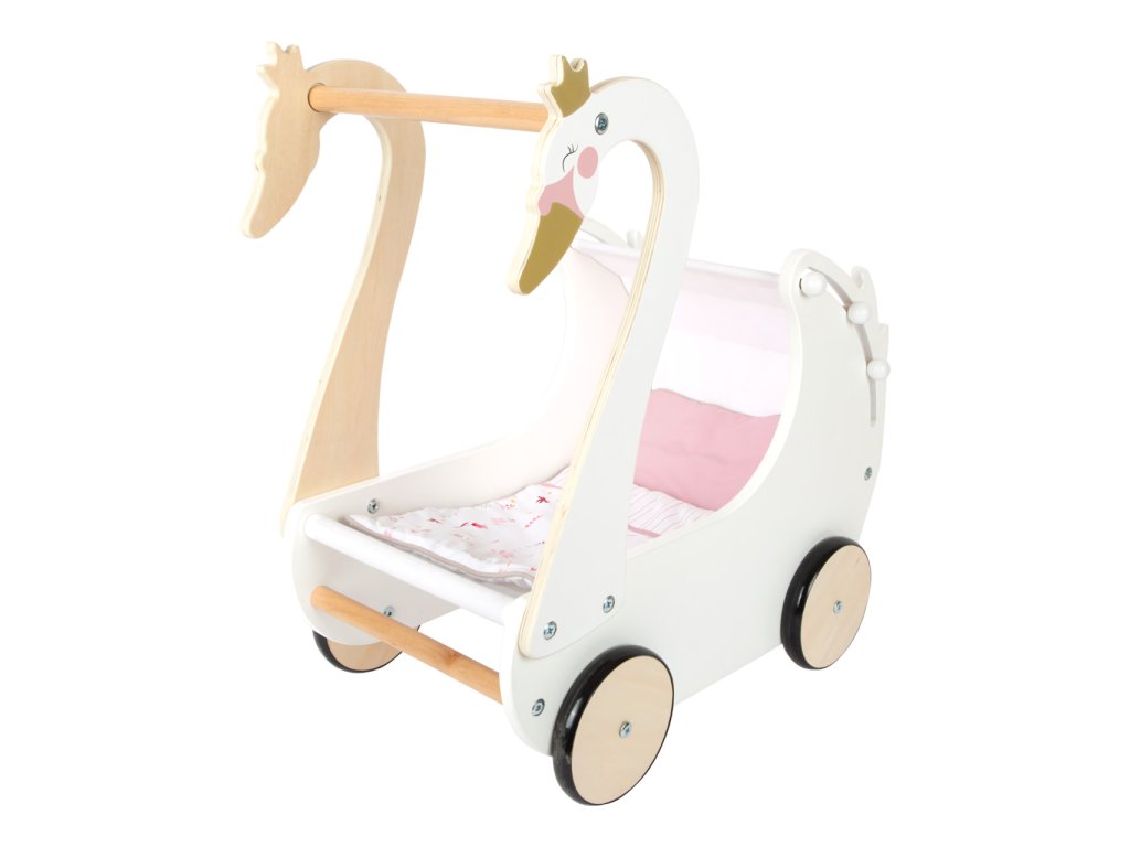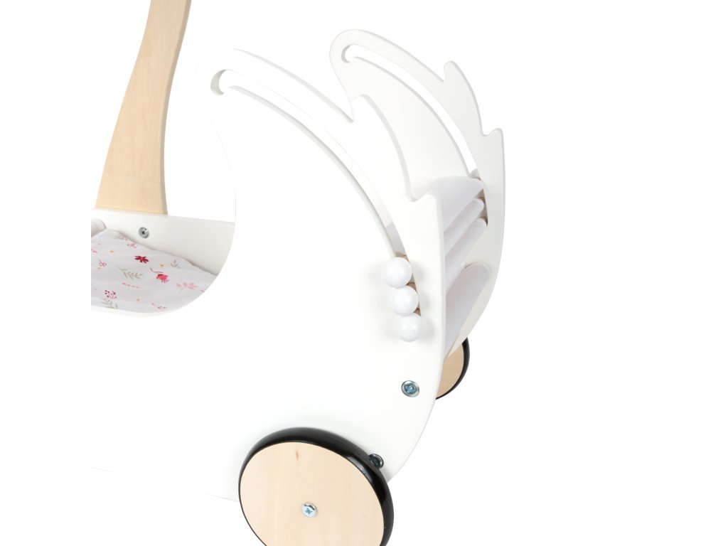 Pečujte o panenky s labutí elegancí! Nechejte děti rozvíjet fantazii a sociální dovednosti. Svou vytříbenou barevností a jednoduchými tvary kočárek hravě doplní každý dívčí pokoj. Pojme i panenky nadměrných velikostí, je vybaven stahovatelnou látkovou stříškou a dodáván s květovaným růžovo‑bílým ložním prádlem. Pogumovaná kolečka nabízí kultivovaný tichý chod na všech typech povrchů a šetří je. Konstrukce kombinuje odolnou překližku a na dotek zvláště příjemné masivní dřevo. Výrobek vyžaduje montáž, dodáváno s detailním návodem k sestavení. Hlavní vlastnosti: kočárek včetně ložního prádlapro panenky s výškou do 46 cmstahovatelná stříškatichý chododolné dřevěné provedení