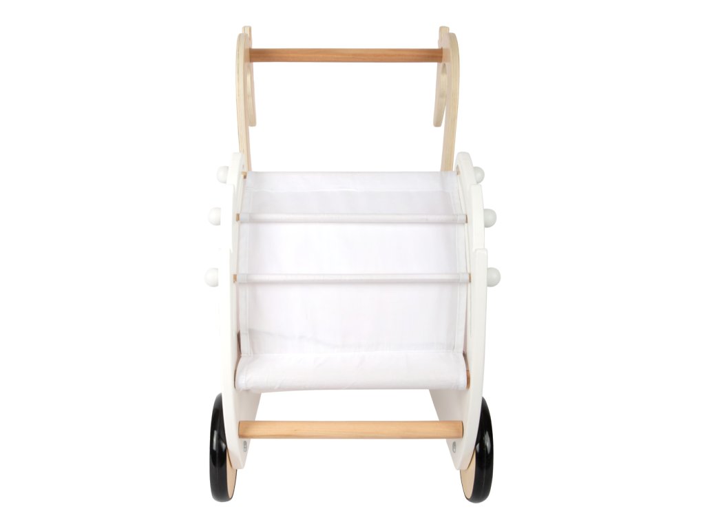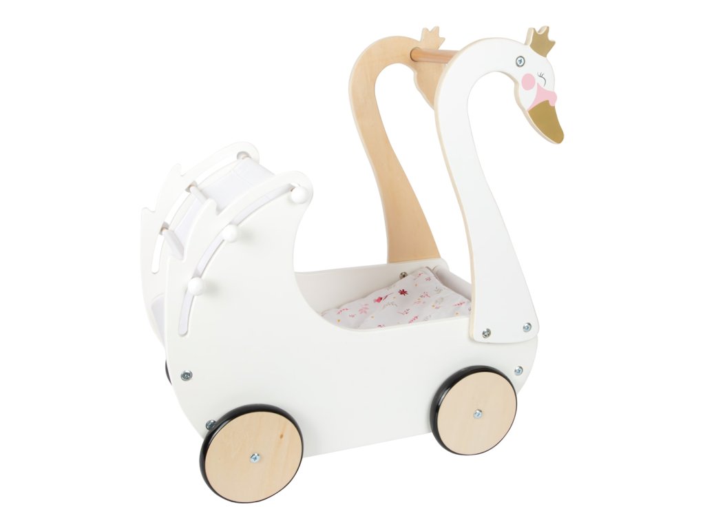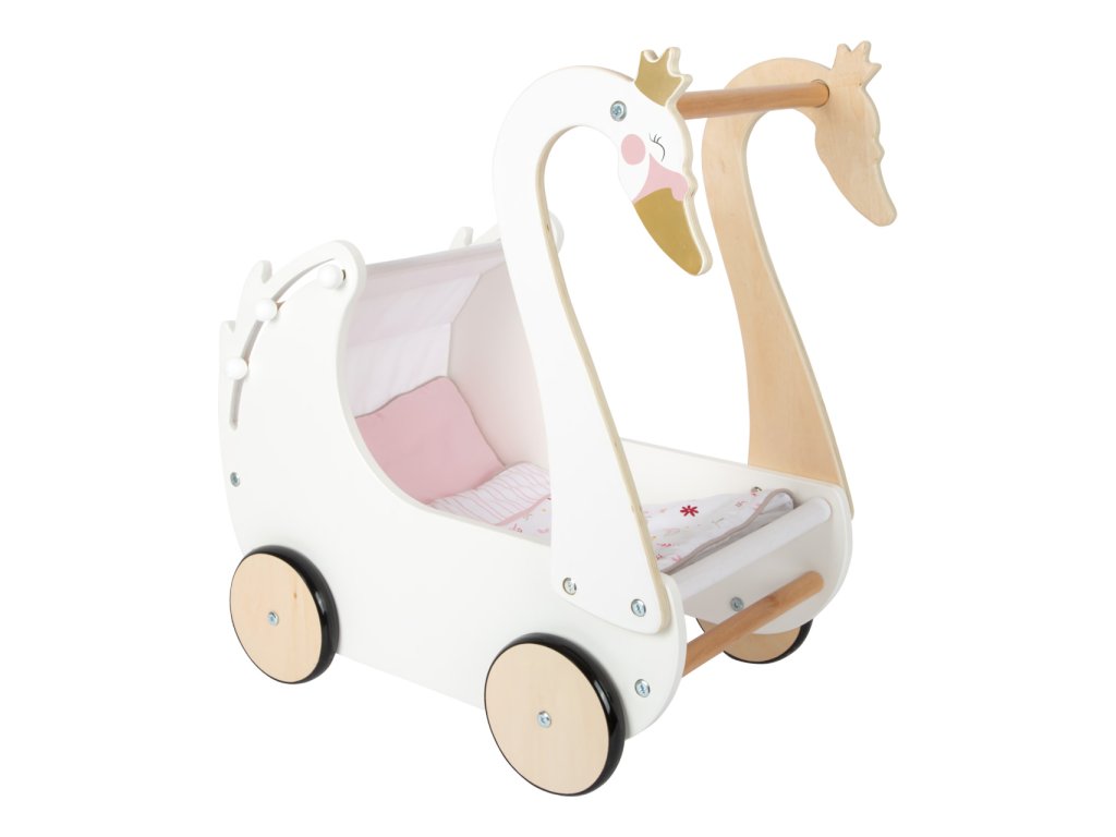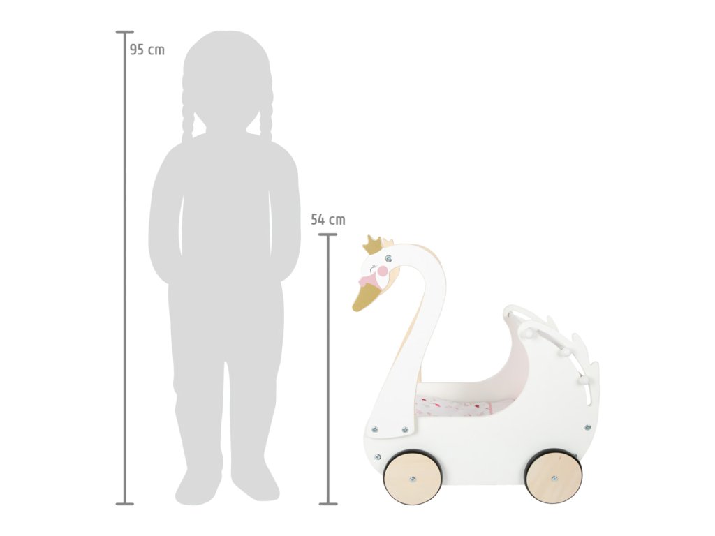 Pečujte o panenky s labutí elegancí! Nechejte děti rozvíjet fantazii a sociální dovednosti. Svou vytříbenou barevností a jednoduchými tvary kočárek hravě doplní každý dívčí pokoj. Pojme i panenky nadměrných velikostí, je vybaven stahovatelnou látkovou stříškou a dodáván s květovaným růžovo‑bílým ložním prádlem. Pogumovaná kolečka nabízí kultivovaný tichý chod na všech typech povrchů a šetří je. Konstrukce kombinuje odolnou překližku a na dotek zvláště příjemné masivní dřevo. Výrobek vyžaduje montáž, dodáváno s detailním návodem k sestavení. Hlavní vlastnosti: kočárek včetně ložního prádlapro panenky s výškou do 46 cmstahovatelná stříškatichý chododolné dřevěné provedení